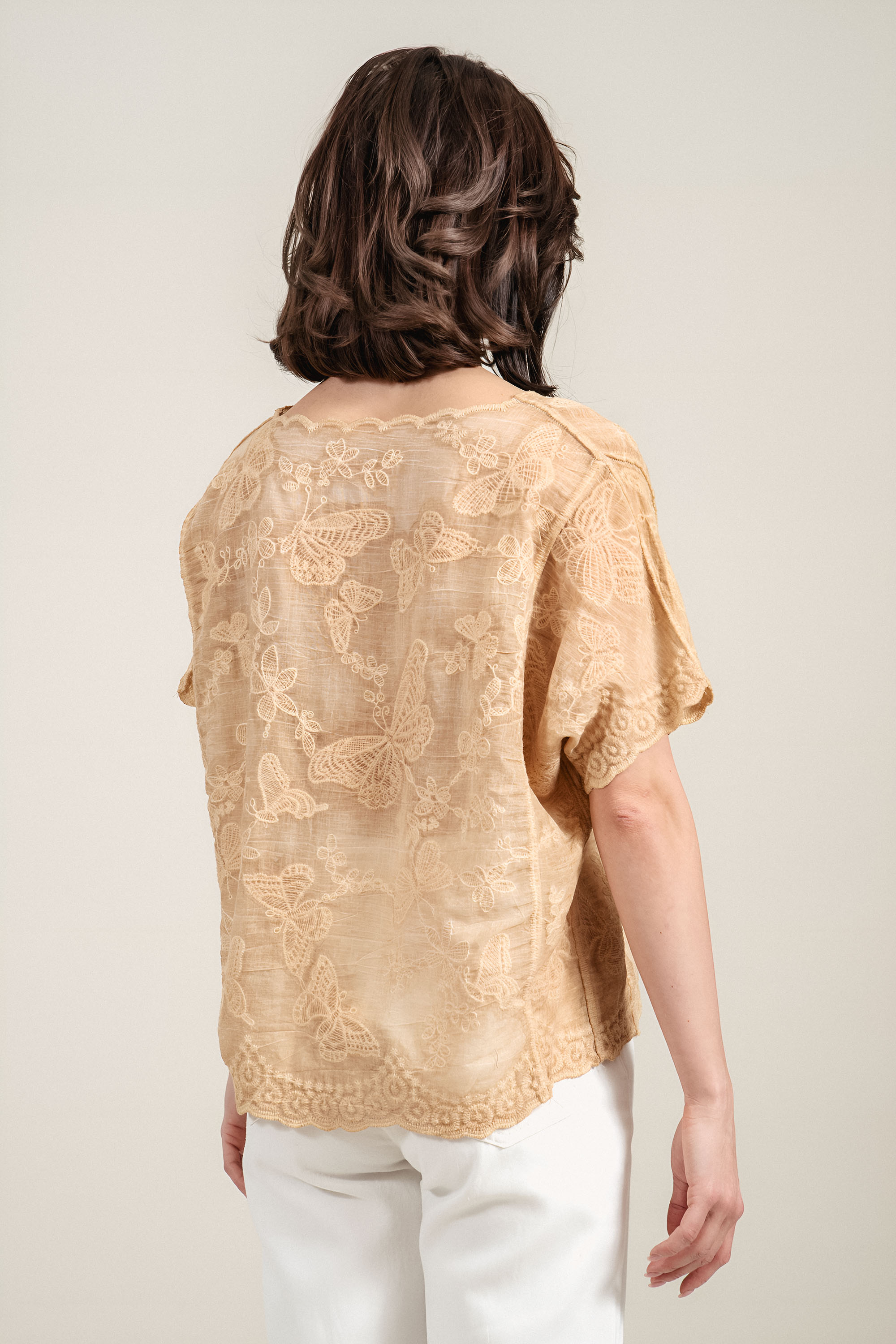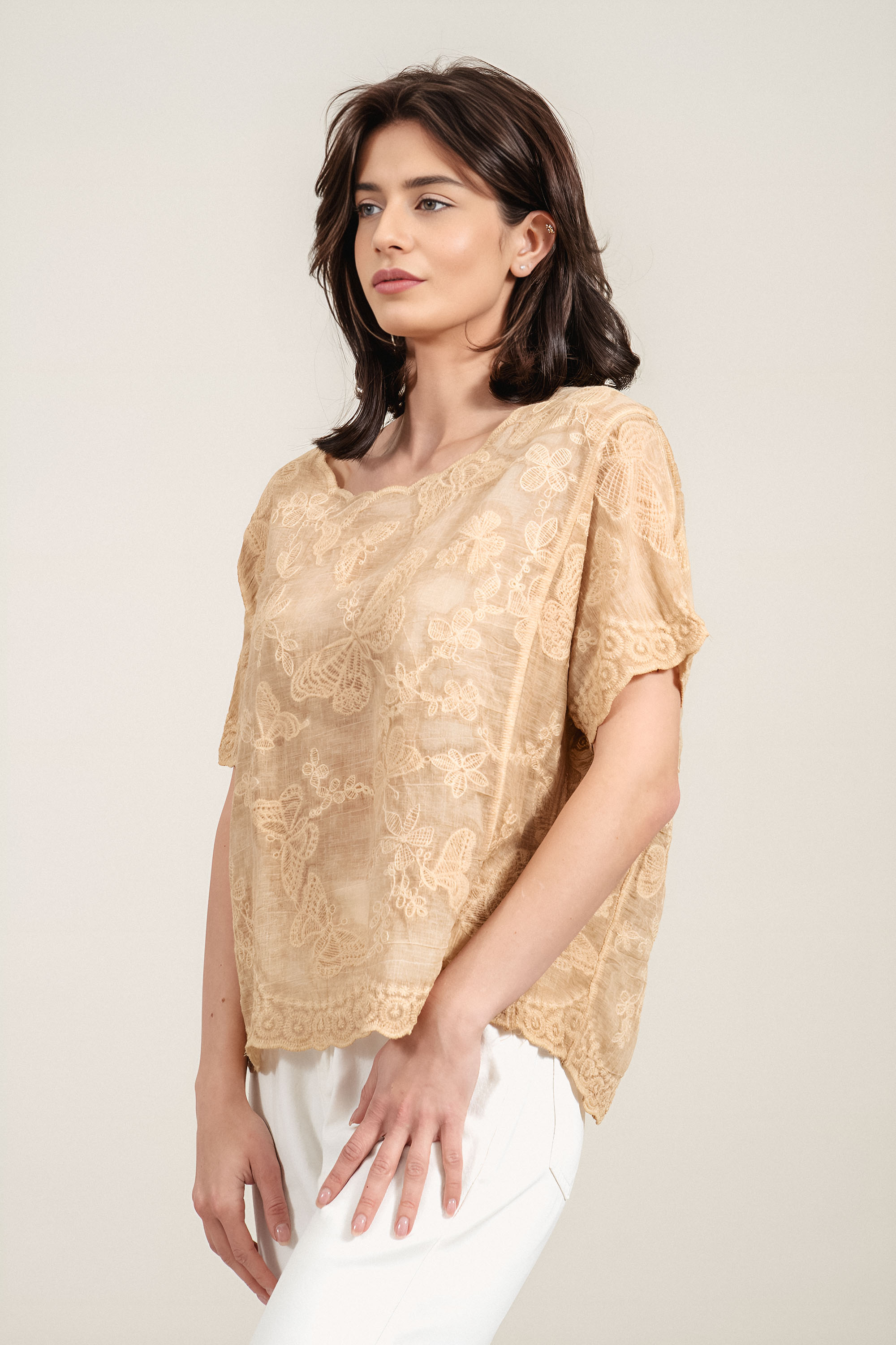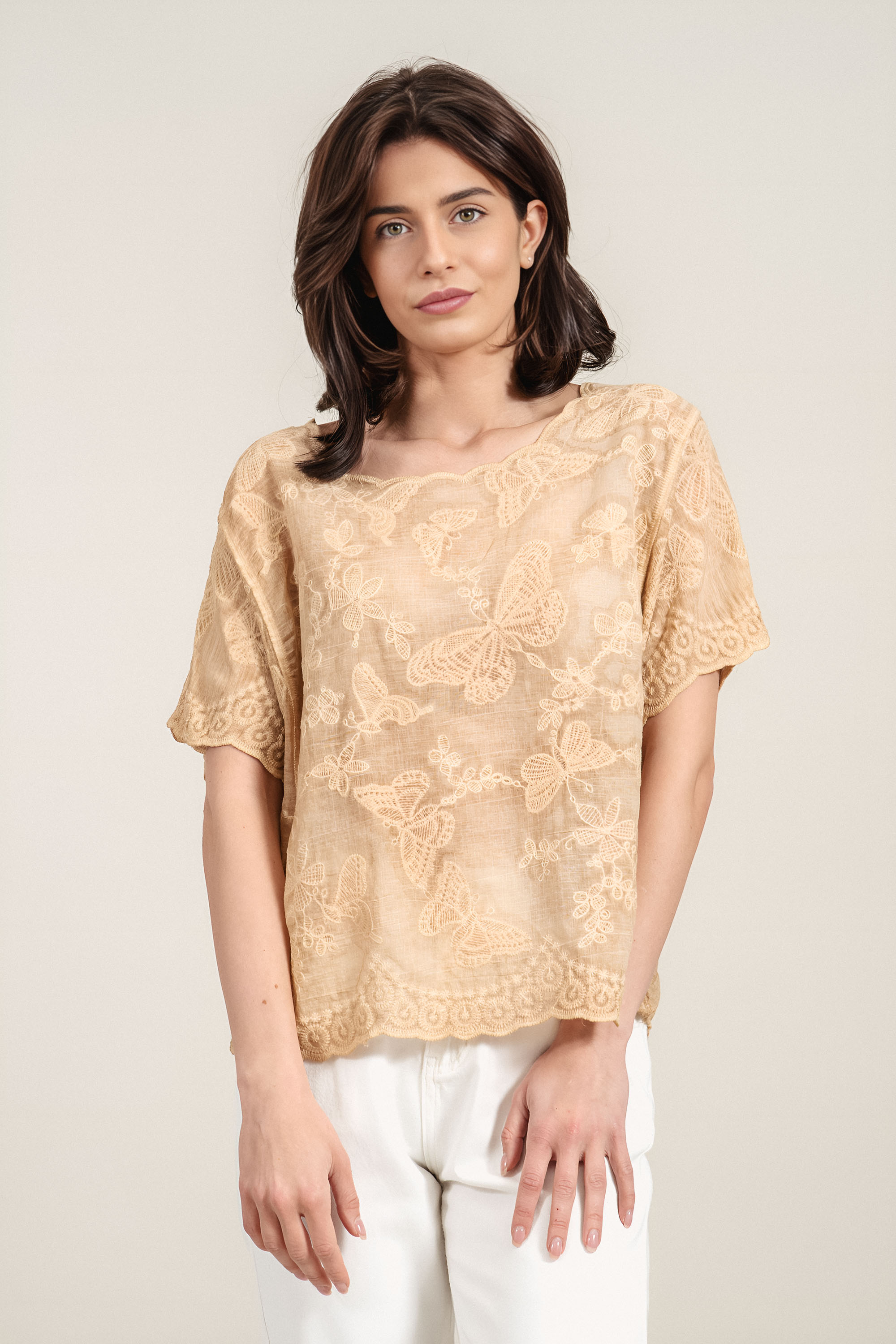 Елегантна блуза от памук с ефирно излъчване и деликатна бродерия с флорални мотиви и пеперуди. Свободната кройка осигурява комфорт през целия ден, а обло деколте придава мек и женствен силует. Материята е дишаща и подходяща за топлите сезони. Моделът се комбинира лесно с панталони или дънки за стилна ежедневна визия.
