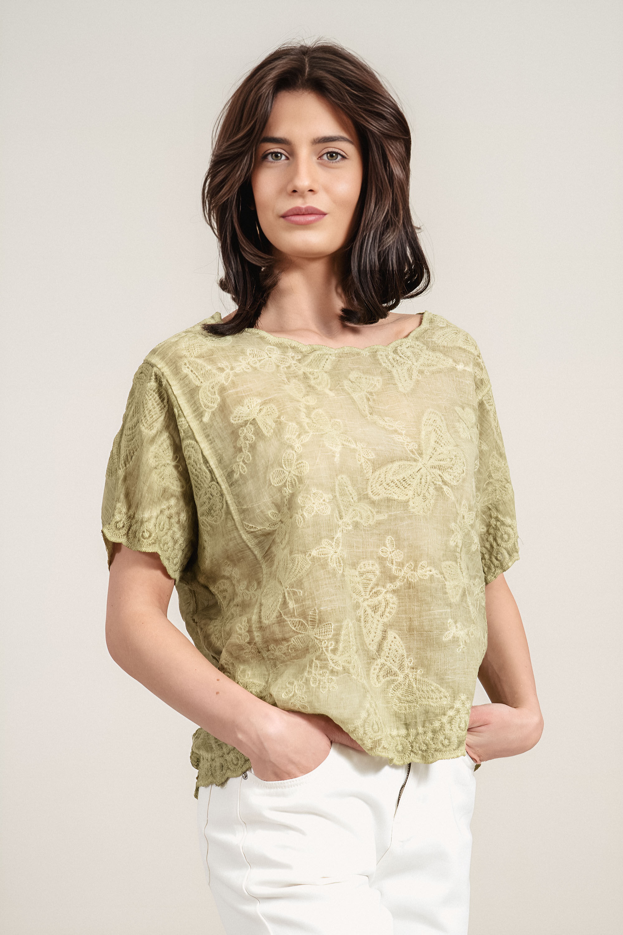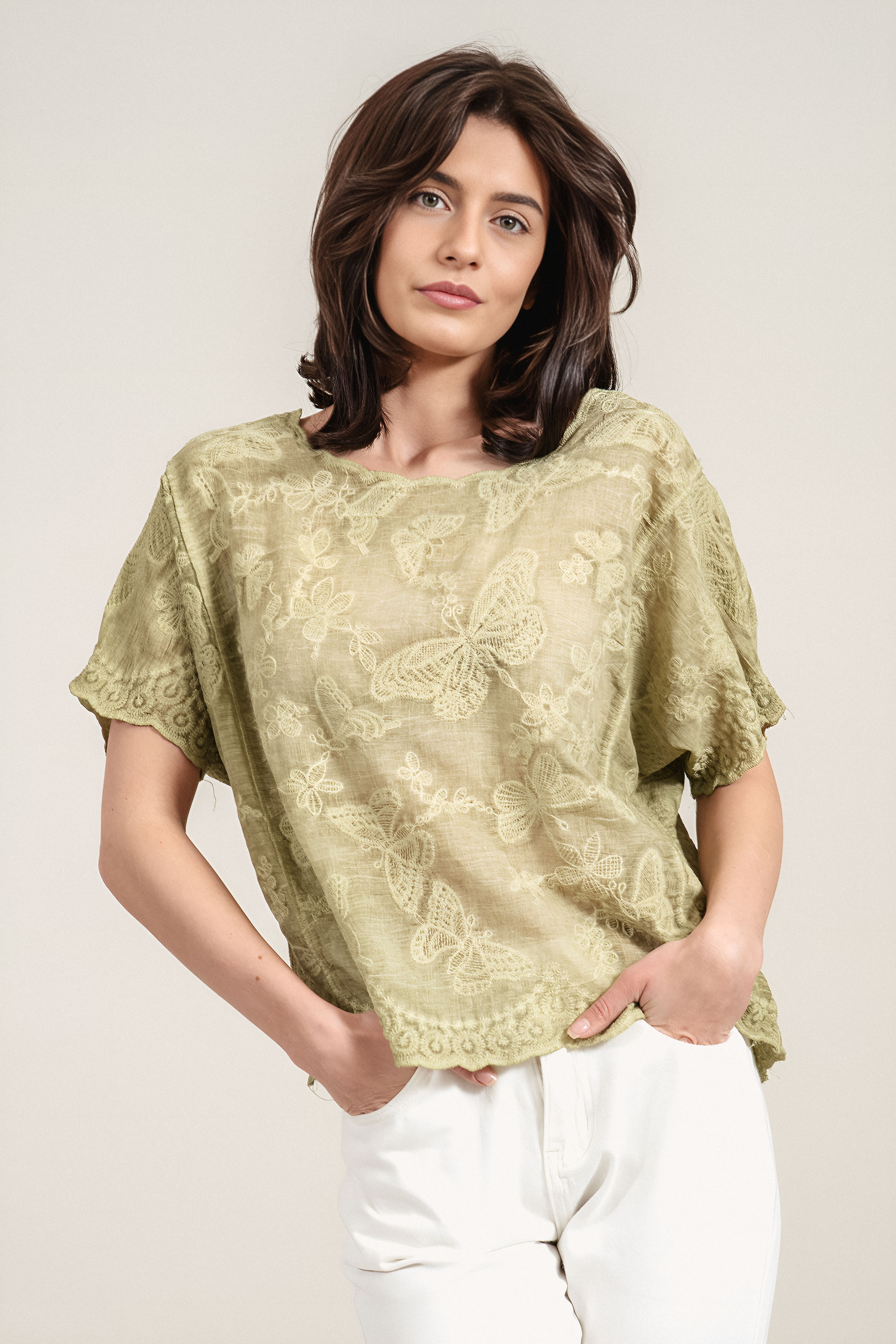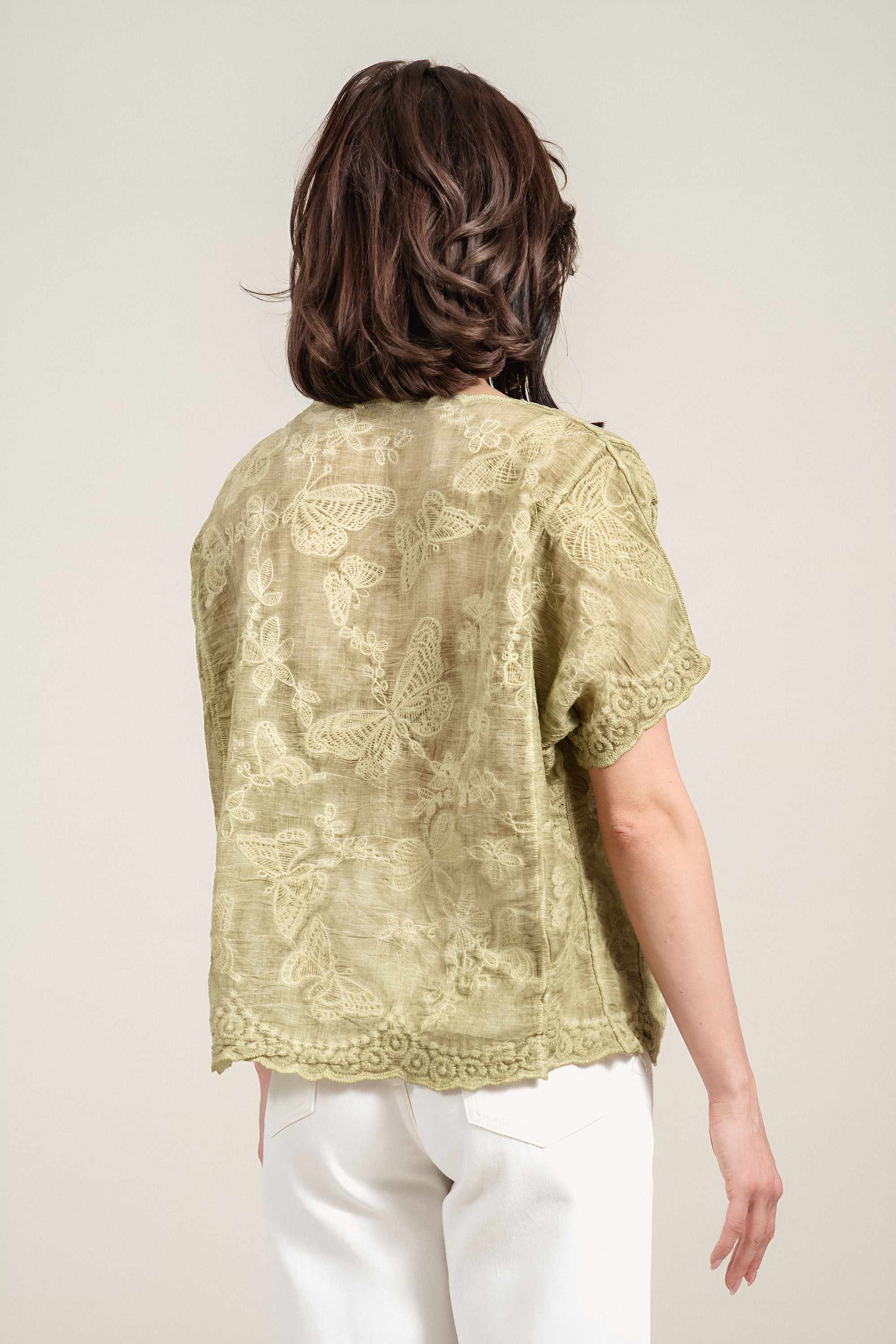 Елегантна блуза от памук с ефирно излъчване и деликатна бродерия с флорални мотиви и пеперуди. Свободната кройка осигурява комфорт през целия ден, а обло деколте придава мек и женствен силует. Материята е дишаща и подходяща за топлите сезони. Моделът се комбинира лесно с панталони или дънки за стилна ежедневна визия.