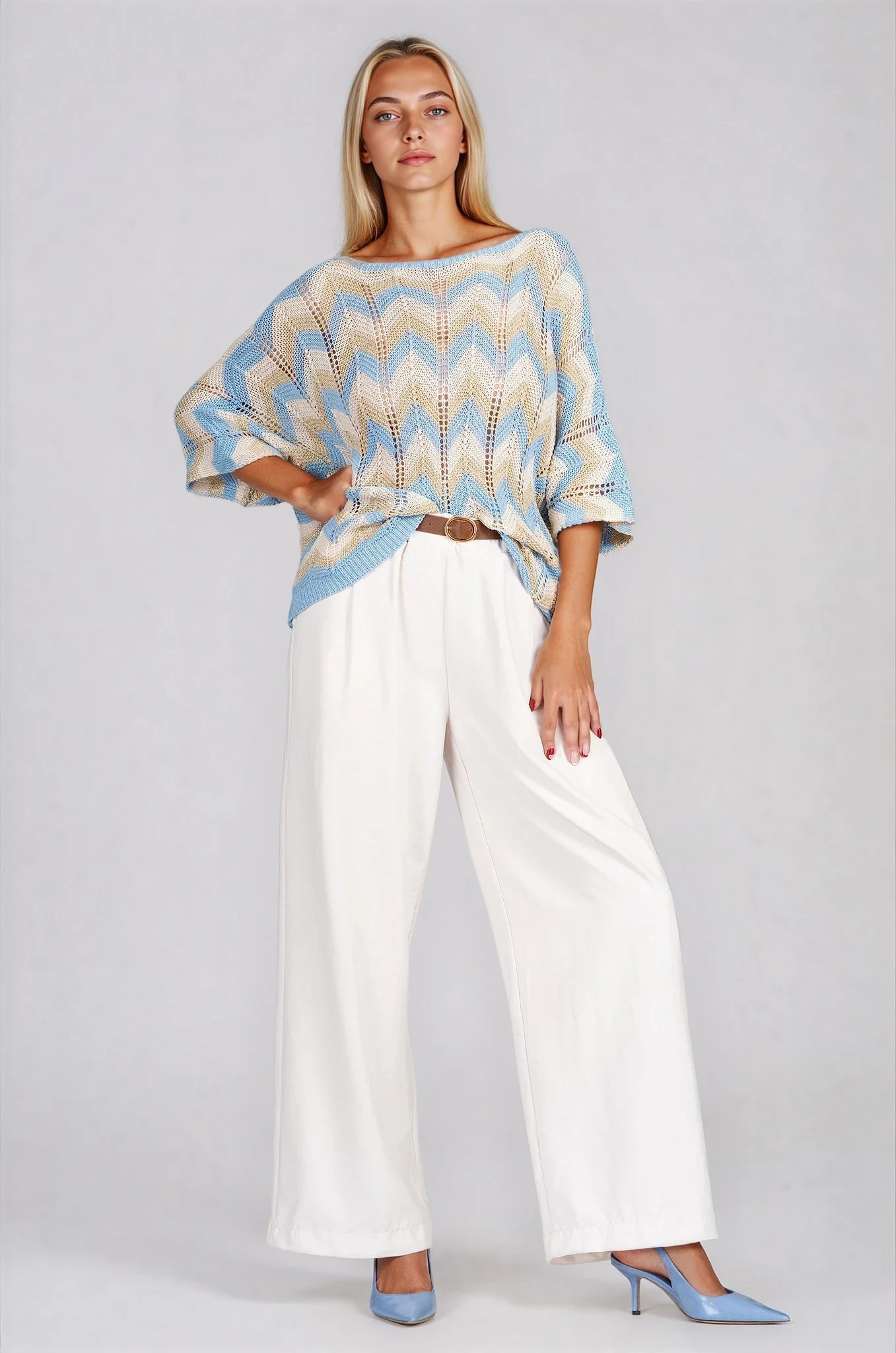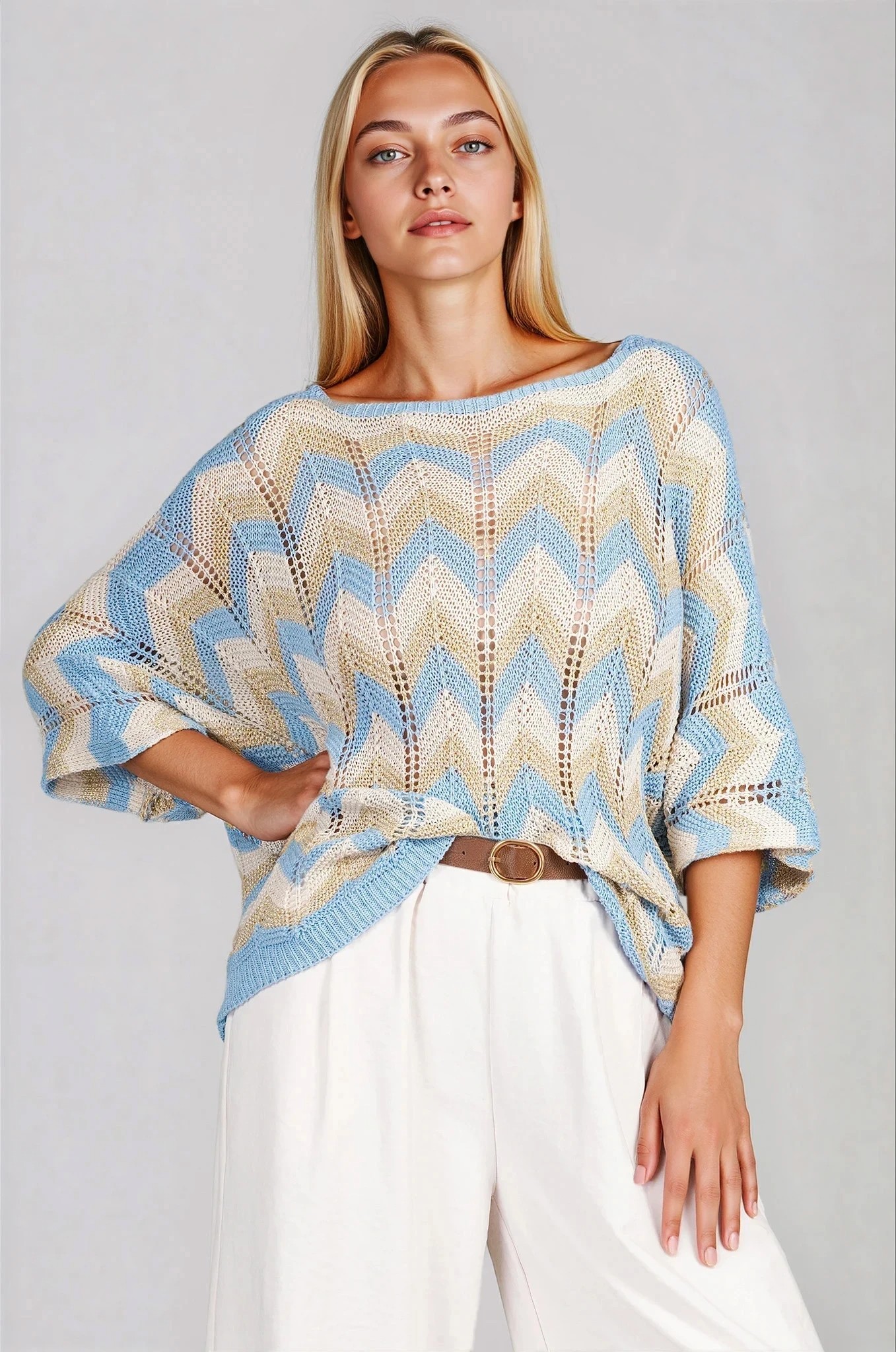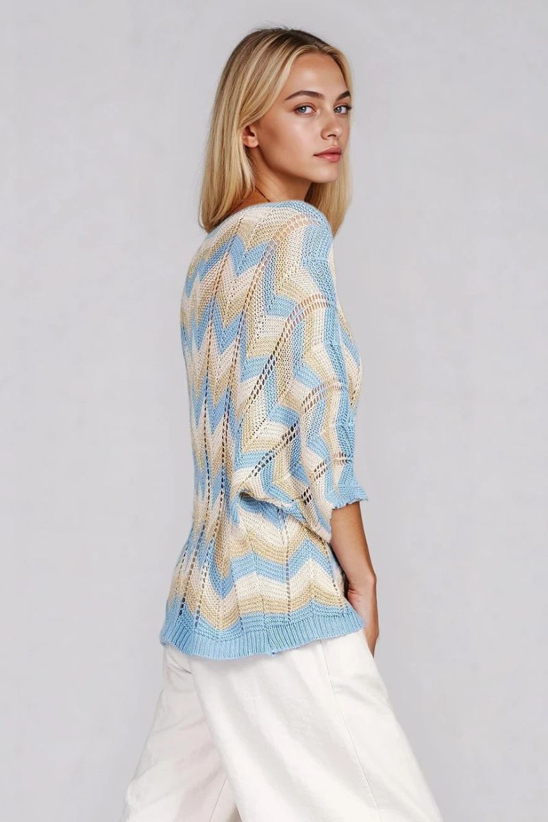 Ефектен зиг-заг принт в синьо и бежово придава динамика и модерно излъчване на този плетен модел. Фината плетена структура осигурява лекота и комфорт, като позволява на кожата да диша благодарение на съдържанието на памук. Свободната кройка и 7/8 ръкавът създават балансиран силует, подходящ както за ежедневието, така и за по-елегантни комбинации. Произведена в Италия, блузата носи усещане за качество и внимание към детайла.