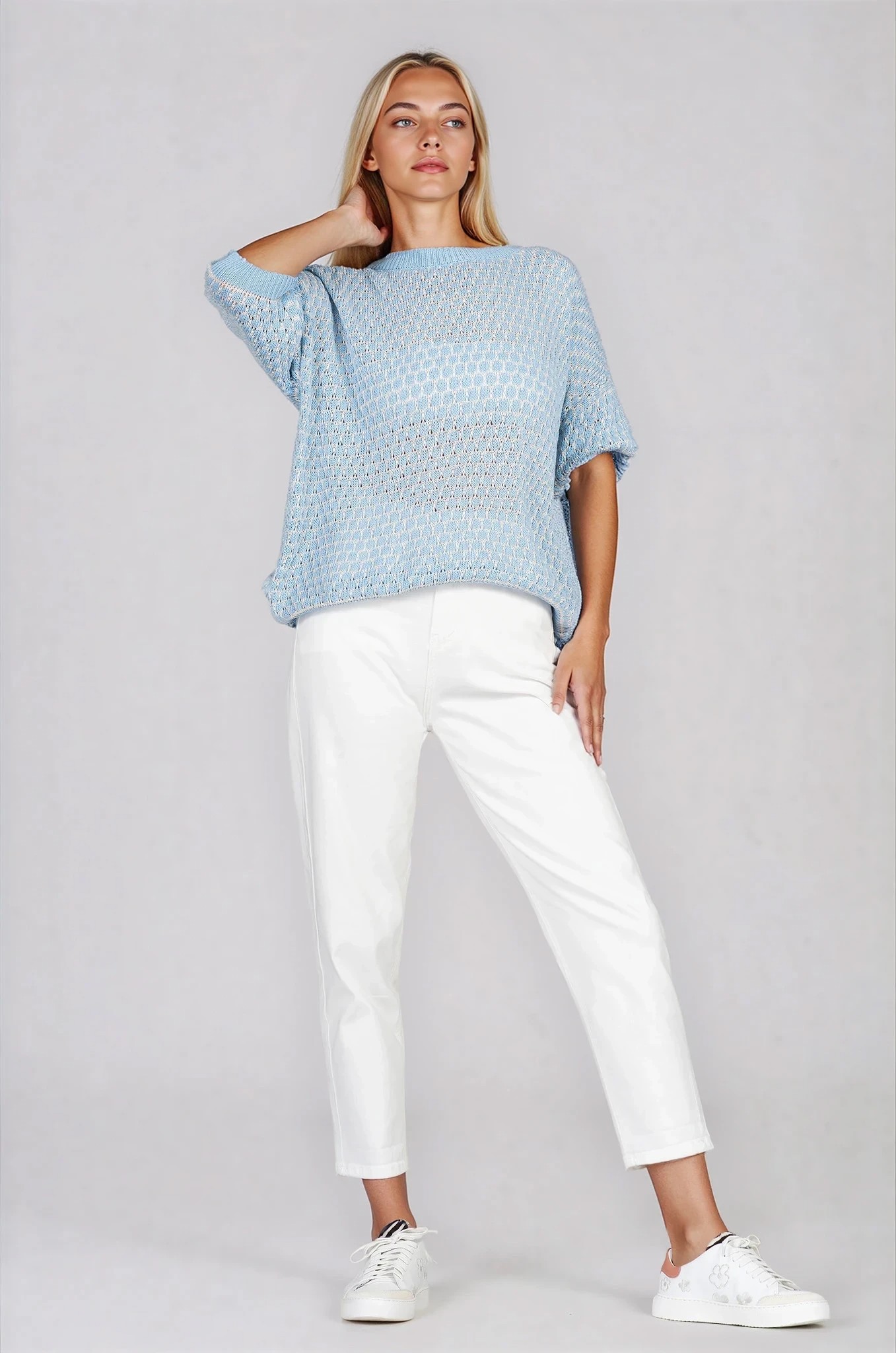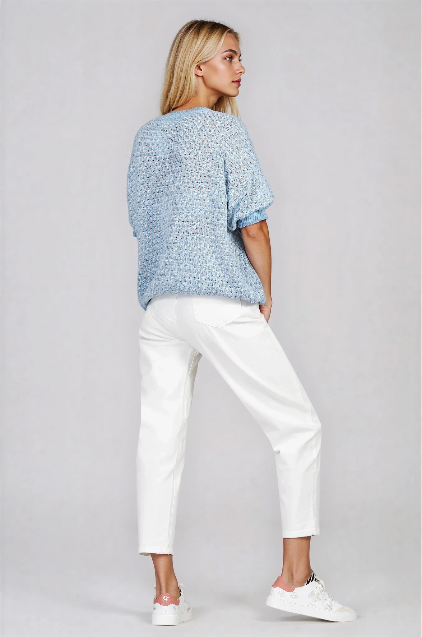 Свеж модел от фино плетиво в нежно син нюанс, създаден за комфорт и лекота през пролетно-летния сезон. Релефната плетка с два цвята придава деликатна структура и визуален интерес на силуета. Свободната линия и падналият къс ръкав осигуряват удобство и естествено движение. Благодарение на съдържанието на памук, материята е дишаща и приятна при допир. Произведена в Италия, туниката съчетава качество и непреходен стил.