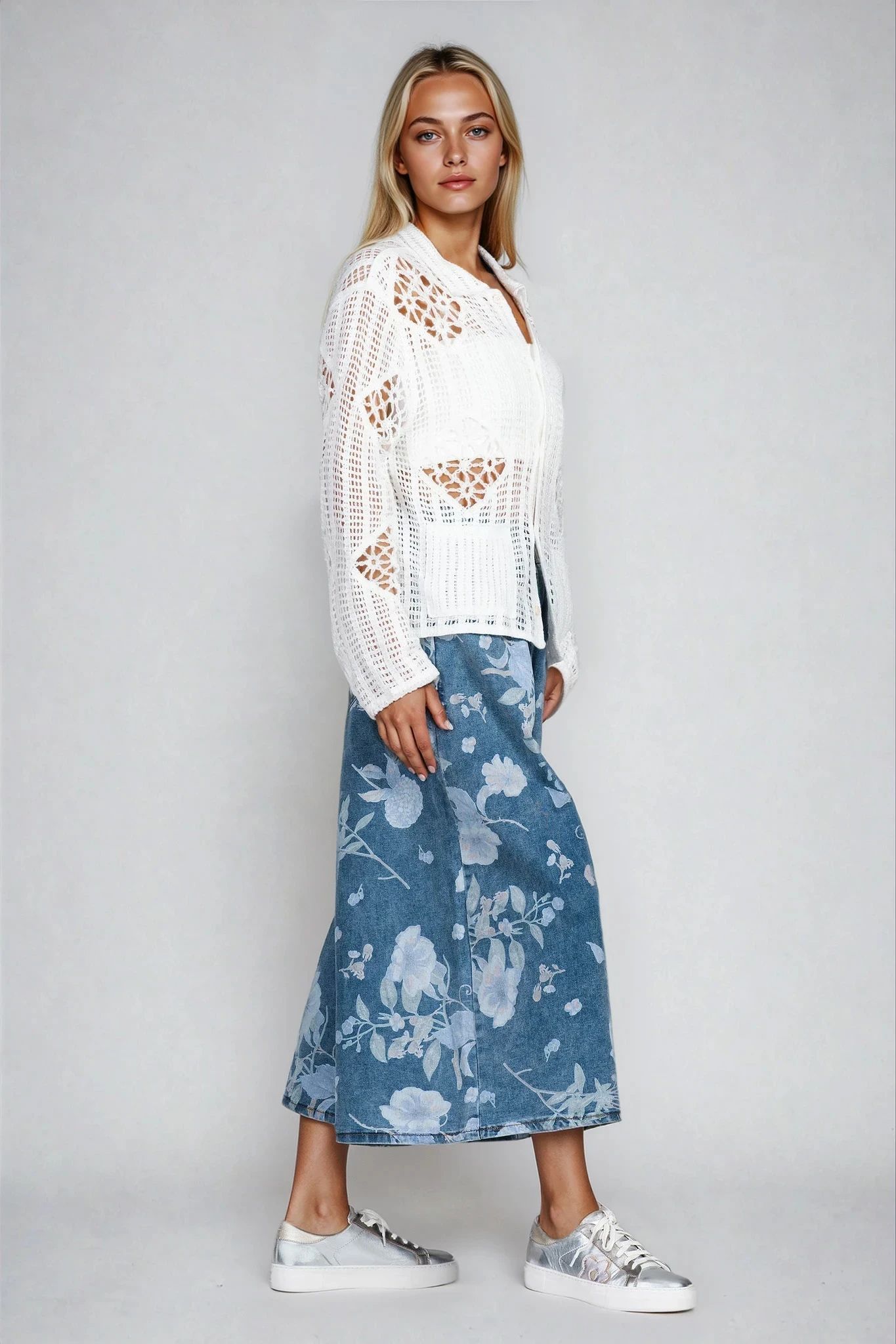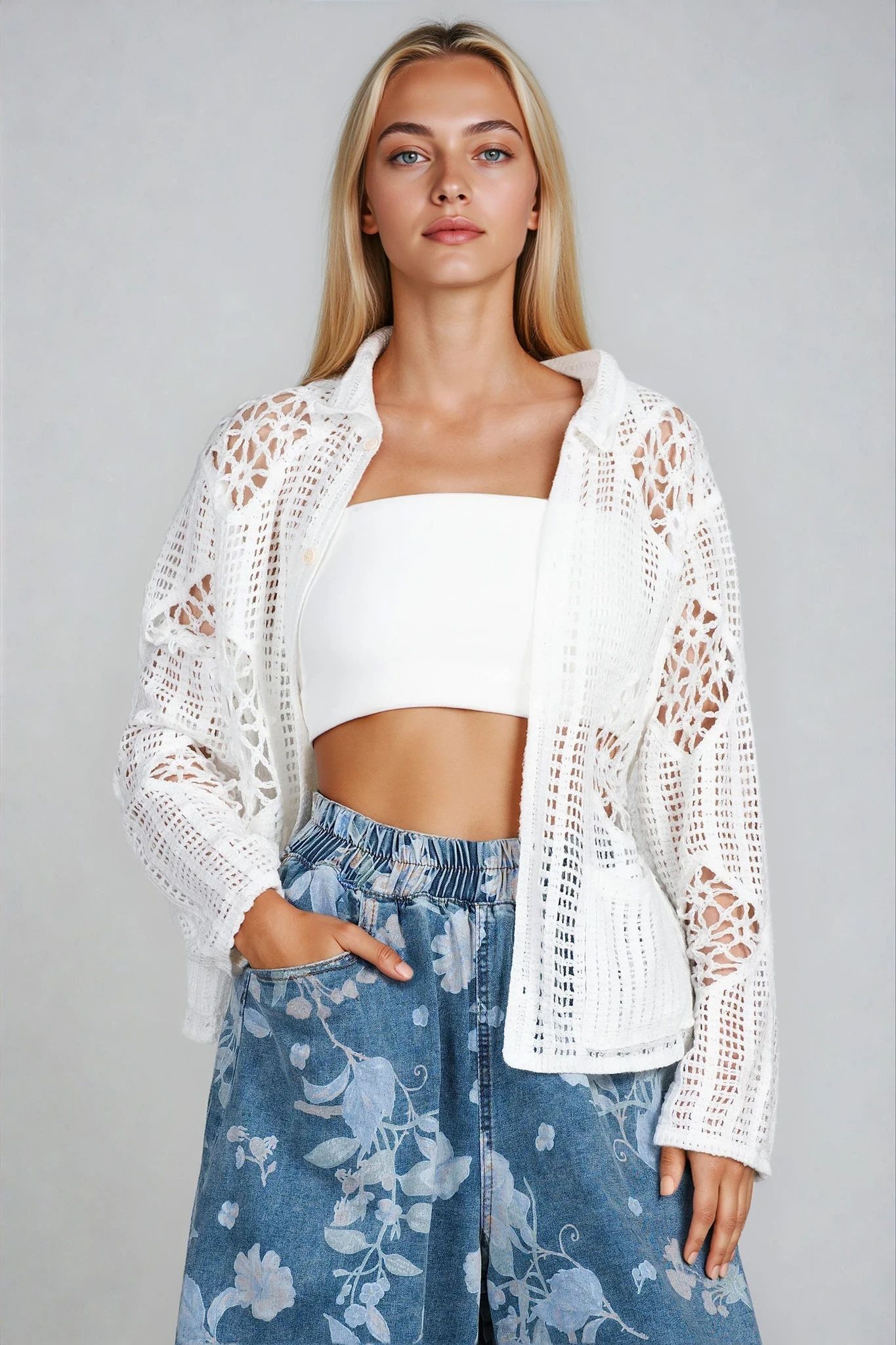 Тази жилетка в бял цвят впечатлява с мека плетка тип мрежа. Яката и предните джобове добавят функционалност и стил, докато копчетата ѝ придават завършен вид. Перфектна за пролетно-летните дни, съчетава се добре с топ и деним.
