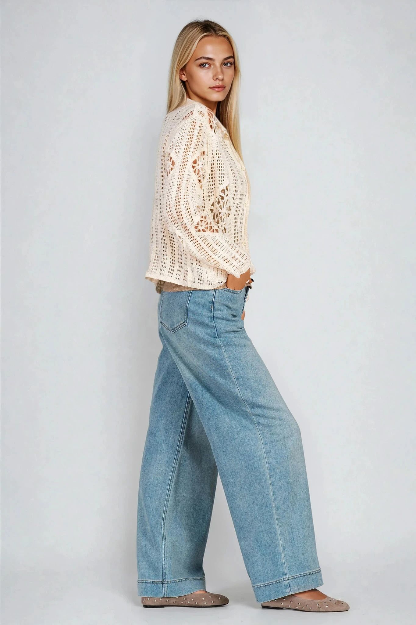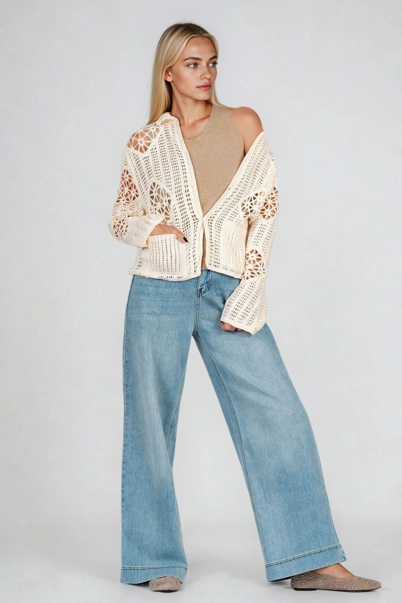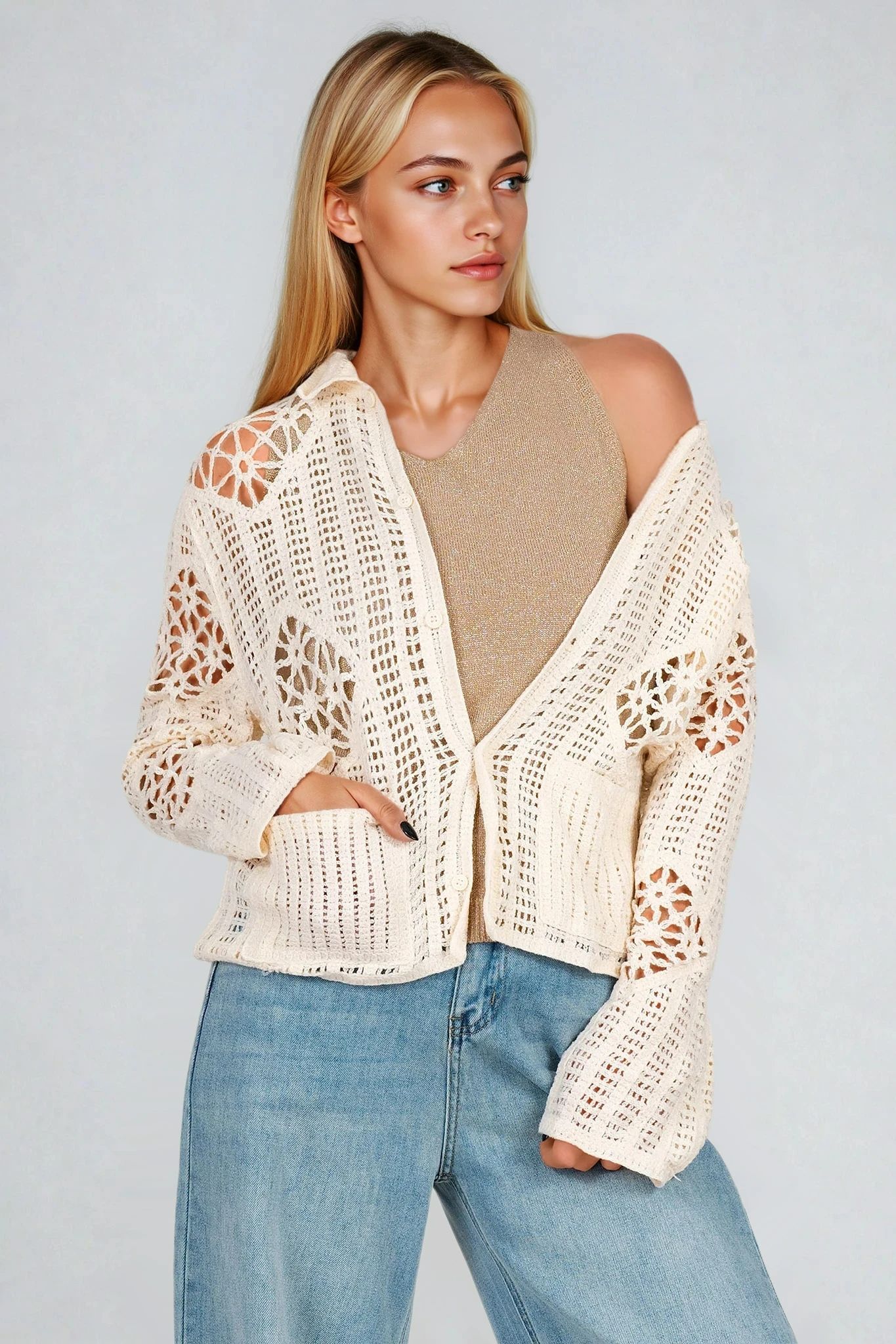 Тази жилетка в цвят екрю впечатлява с мека плетка тип мрежа. Яката и предните джобове добавят функционалност и стил, докато копчетата ѝ придават завършен вид. Перфектна за пролетно-летните дни, съчетава се добре с топ и деним.