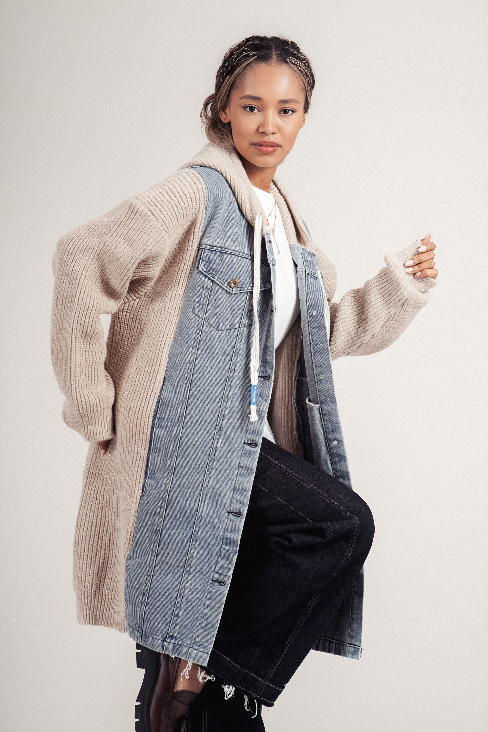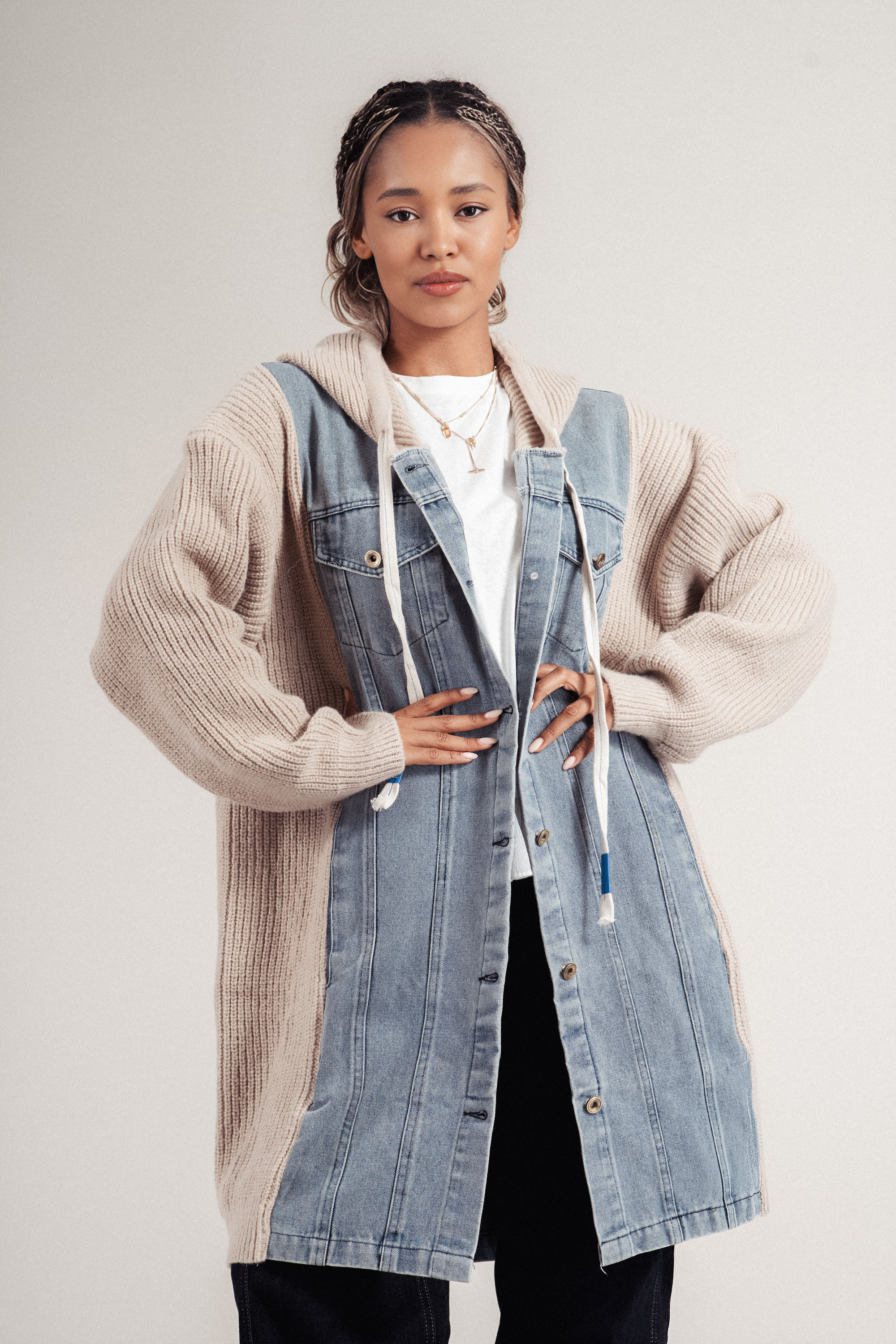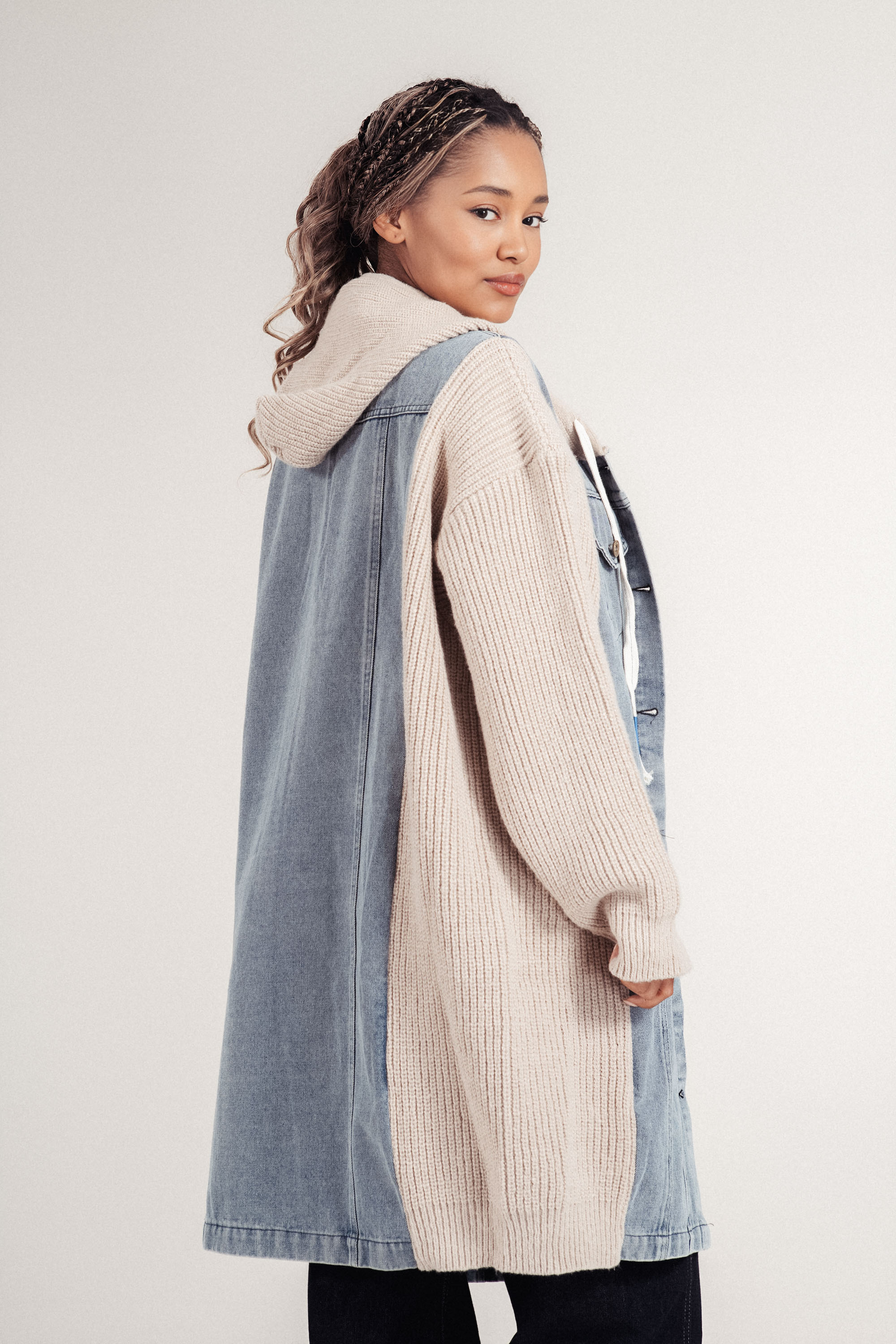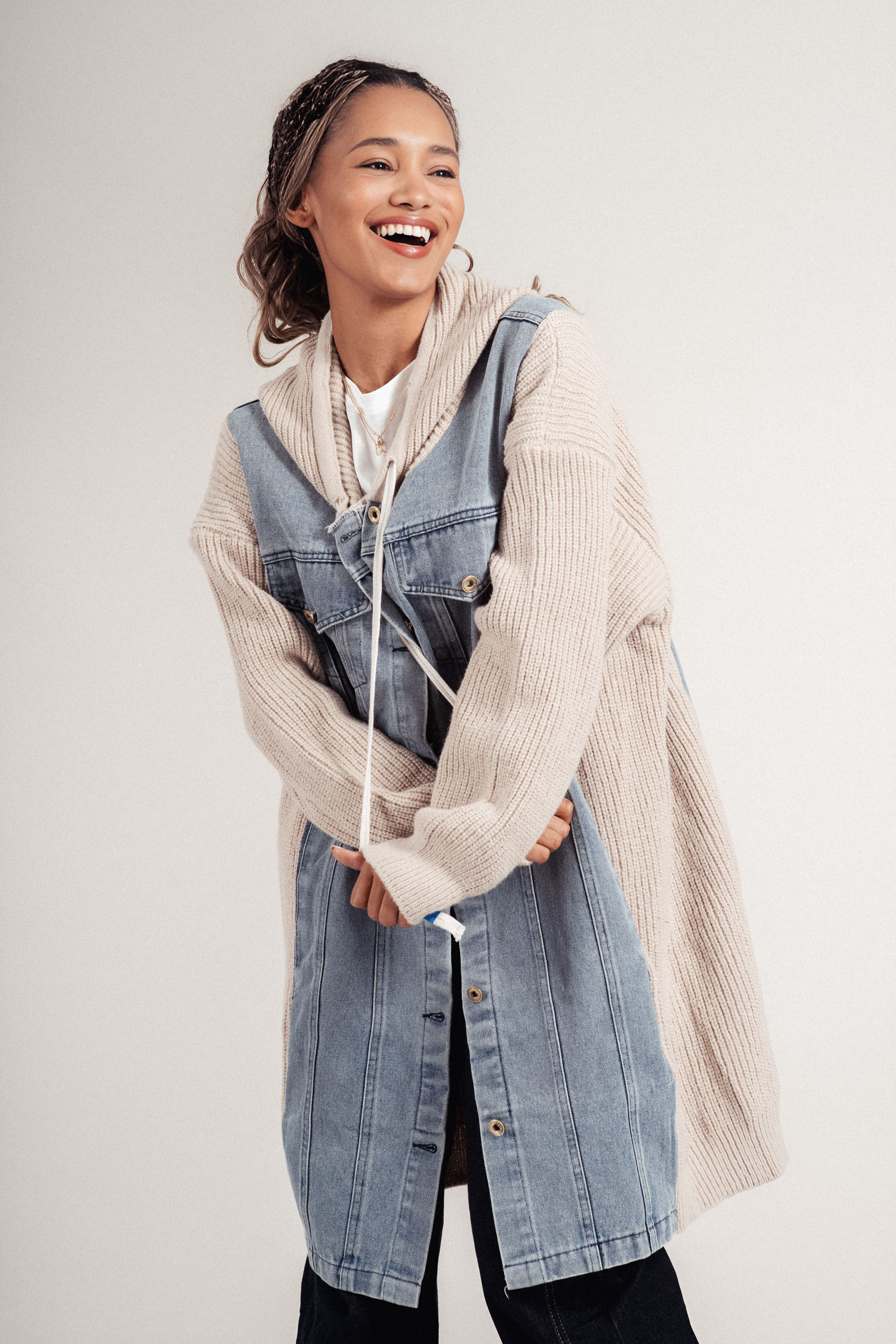 Уникална плетена жилетка в бежов цвят с дънкови панели отпред и удобна качулка. Моделът съчетава мекота и комфорт с модерна визия. Има джобове с капак и метални копчета, които подчертават градския стил. Подходяща за ежедневието и прохладните дни.