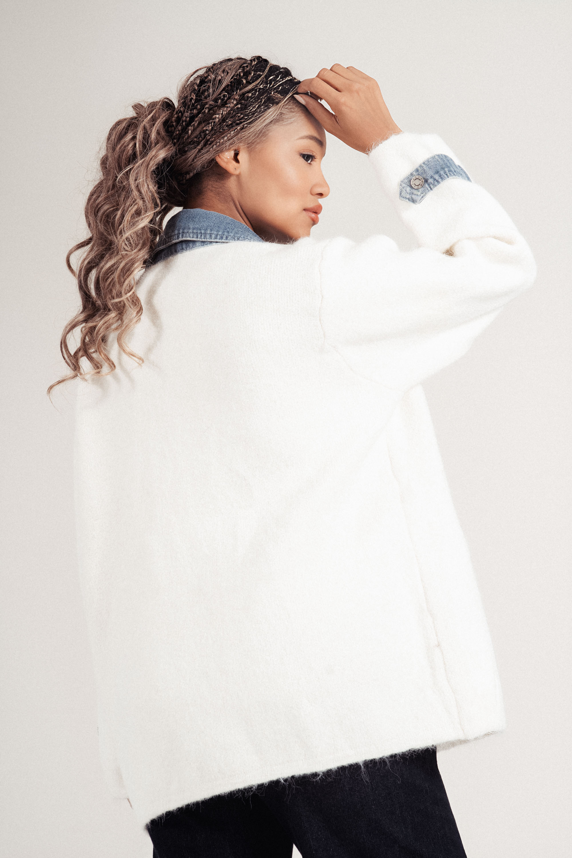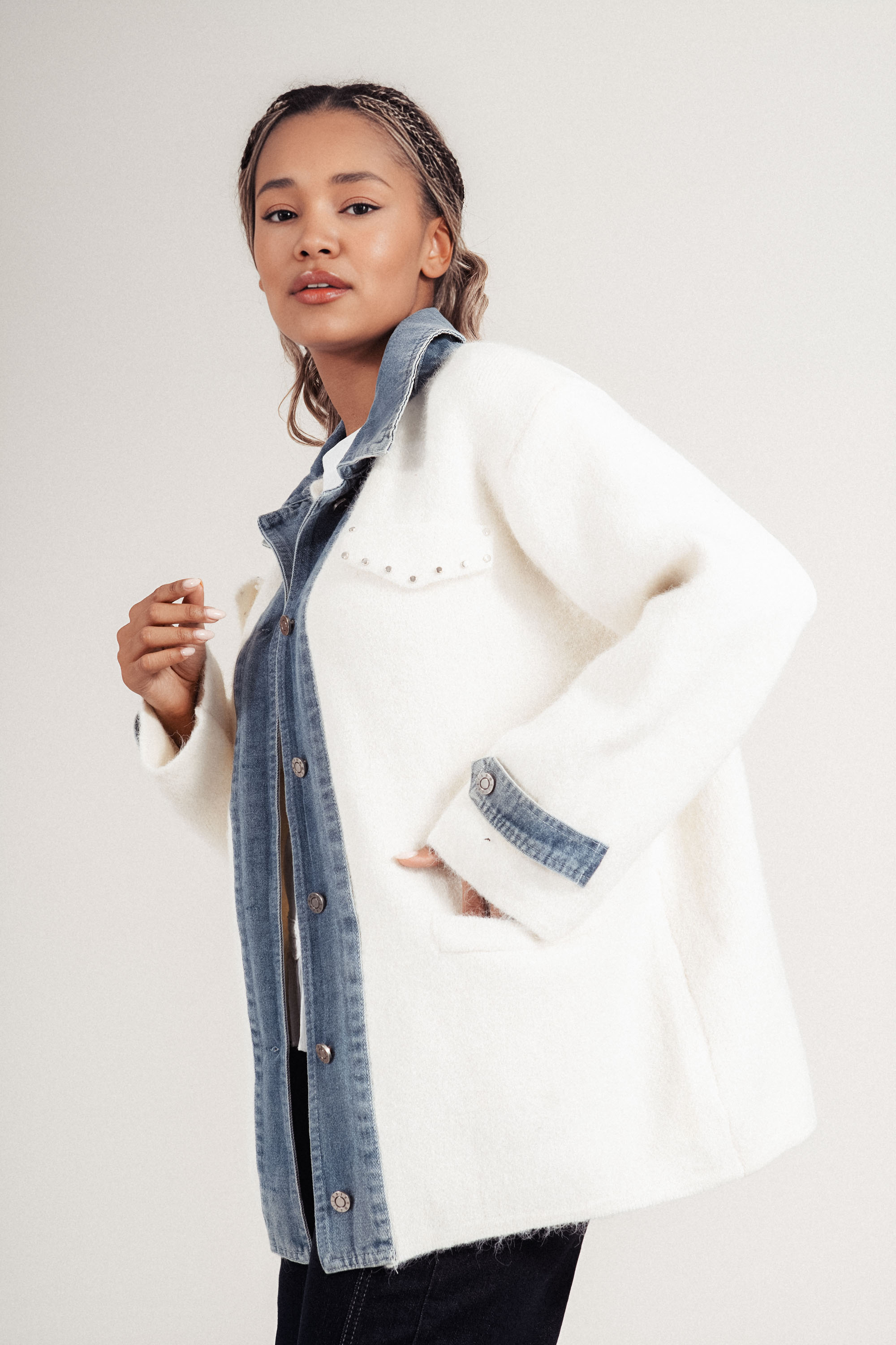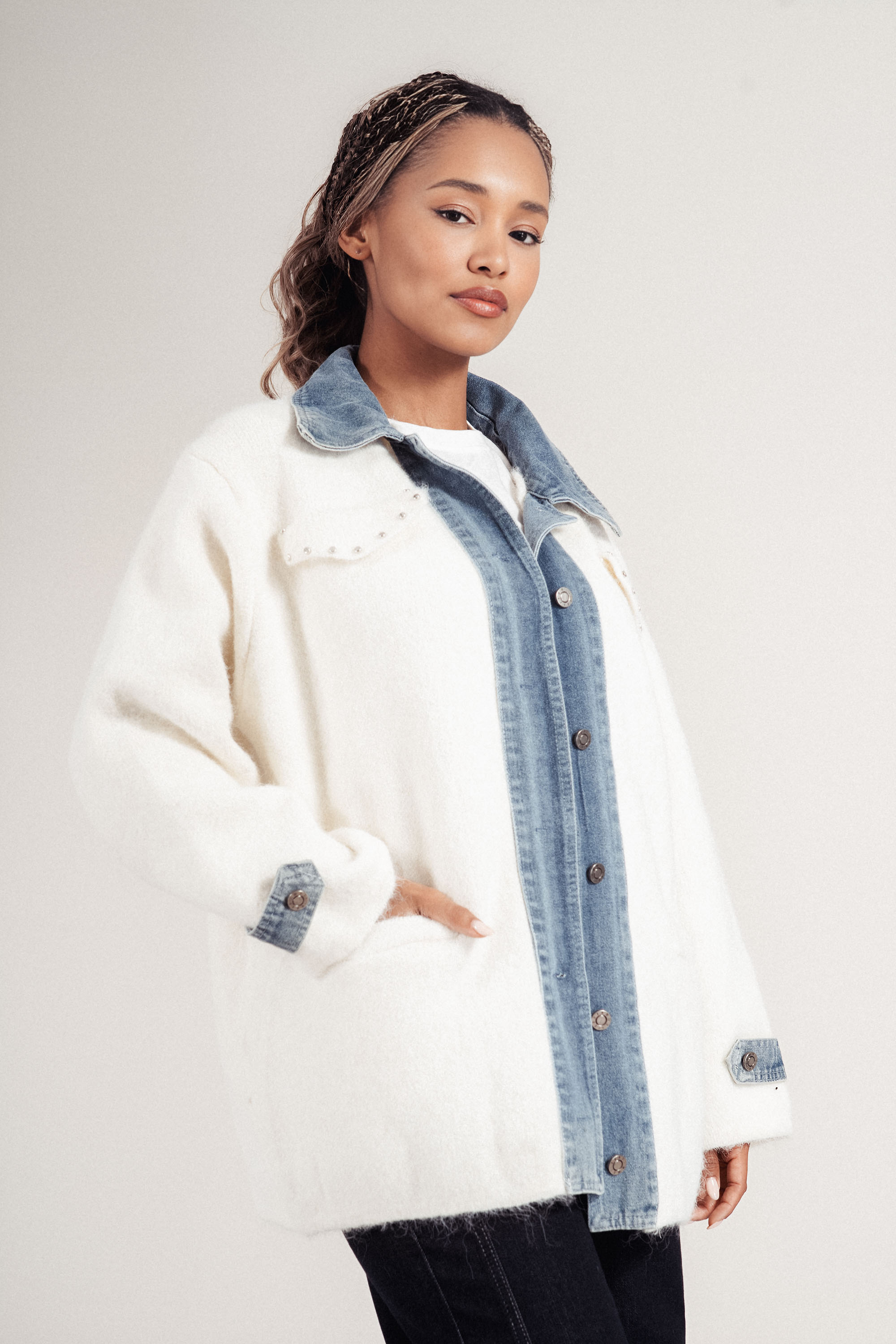 Стилна и функционална жилетка, съчетаваща деним в светлосиньо и светло плетиво. Акцентите включват декоративни камъни по джобовете. Моделът е без яка, с прав силует и меко усещане при носене. Подходяща за ежедневен градски стил или неформални събития.