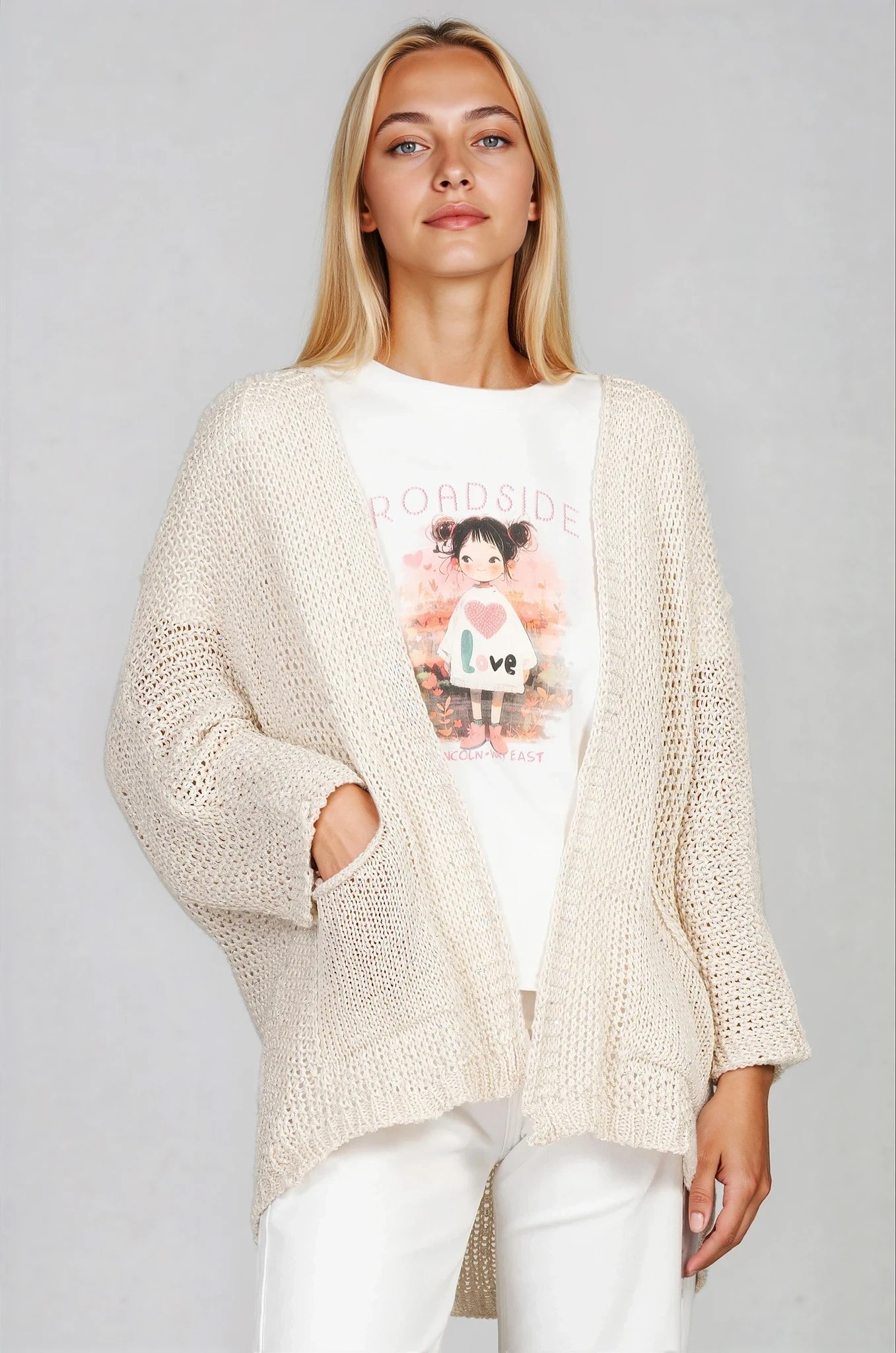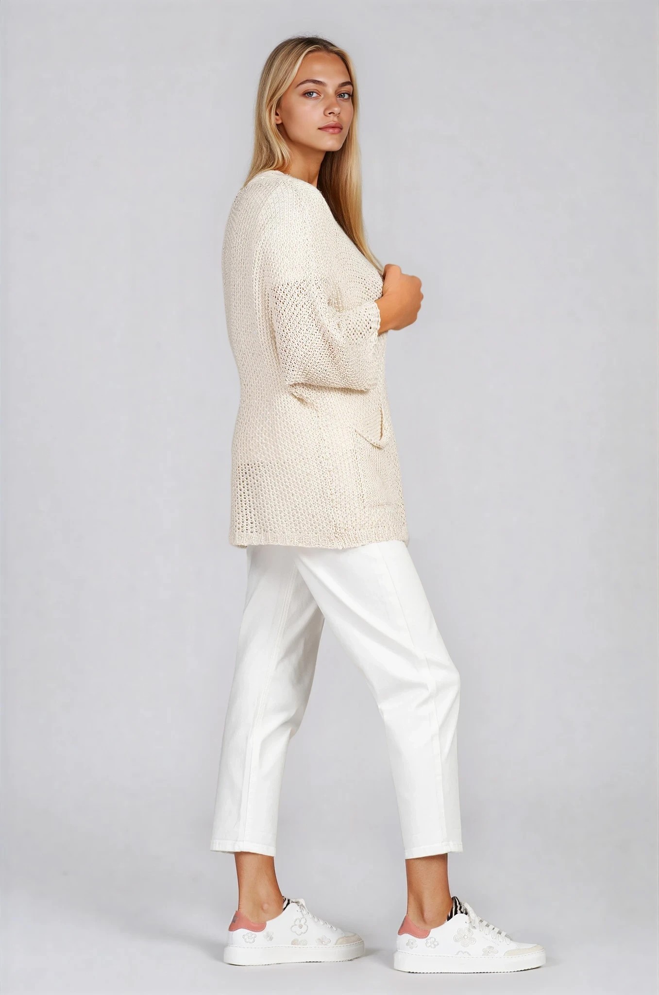 Свеж акцент в гардероба с тази едноцветна жилетка в светлобежов нюанс. Изработена от едро плетиво с памучно съдържание, тя осигурява комфорт, лекота и естествена проветривост през преходните сезони. Свободният силует и отвореният дизайн позволяват лесно комбиниране с тениска, топ или риза. Италианската изработка гарантира внимание към детайла и качество при всяко носене. Подходящ избор за ежедневни визии с деним или светли панталони.