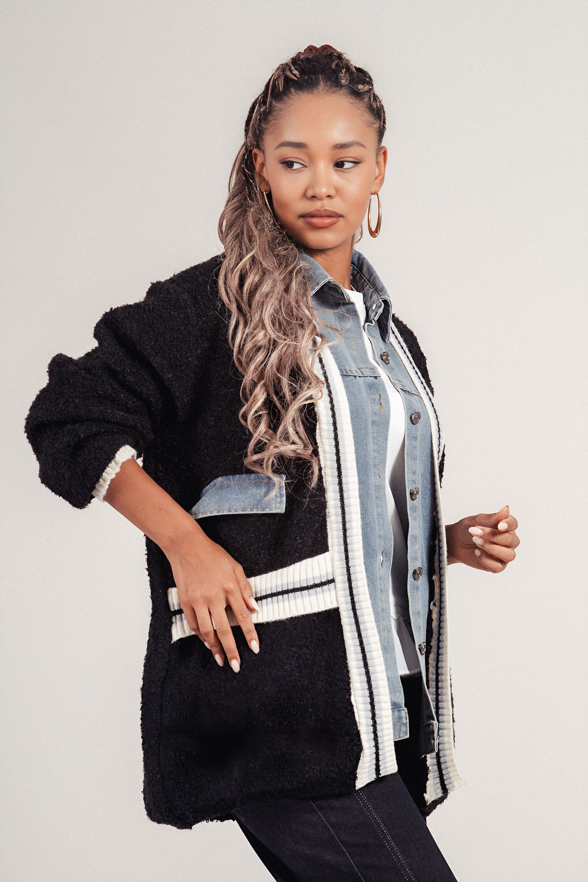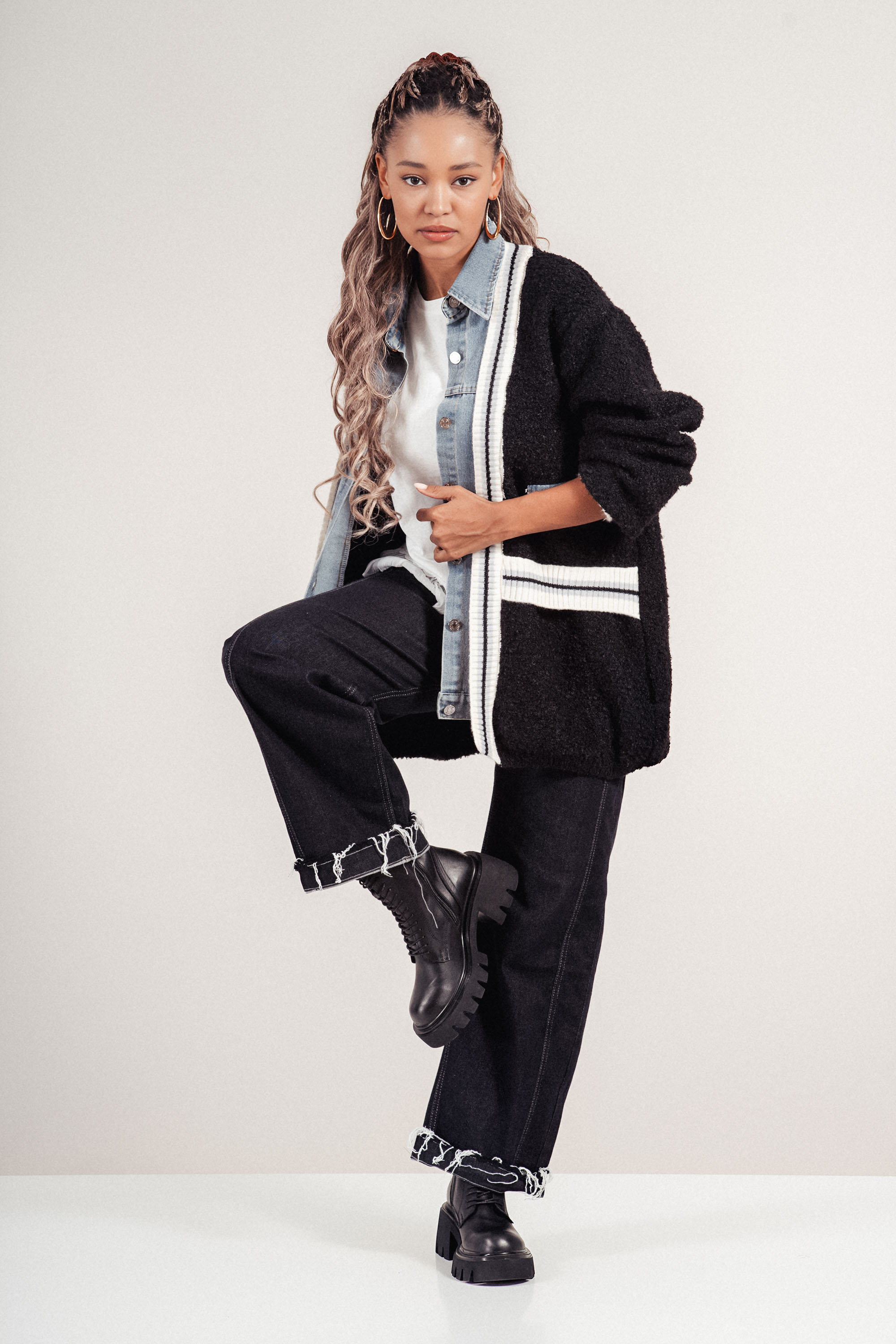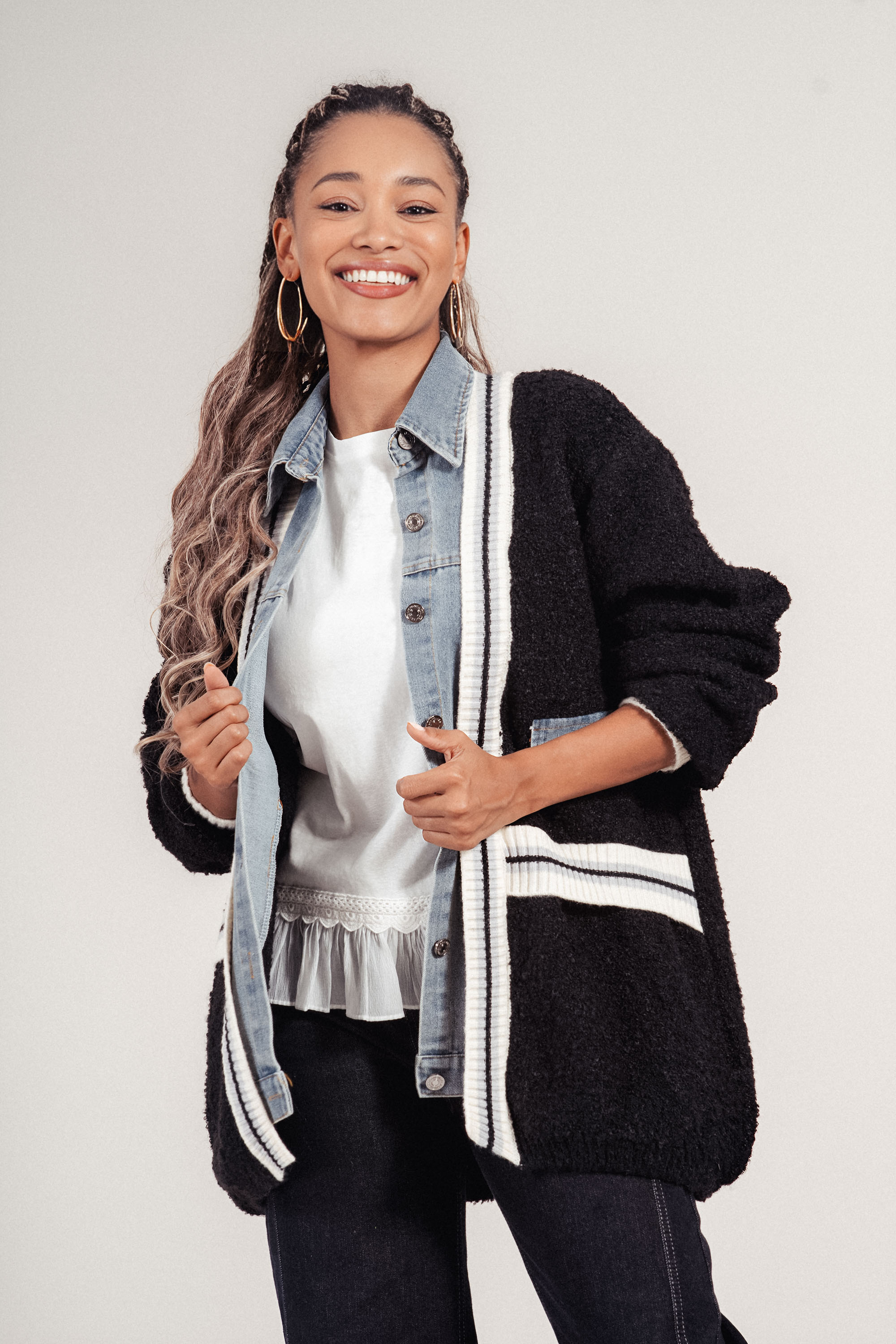 Стилна и топла плетена жилетка в черно с контрастни дънкови детайли по яката и предната част. Моделът е с комфортна свободна кройка, копчета и два джоба. Перфектна за есенно-зимния сезон – комбинира усещането за уют с модерна визия.