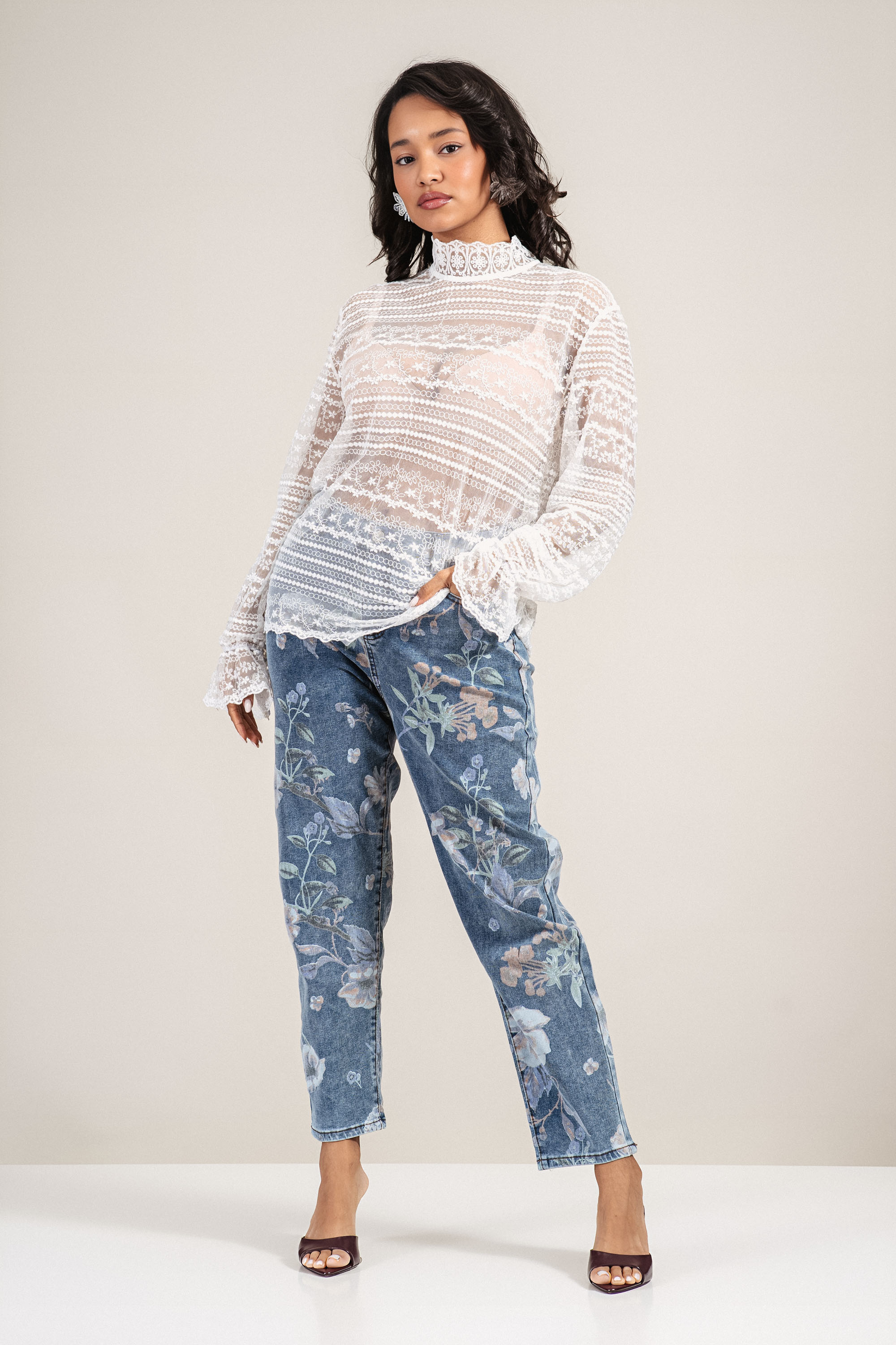 Дамска прозрачна дантелена блуза в бяло с нежна бродерия
