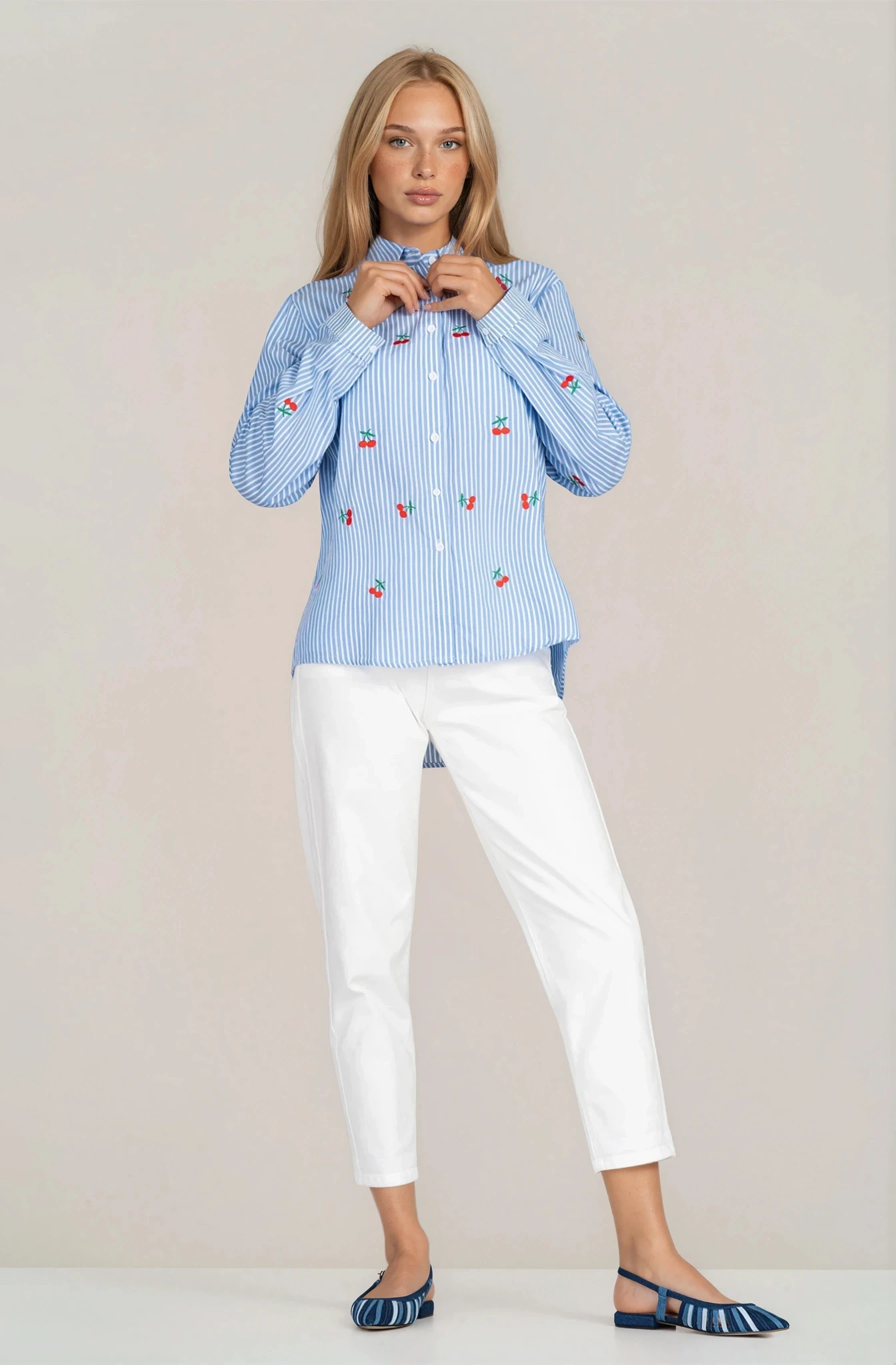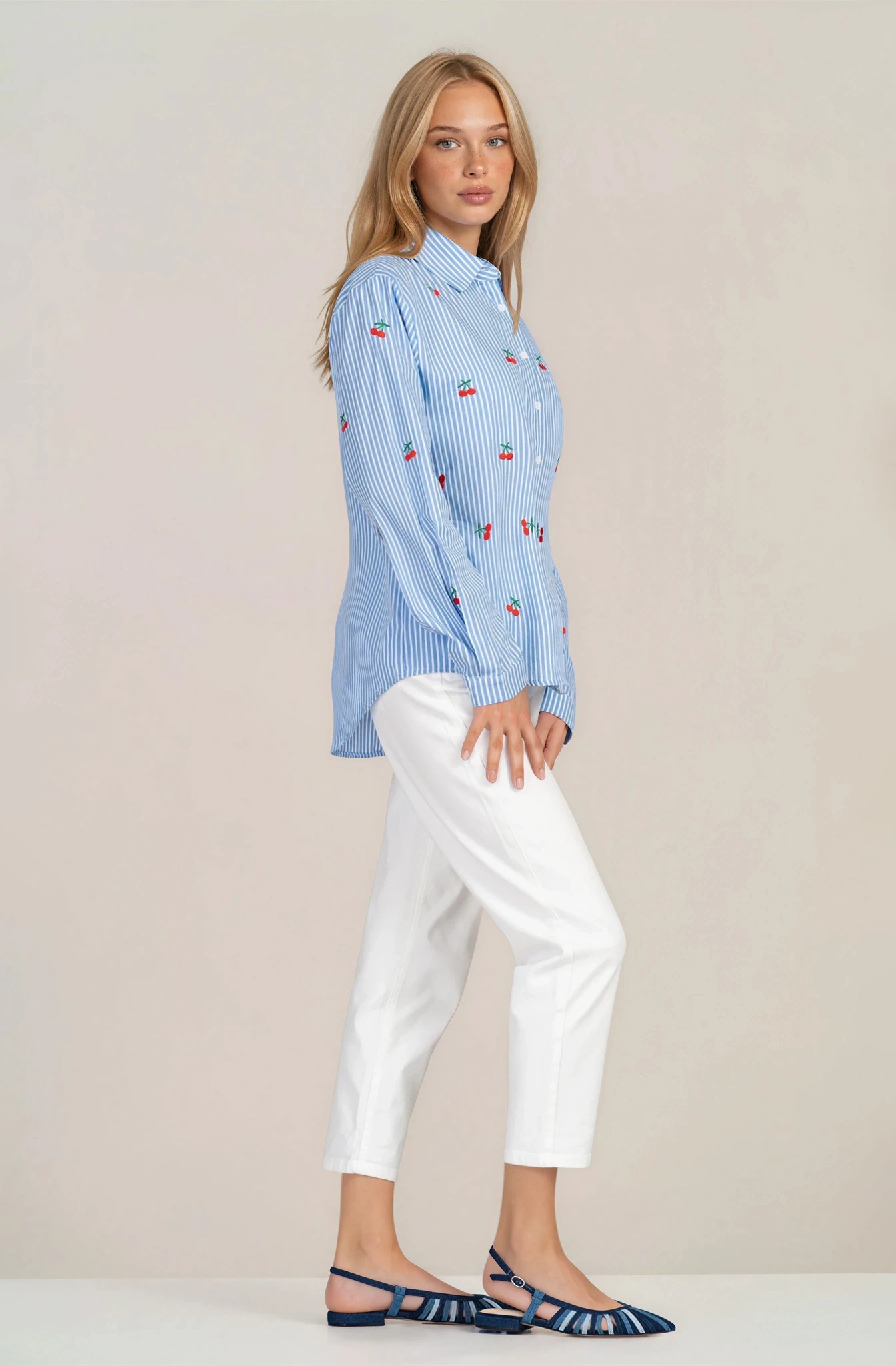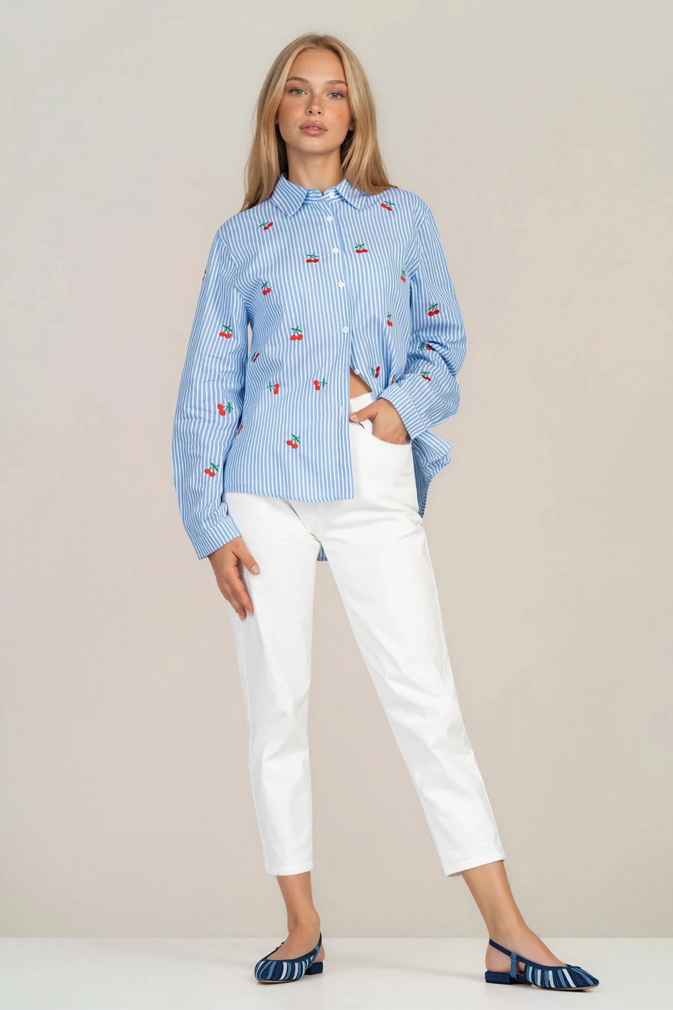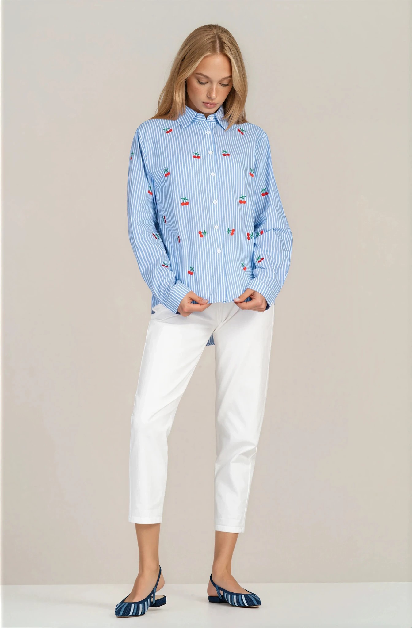 Свеж и артистичен модел с характер – тази риза "Dragonfly" комбинира класическо райе с игриви бродирани акценти. Материята от вискоза е лека, дишаща и приятна на допир, осигурявайки комфорт през целия ден. Класическата яка и закопчаване придават балансирана визия, а издълженият гръб добавя модерен силует. Бродираните череши създават отличителен детайл и подчертават индивидуалността на модела.
