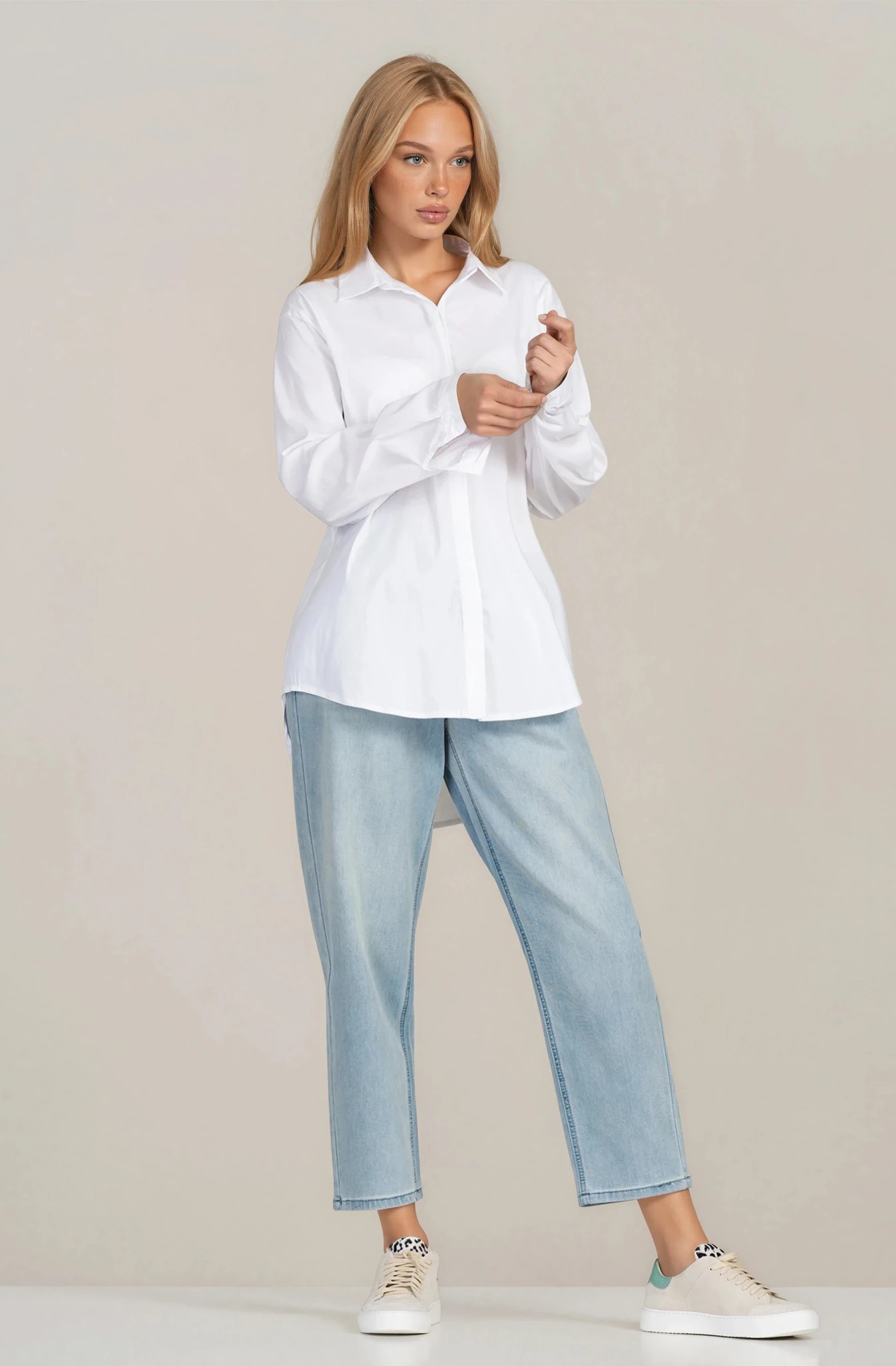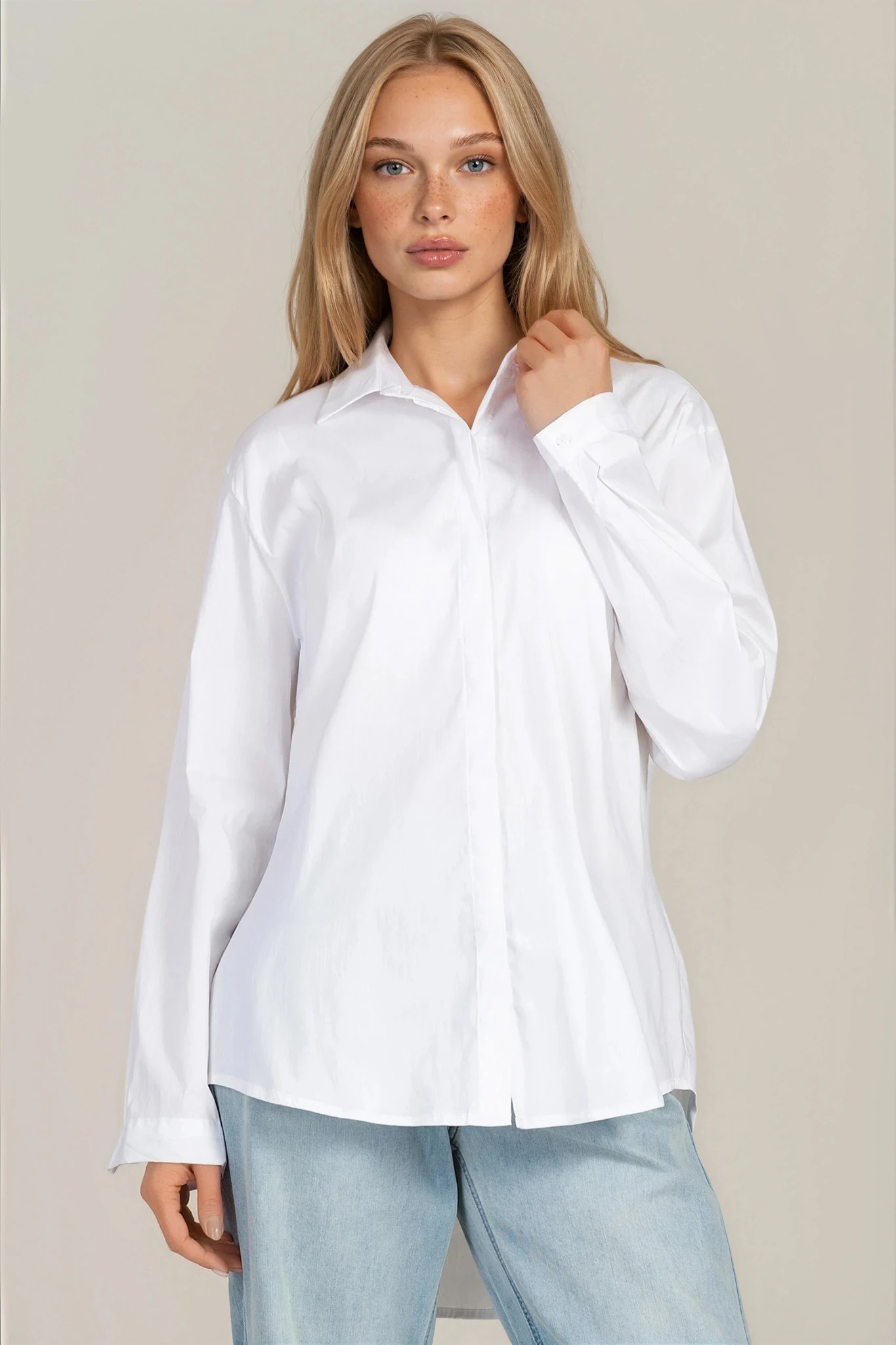 Дамска риза "Dragonfly" в бяло със скрито закопчаване и издължен гръб