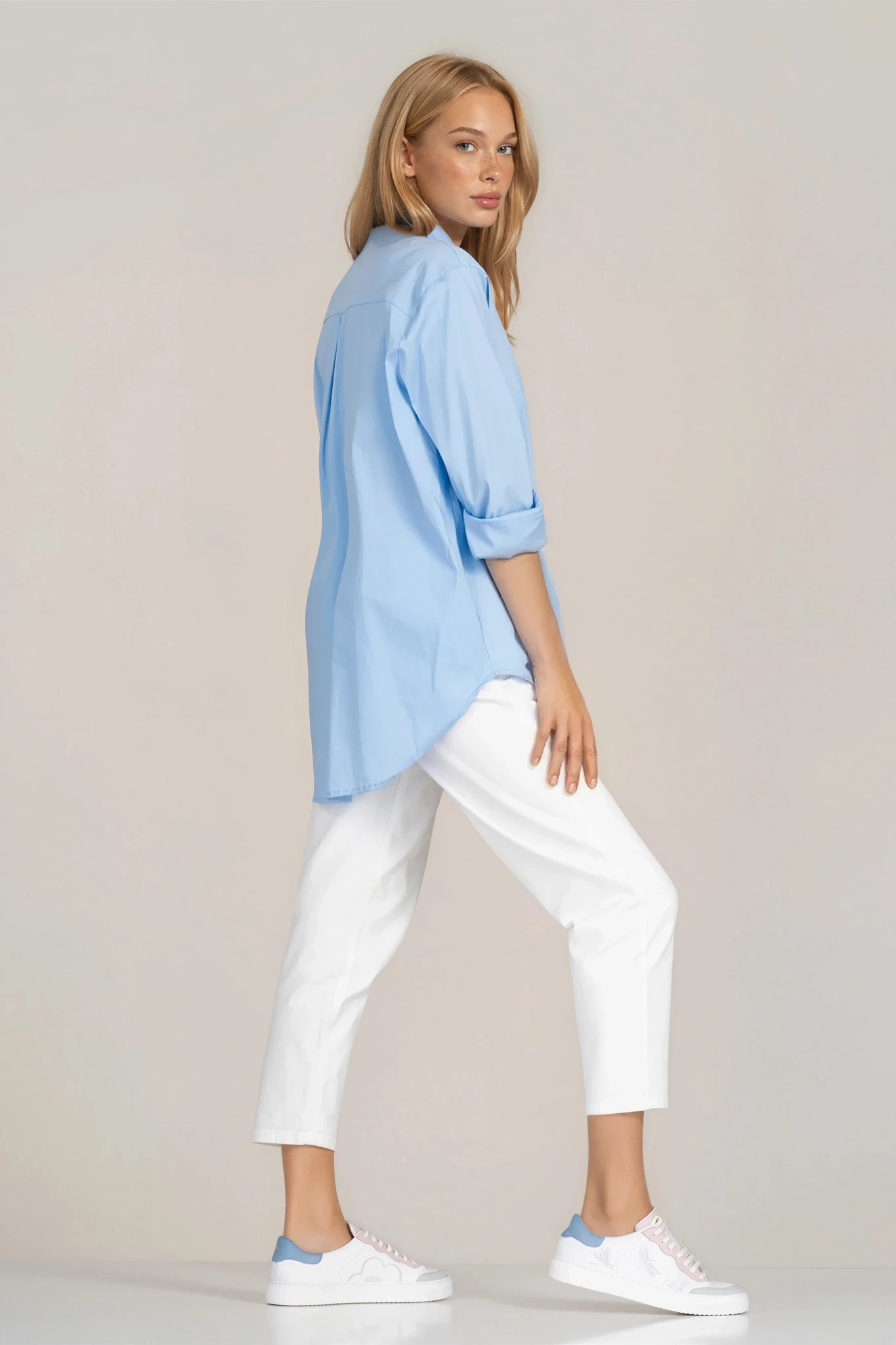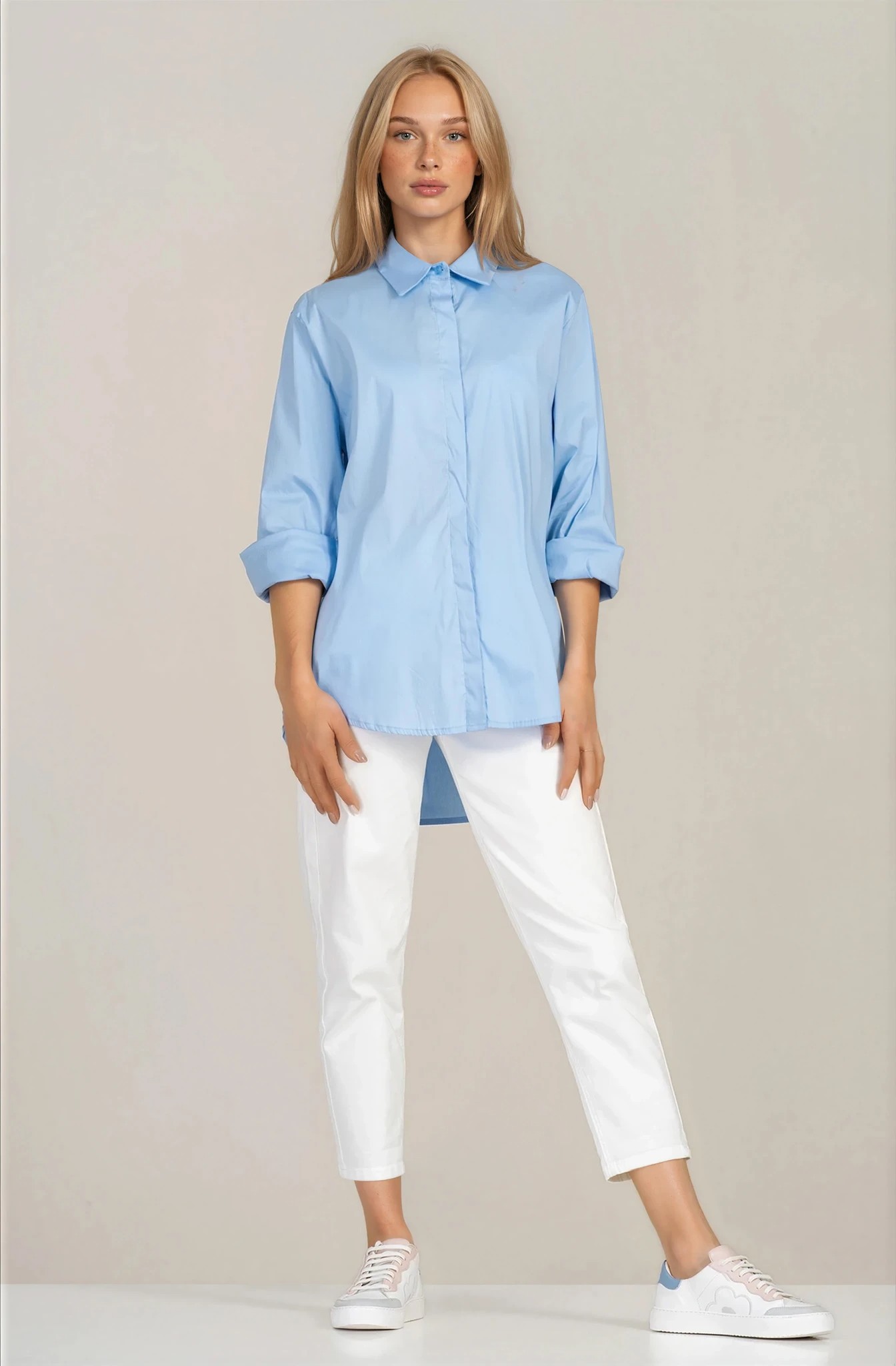 Дамска риза "Dragonfly" в синьо със скрито закопчаване и издължен гръб