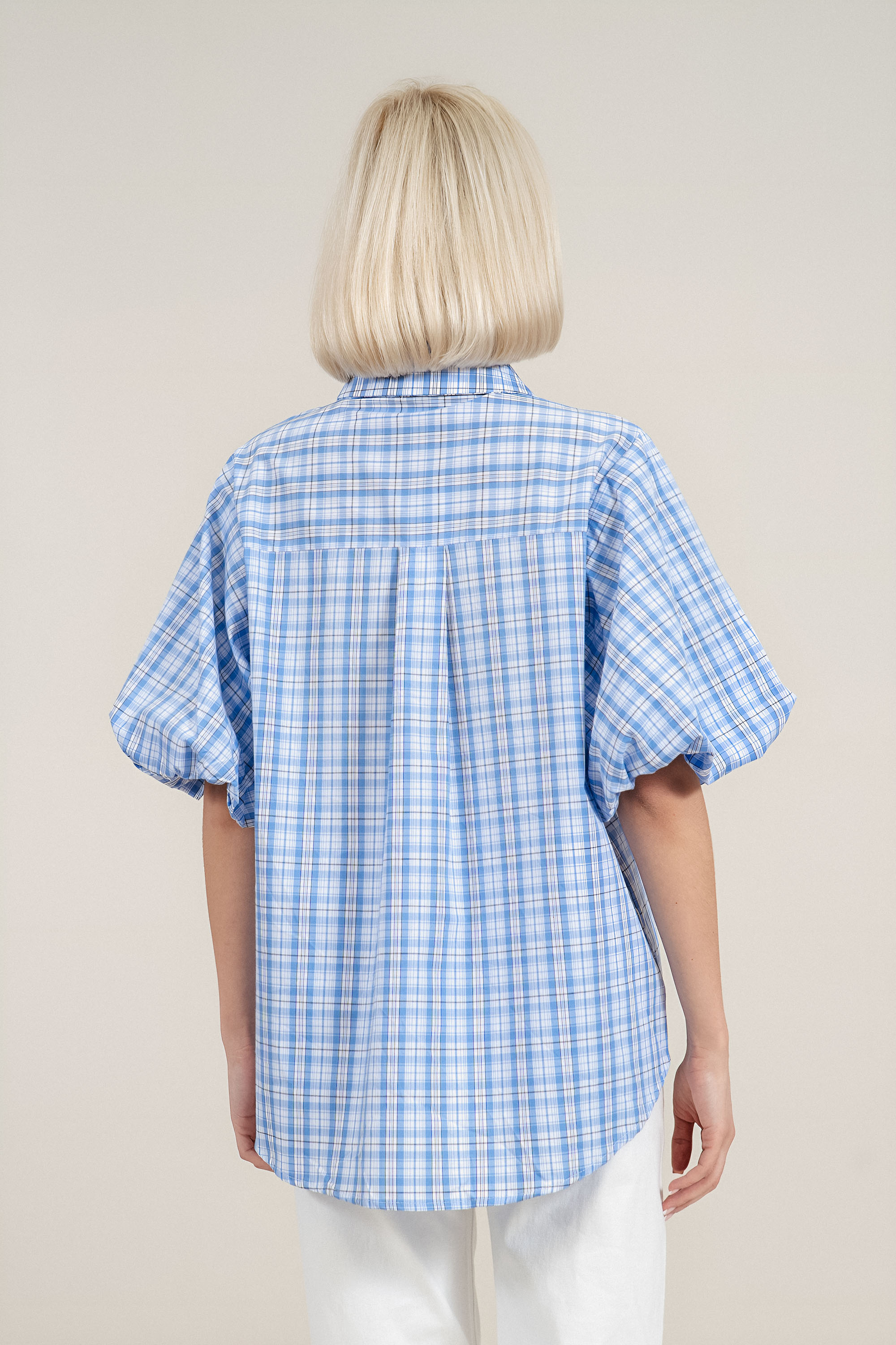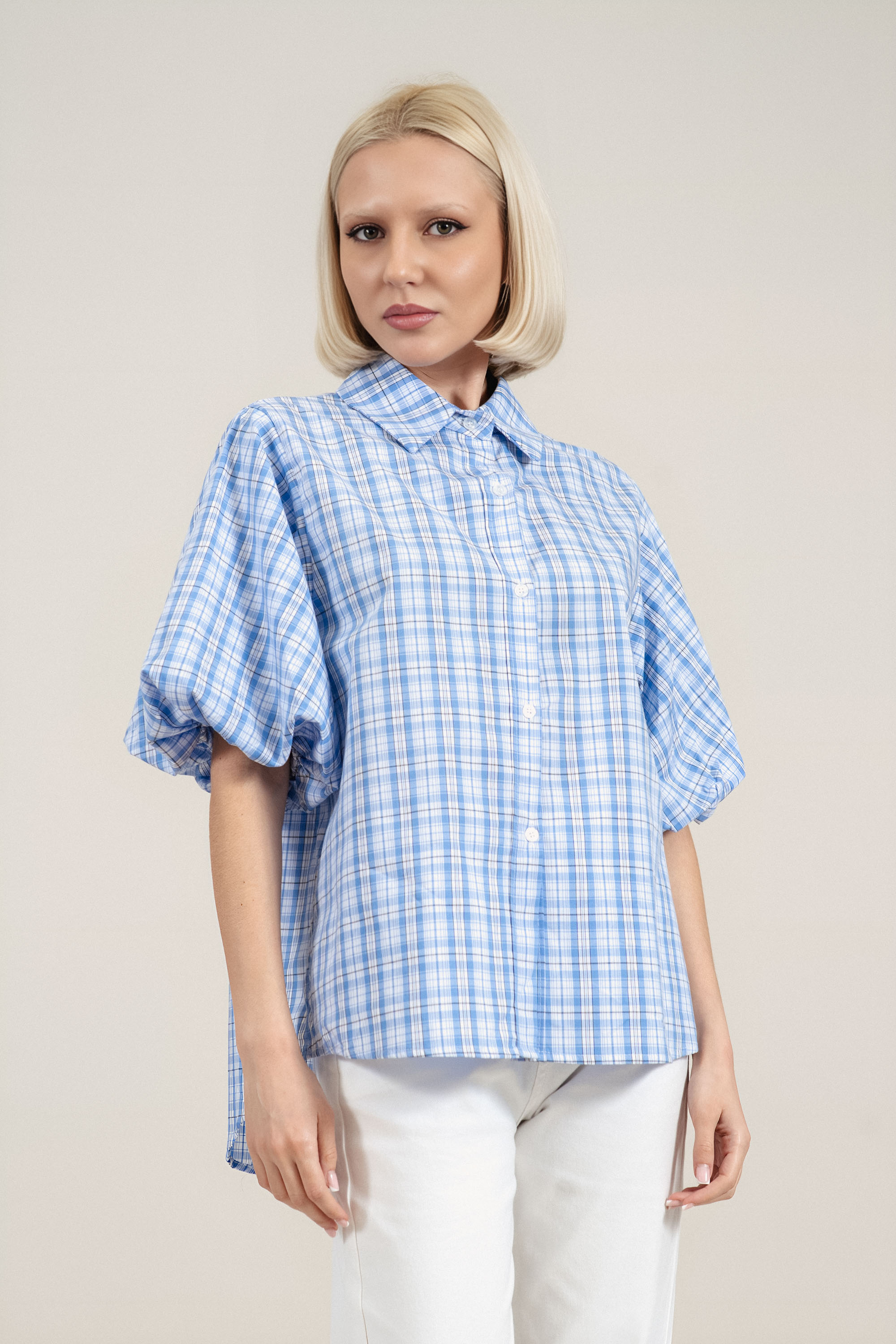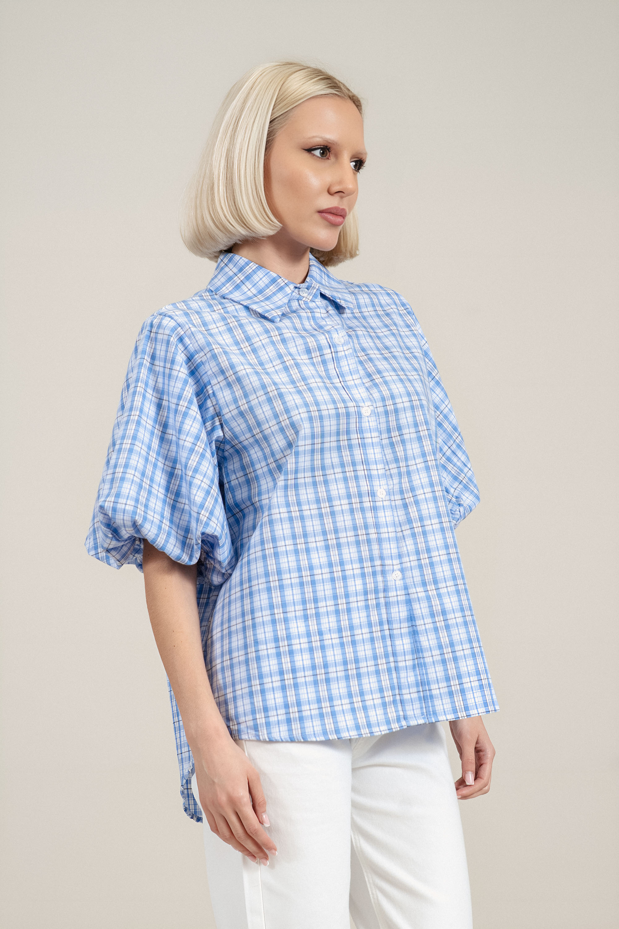 Елегантен модел с подчертана женствена линия и внимание към детайла. Памучната тъкан осигурява естествена проветривост и комфорт, което прави ризата практичен избор за активното ежедневие. Дизайнът с бяло, синьо и черно райе създава изчистен, но отличим стил. Ластикът на ръкавите подчертава фигурата, без да ограничава движението, а издължената задна част придава съвременен завършек. Комбинира се лесно с панталон, дънки или пола за завършена и стилна визия.