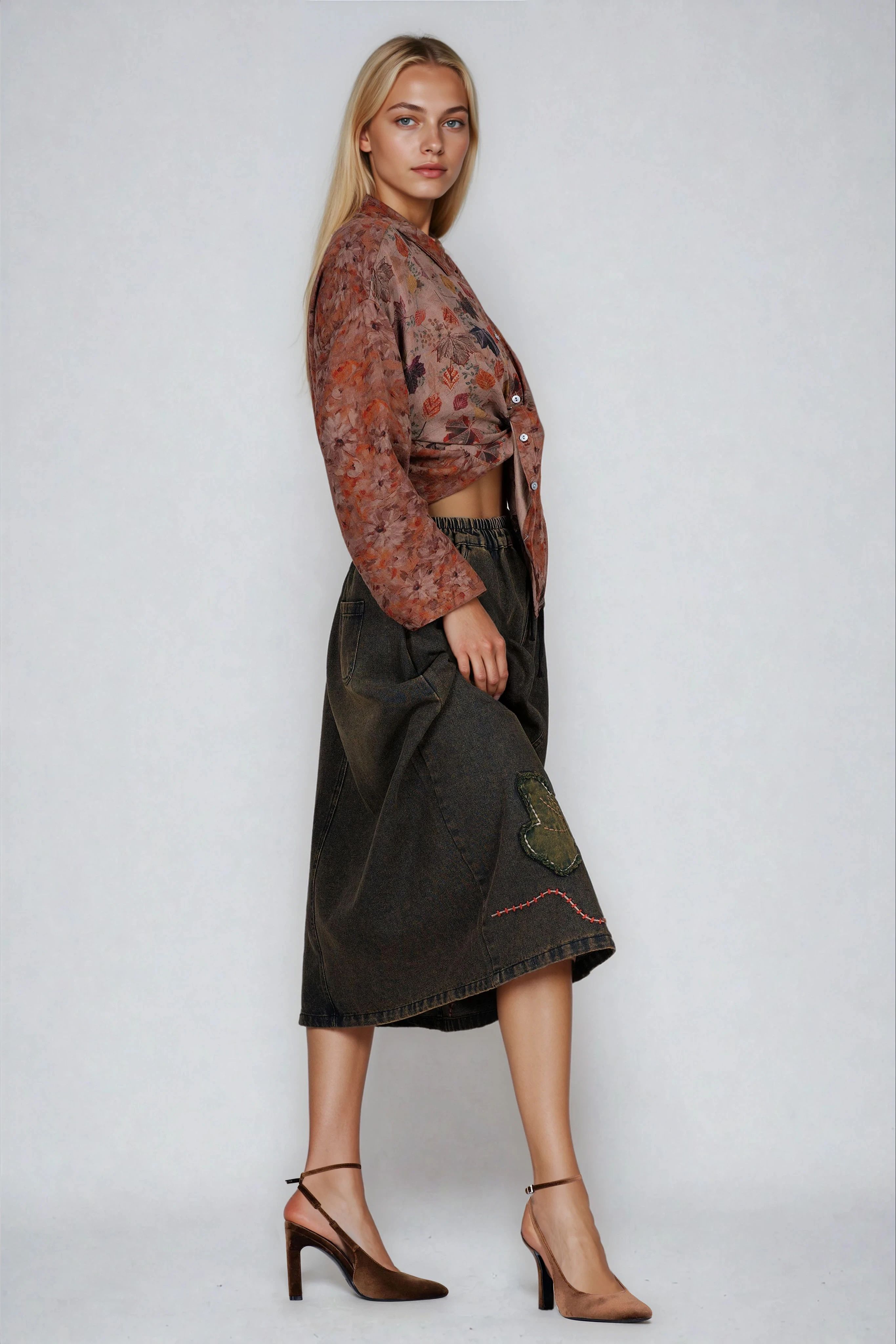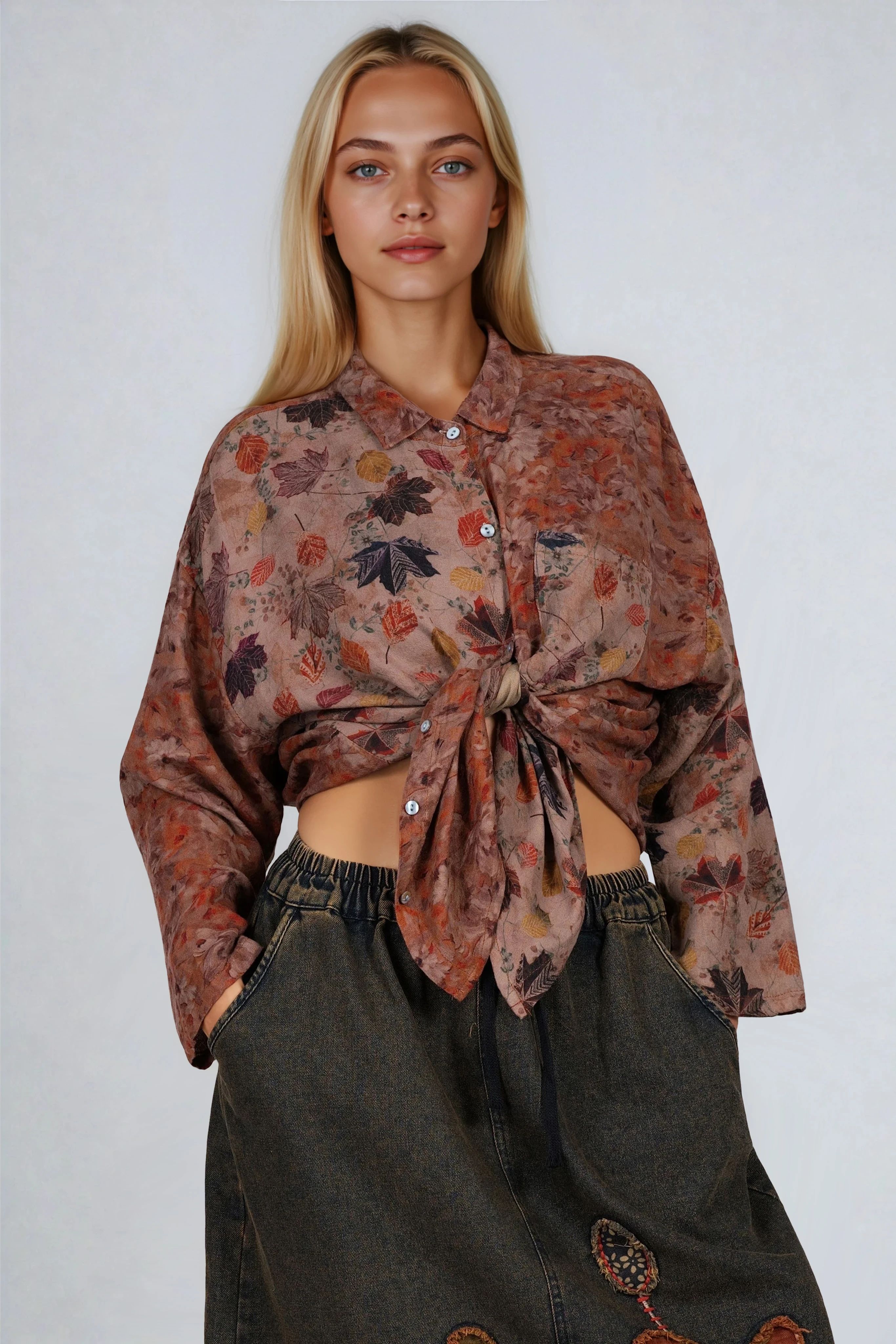 Есенна риза в мек бежов нюанс с декоративни акценти и принт на листа в топли тонове. Кройката е свободна, с комфортна дължина и леко удължен гръб. Апликациите върху платката придават оригиналност и мек ретро чар. Перфектна за хладни дни с жилетка.