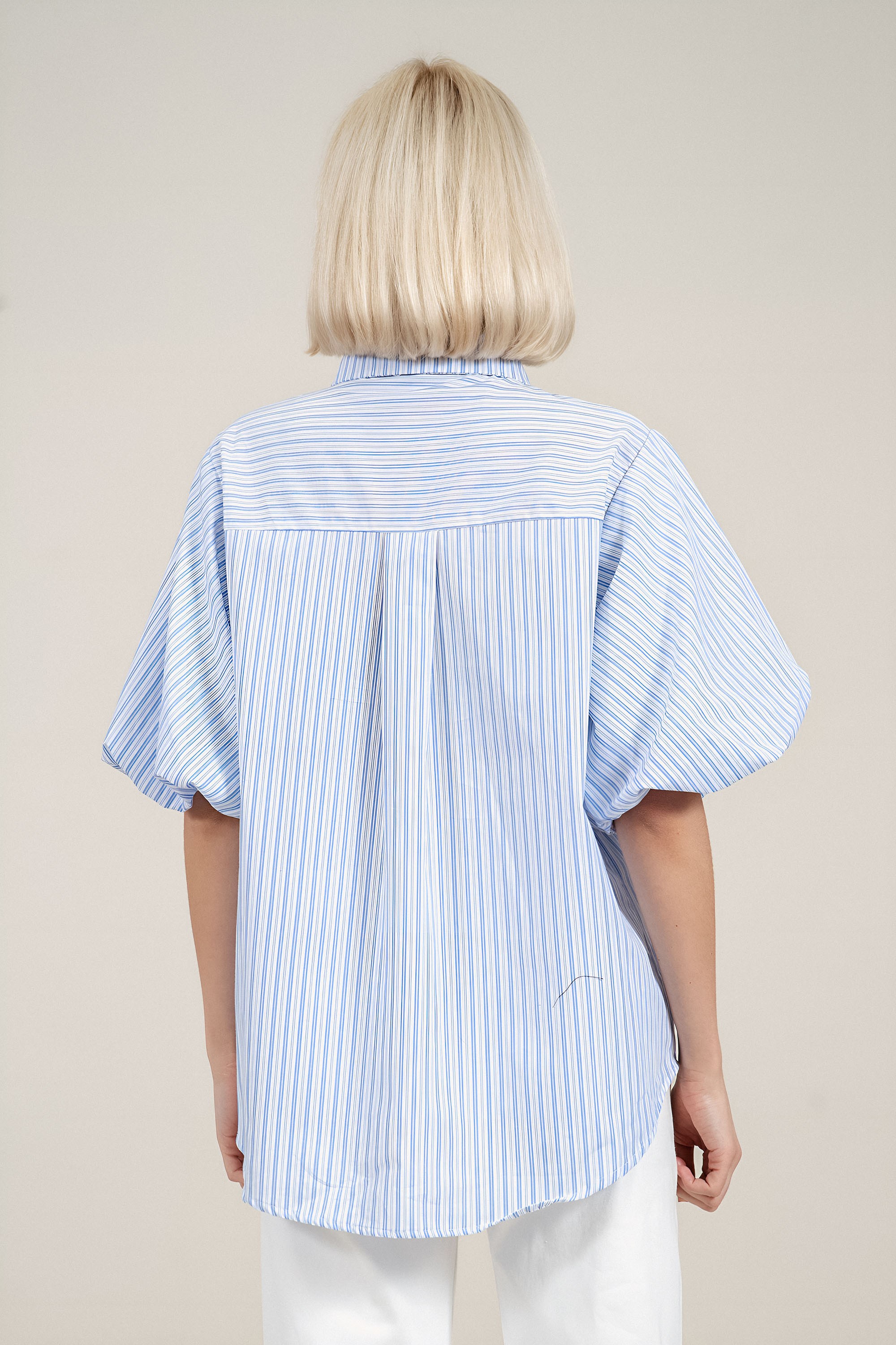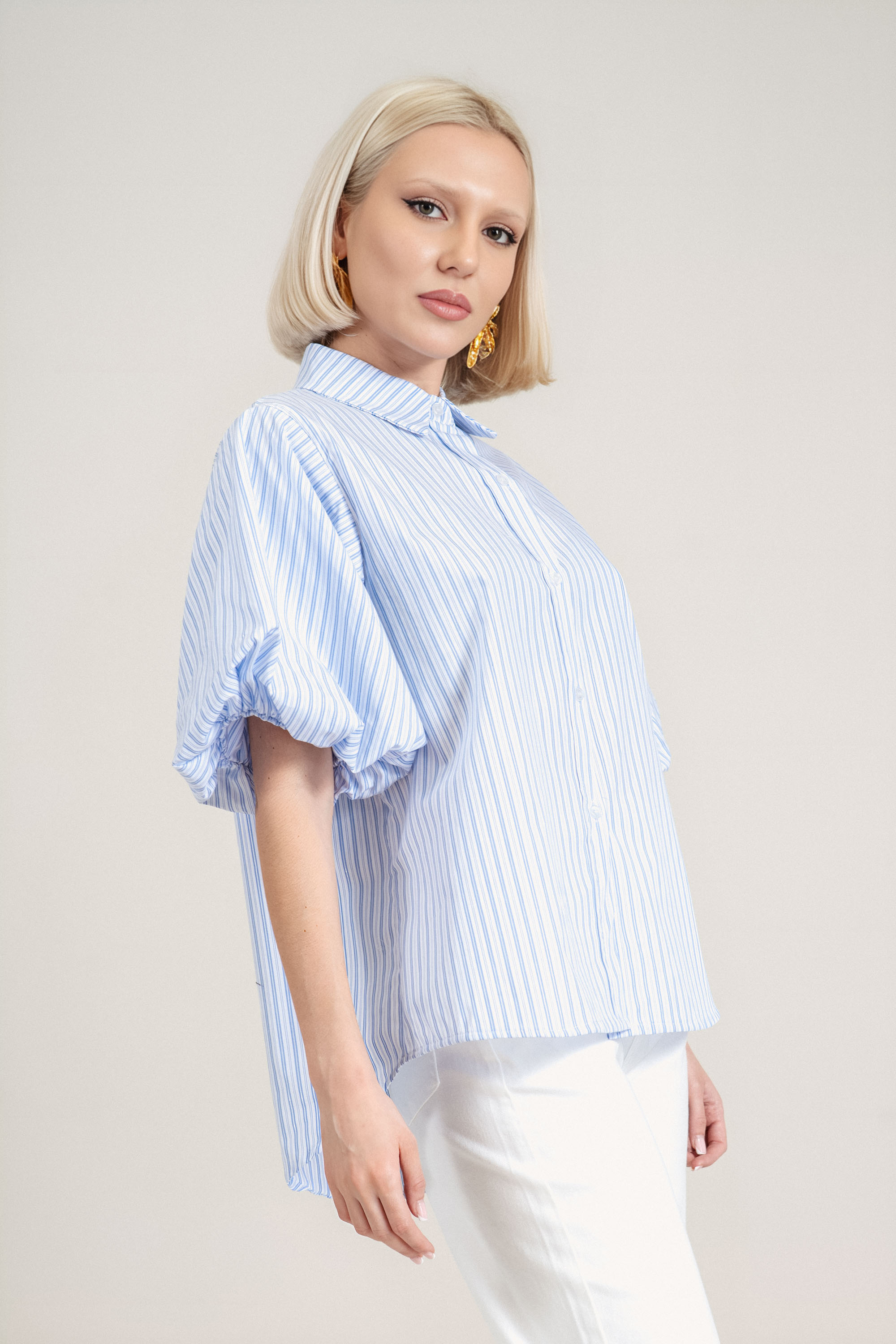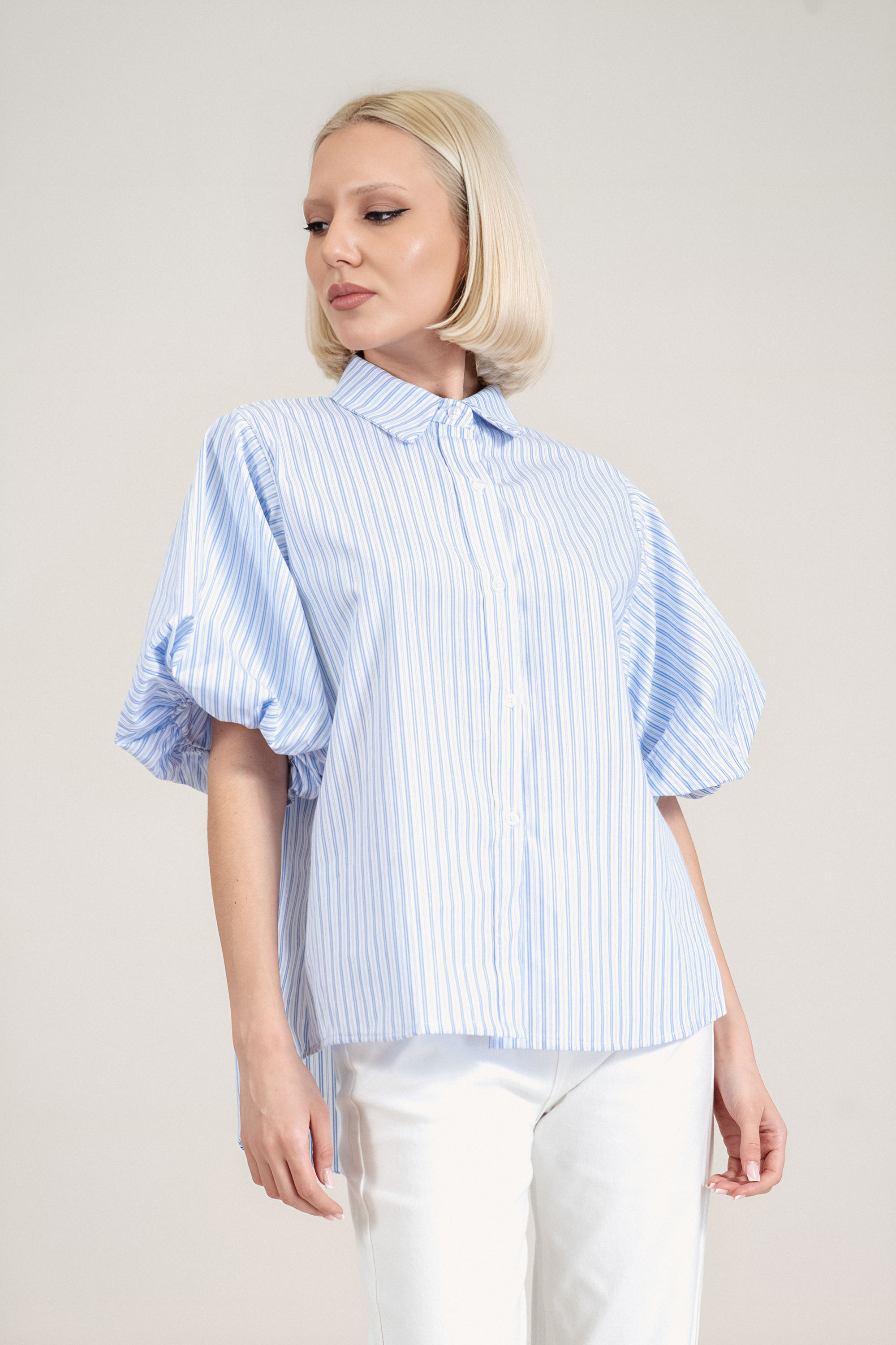 Елегантен модел с подчертана женствена линия и внимание към детайла. Памучната материя осигурява естествена проветривост и мекота, което прави ризата подходяща за пролетно-летния сезон. Декоративното райе в синьо и сребристо внася фин акцент, без да натоварва визията. Ластикът на ръкавите създава балансиран силует, а издължената задна част придава съвременен завършек. Комбинира се лесно с елегантен панталон или дънки за изчистена и стилна визия.