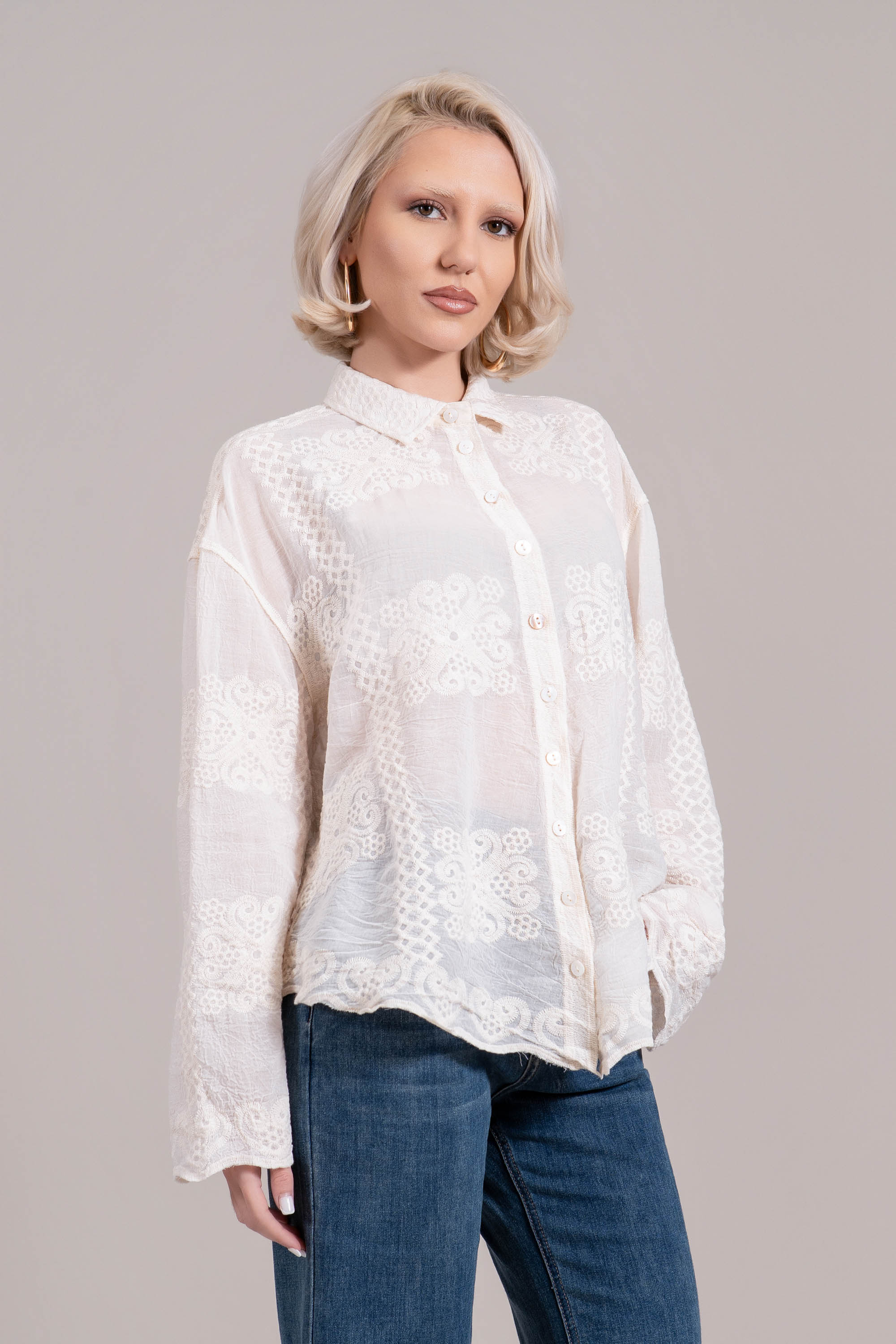 Риза с изразен характер – фина бродерия с орнаменти върху памучно платно създава стилна и запомняща се визия. Моделът е едноцветен, с дълъг ръкав и свободна кройка, която осигурява комфорт през целия ден. Идеална както за ежедневието, така и за по-специални поводи.