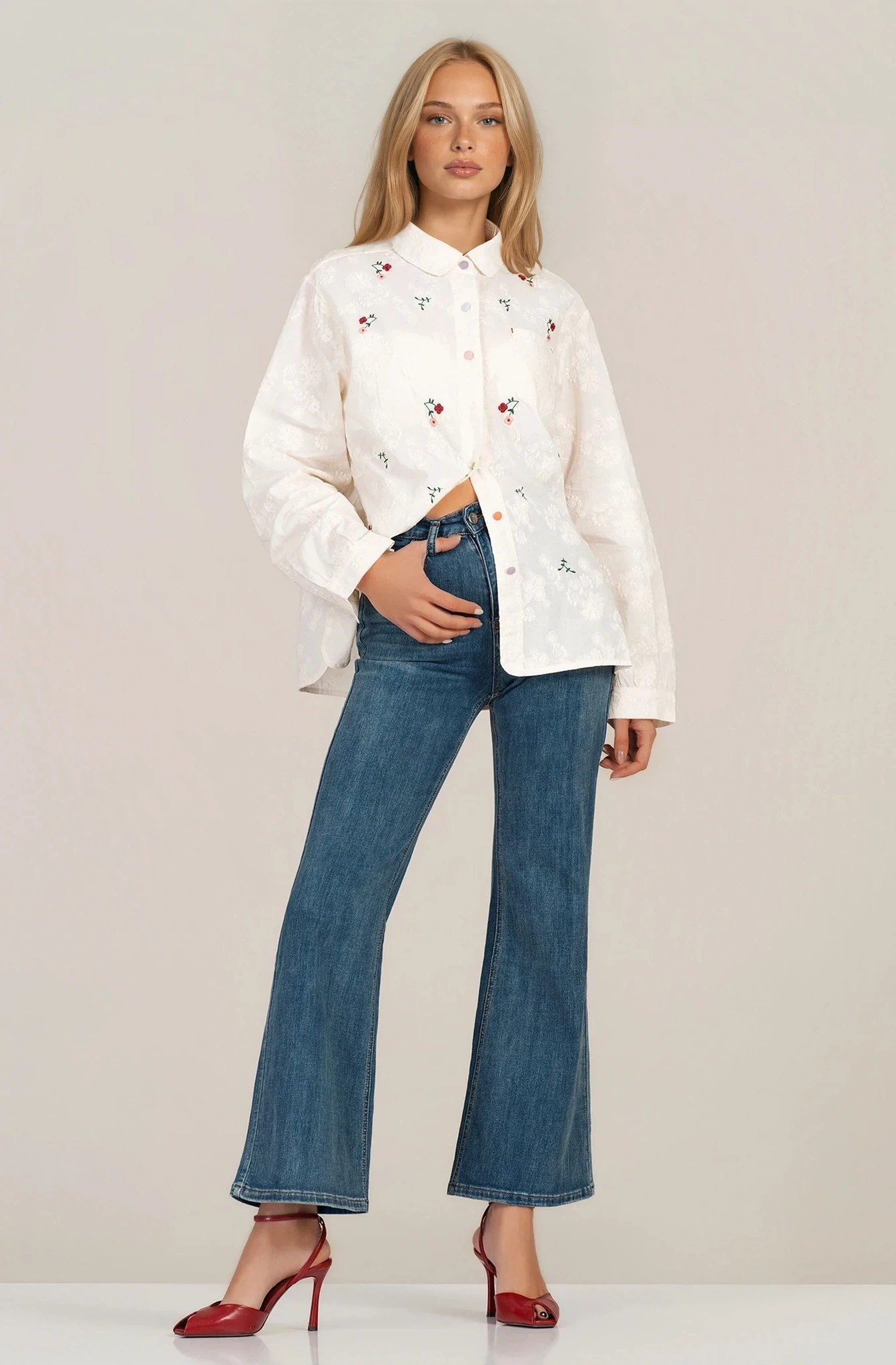 Елегантна риза от естественa памучна материя, създадена за комфорт и стил в ежедневието. Светлият екрю нюанс придава изчистена и нежна визия, която лесно се комбинира с различни аутфити. Цветните копчета в розово, лилаво и оранжево създават свеж акцент, а декоративната бродерия с флорални мотиви добавя женствен характер на модела. Джобът на гърдите допълва дизайна и придава практичност, което прави ризата подходяща както за ежедневни, така и за по-елегантни визии.