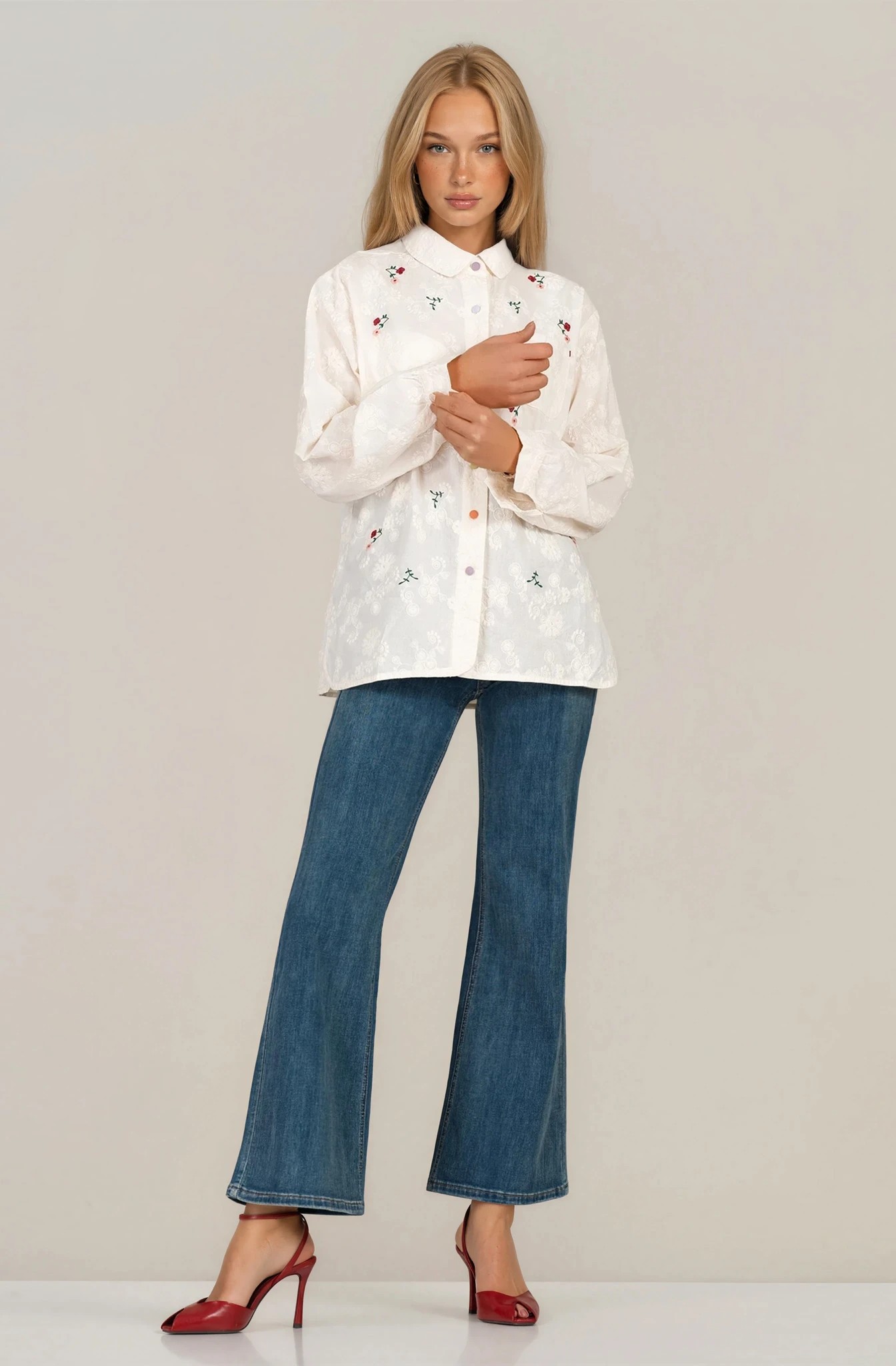 Дамска риза от памук в цвят екрю с цветни копчета и флорална бродерия