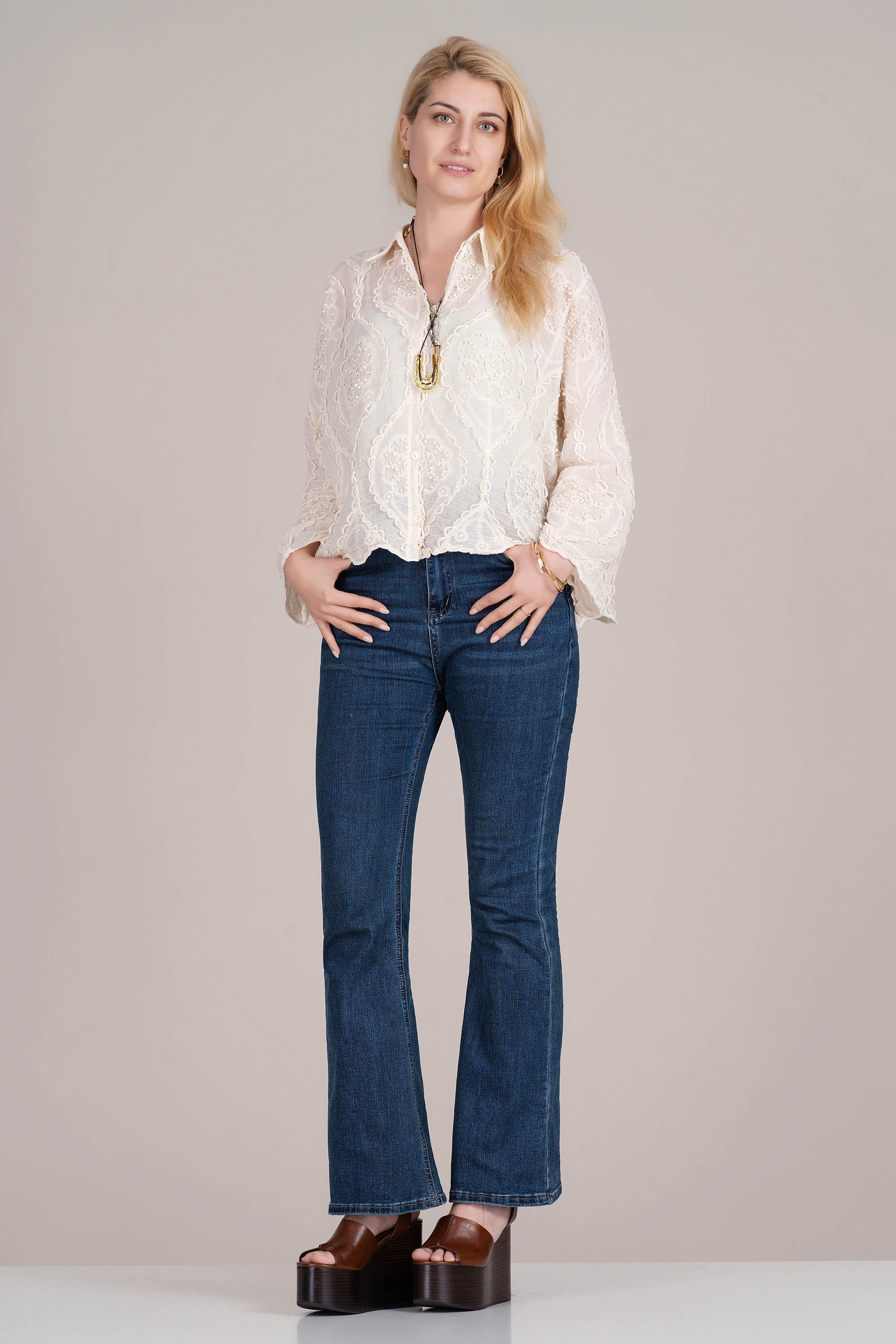 Тази едноцветна риза в елегантен екрю нюанс е изработена от 100% памук, което гарантира естествена мекота и комфорт. Деликатната релефна бродерия добавя фин акцент към класическия дизайн. Издължената кройка създава изтънчена линия и позволява лесно комбиниране с различни долнища. Подходяща е за пролетно-летния сезон и за елегантни ежедневни визии.