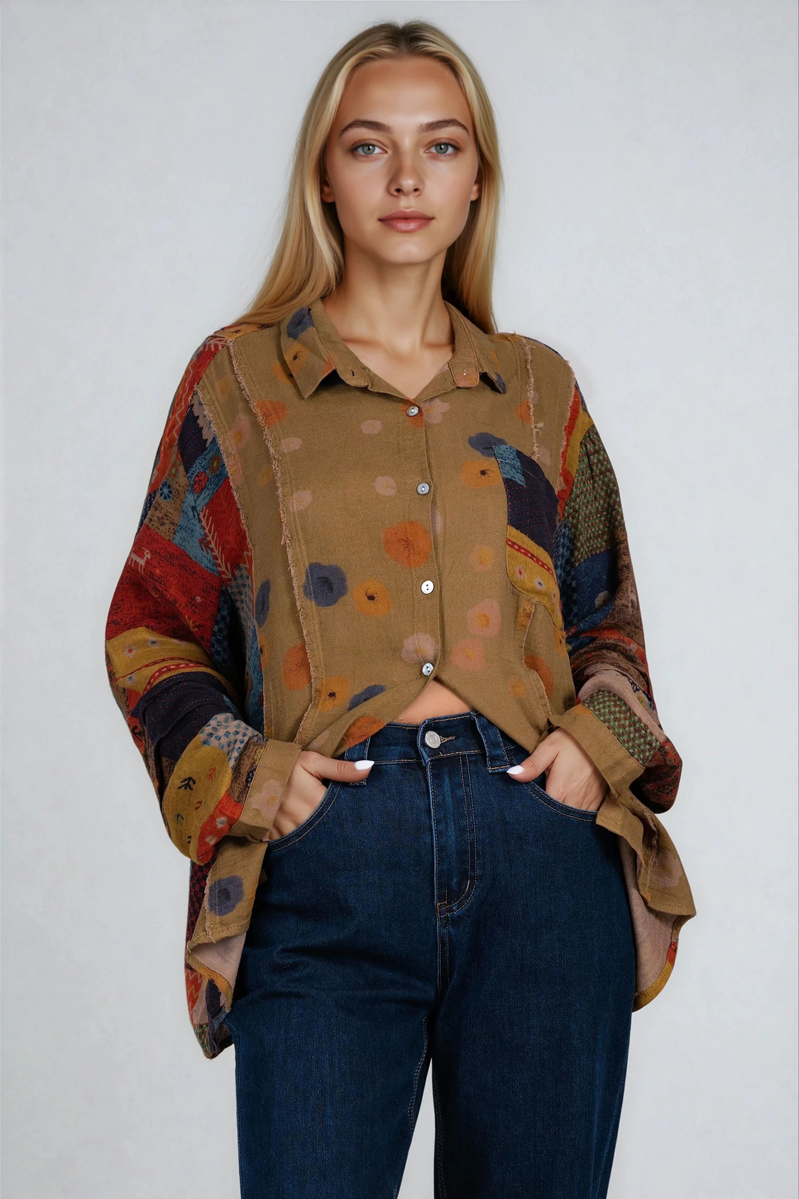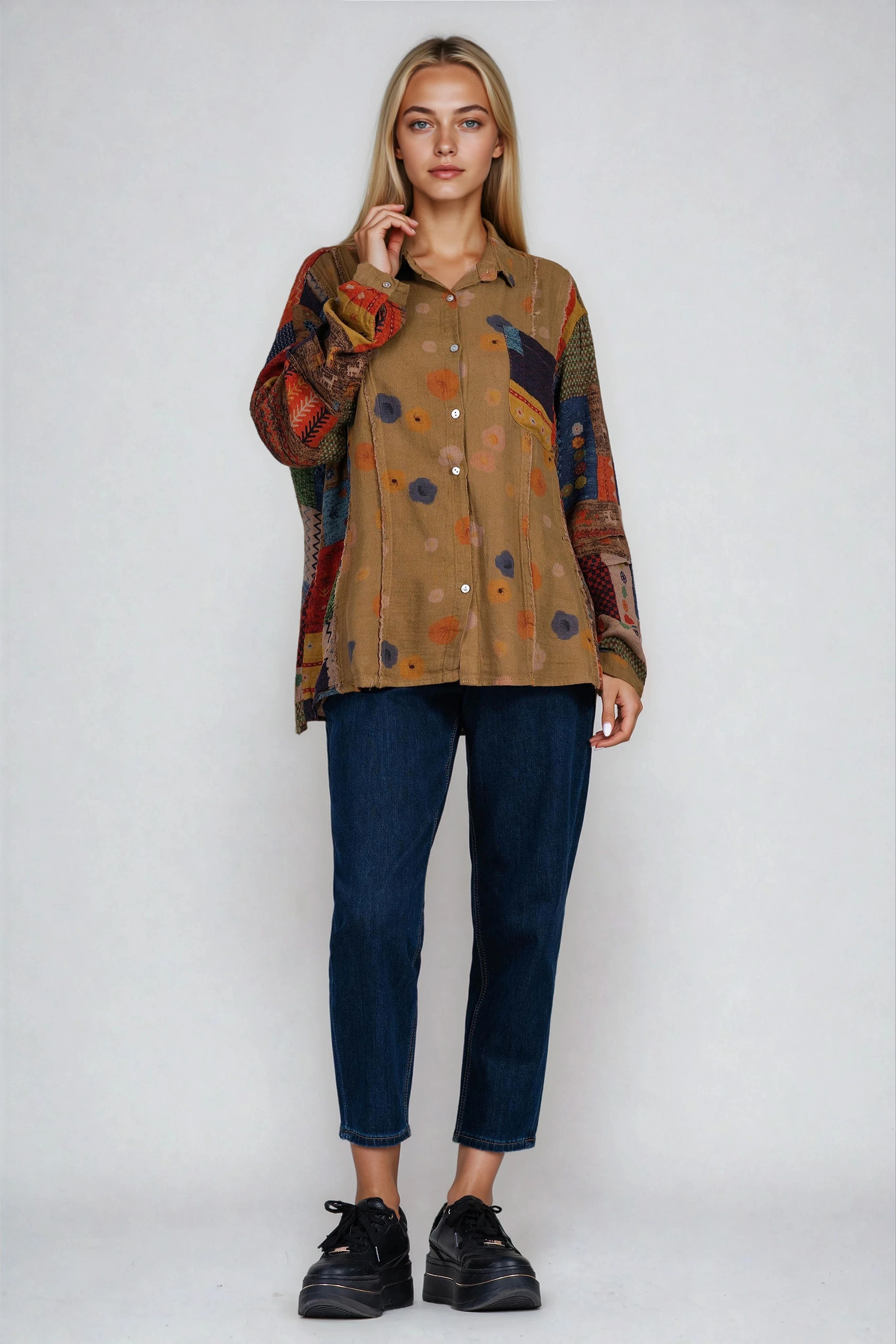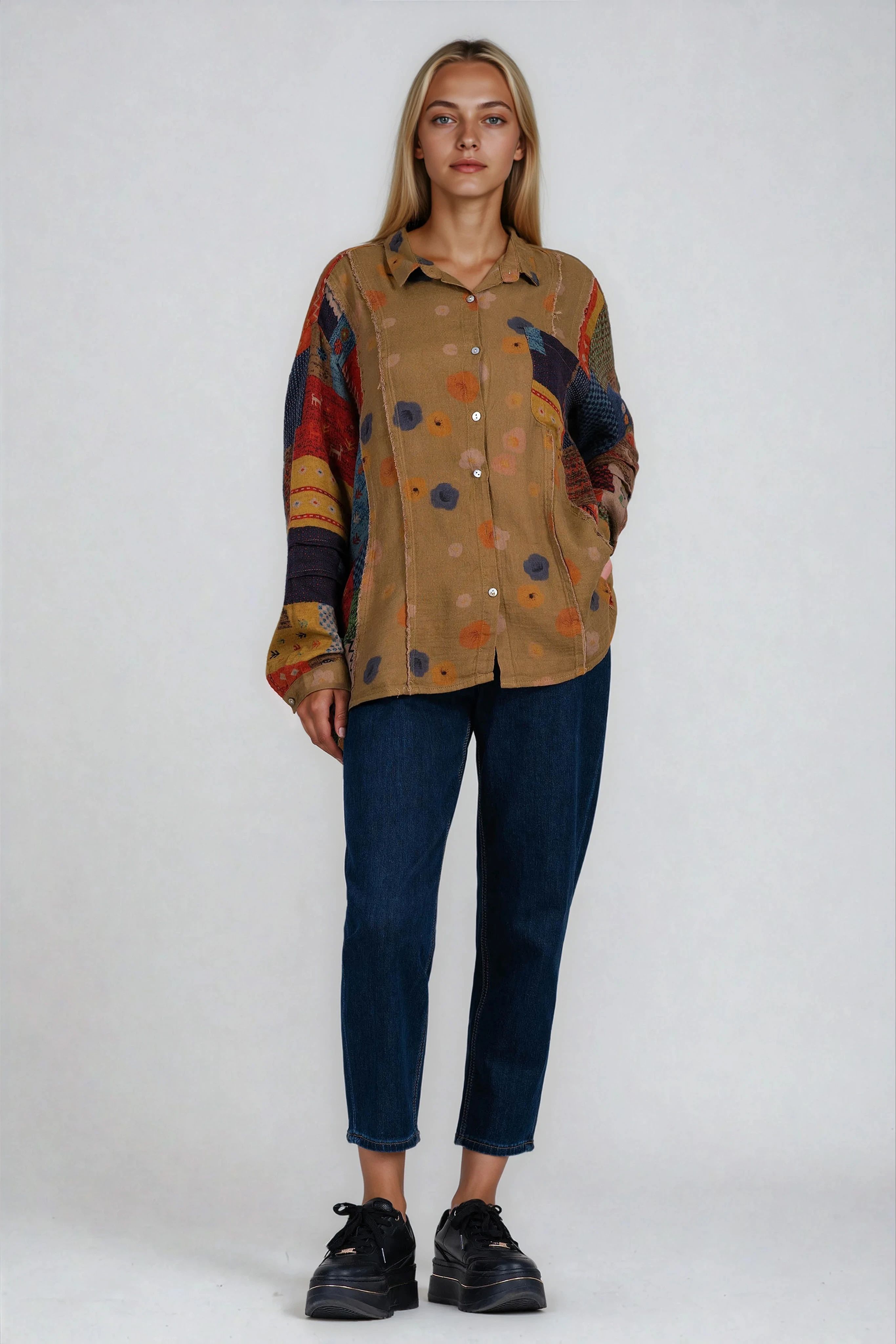 Свежа и артистична, тази памучна риза в цвят каки е декорирана с многоцветен принт в оранжево, синьо и жълто, който придава индивидуалност на визията. Моделът разполага с джоб на бюста, класическа яка и вертикални декоративни ленти отпред. Подходяща е за ежедневието, като се комбинира отлично с дънки или пола за балансиран и стилен външен вид.