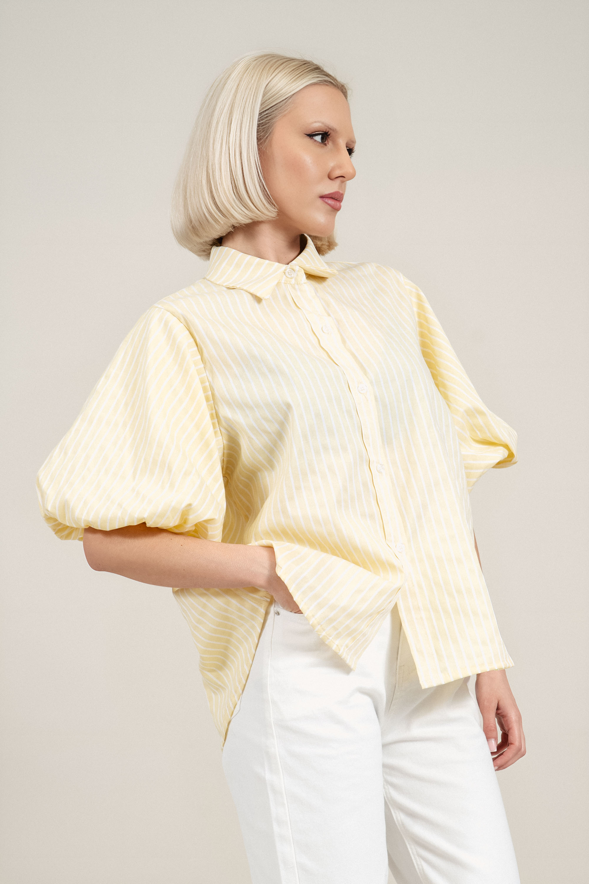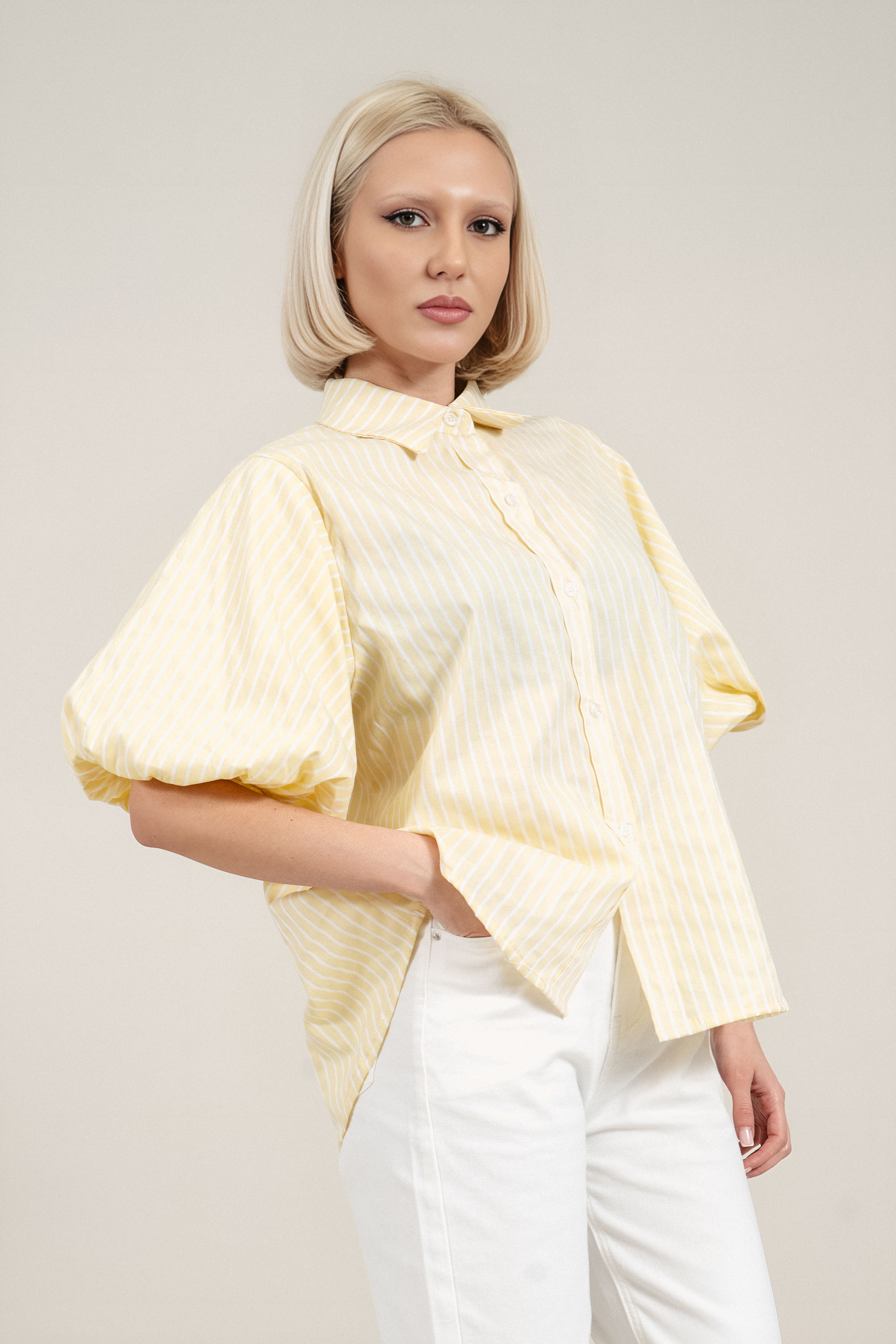 Дамска риза от памук в жълто с бяло райе и издължен гръб