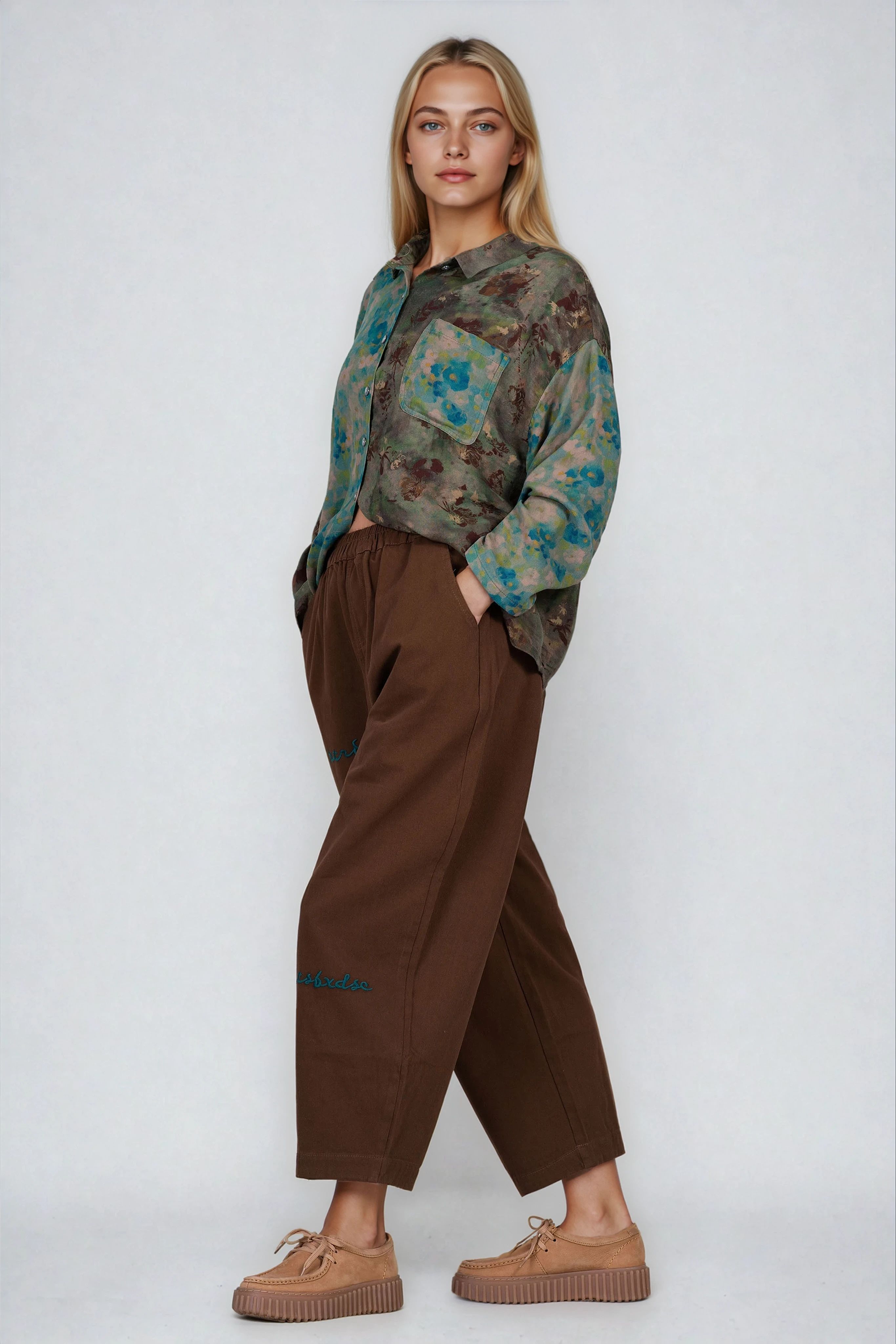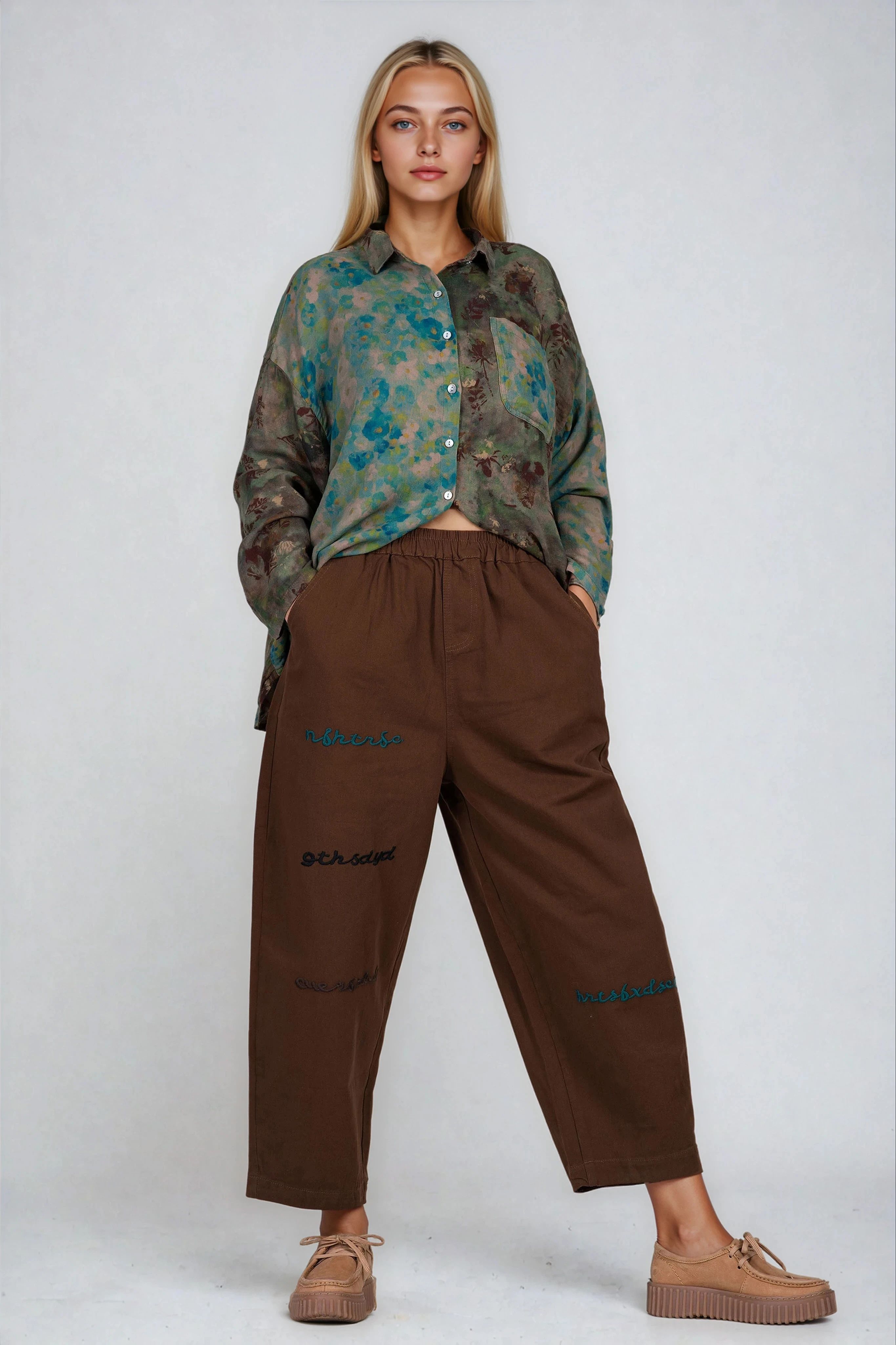 Есенна риза в зелен нюанс с флорален принт в земни тонове. Кройката е свободна, с комфортна дължина и леко удължен гръб. Апликациите върху платката придават оригиналност и мек ретро чар. Перфектна за хладни дни с жилетка.
