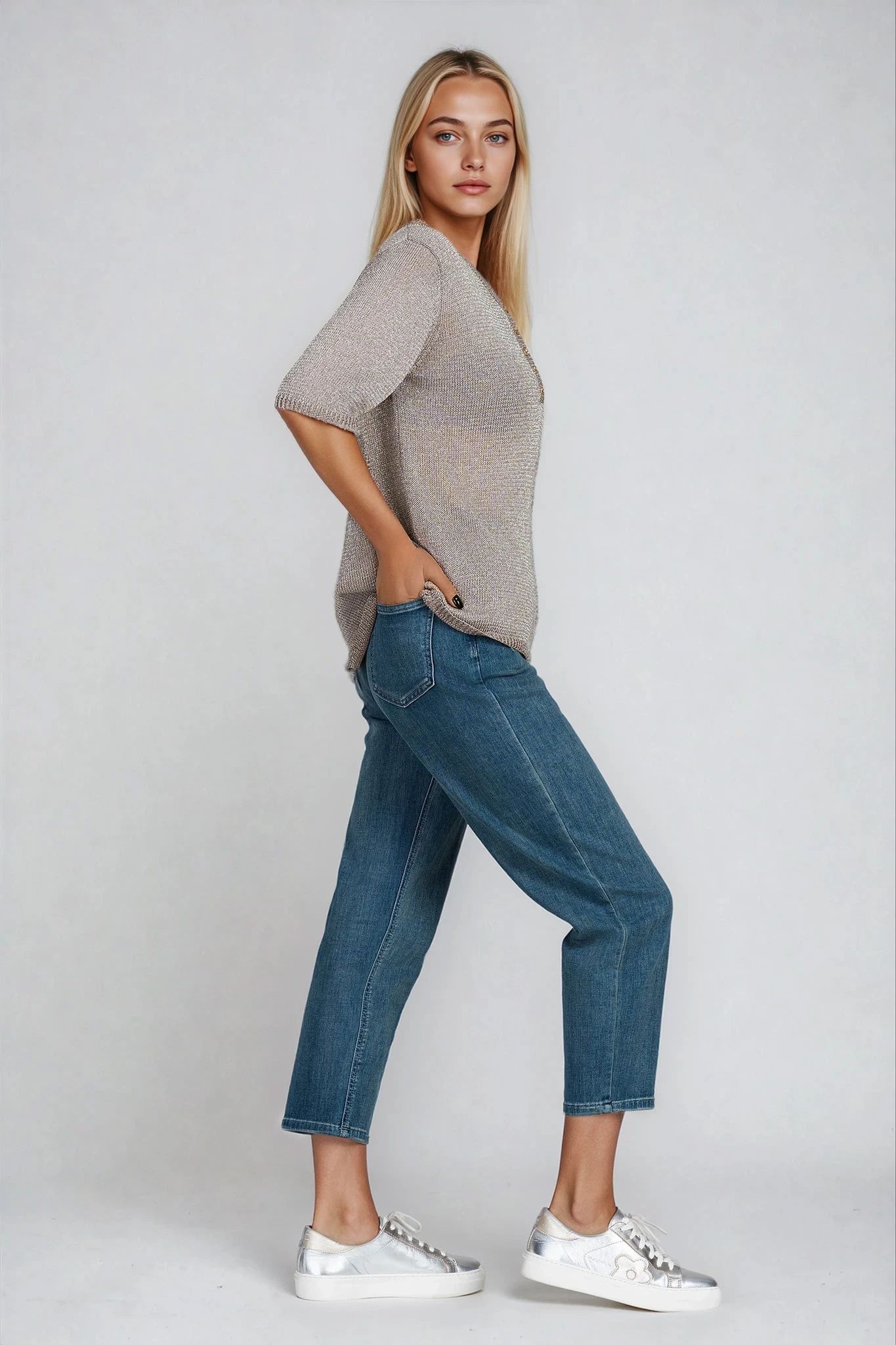 Изискана и удобна блуза с нежен блясък от ламе нишки, придаващ леко сияние на визията. Деколтето е оформено с декоративна платка и копчета, които подчертават елегантната линия. Фината плетка и сивият цвят я правят подходяща за офис, ежедневие и пътуване.