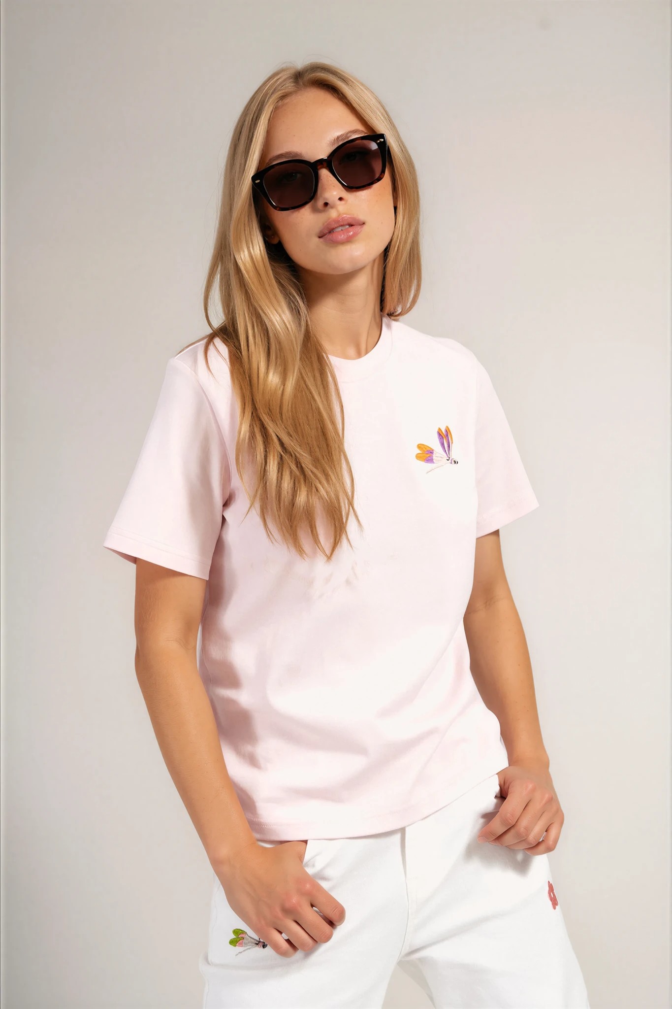 Дамска тениска ''Dragonfly'' от органичен памук в розово с бродирано водно конче