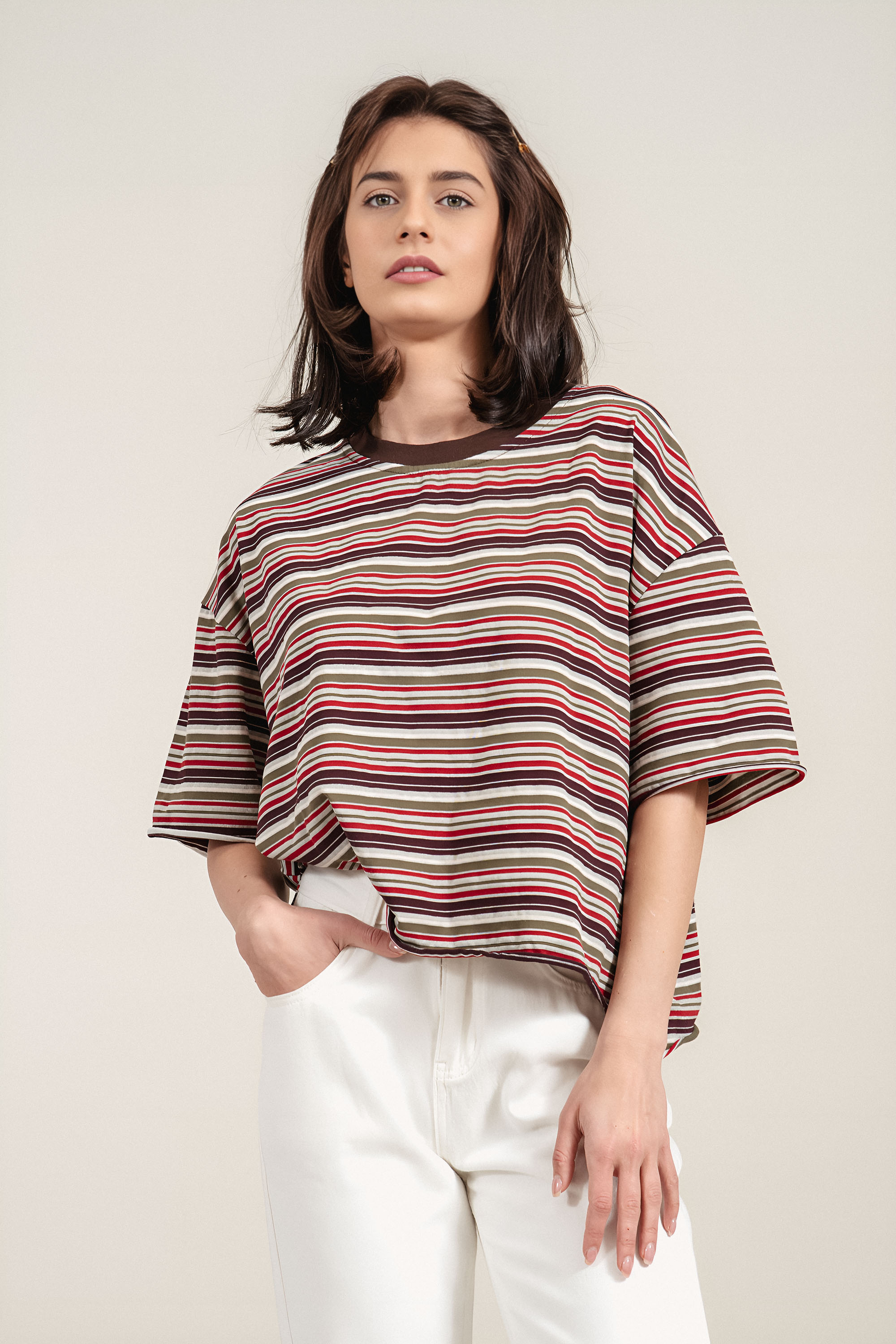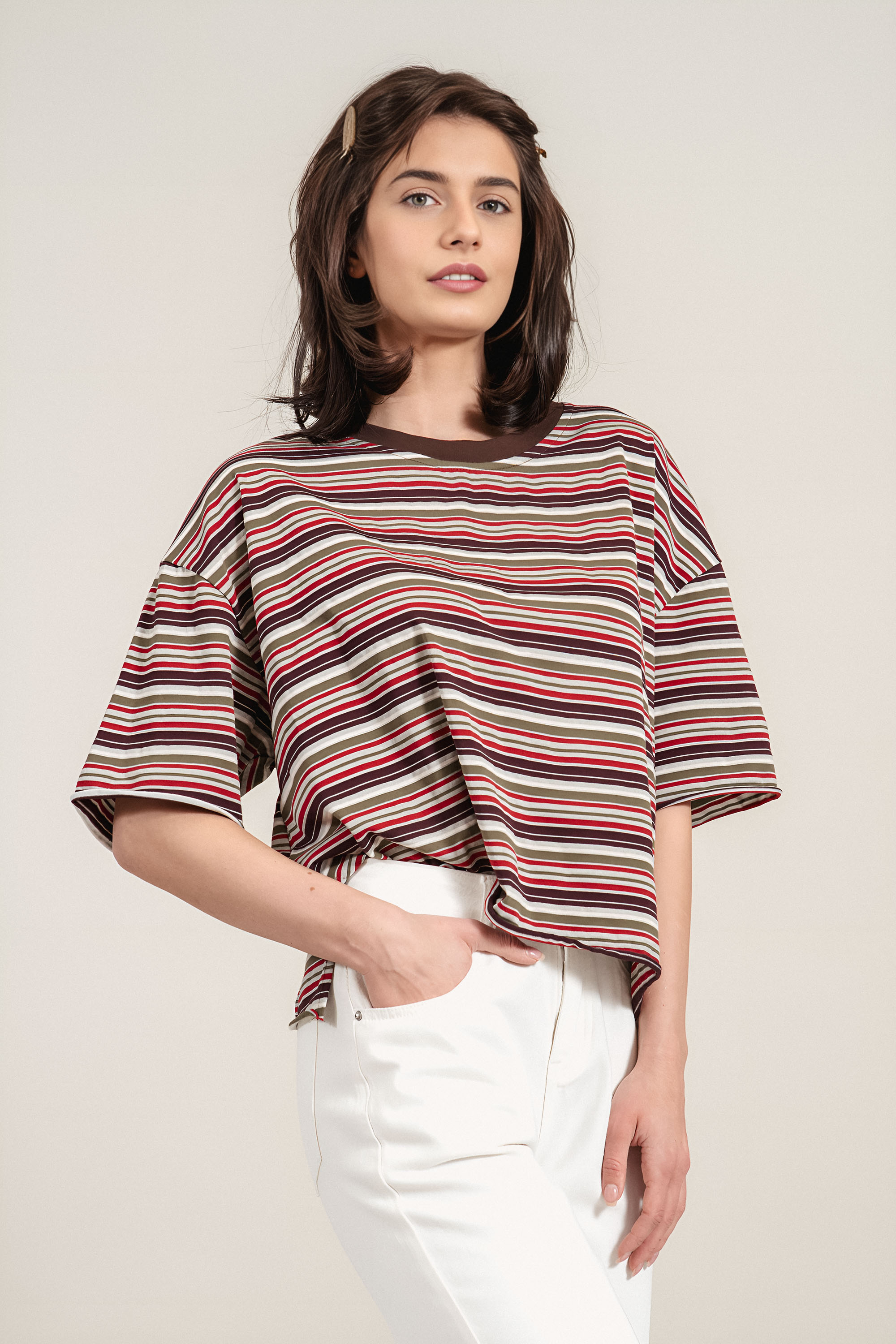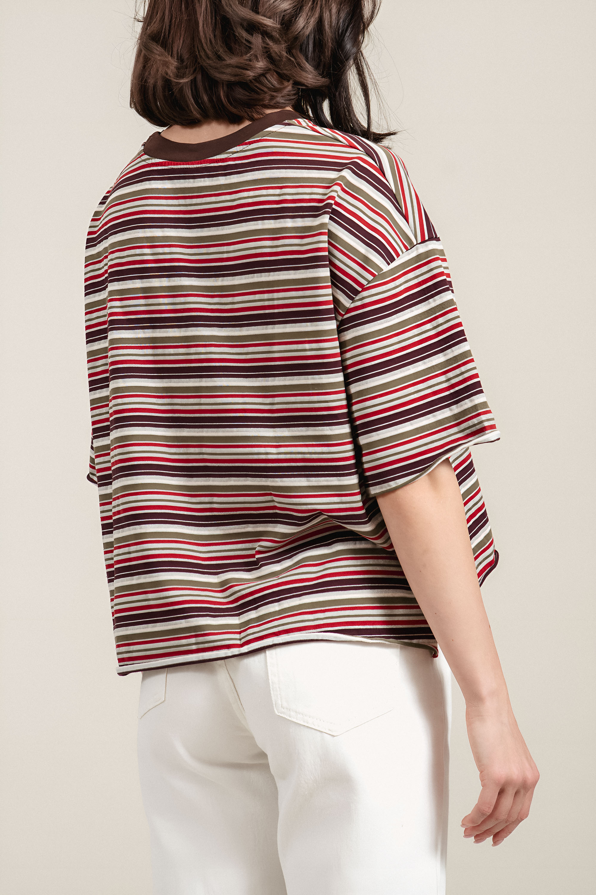 Дамска тениска от памук с раиран принт в кафяво, зелено, червенои сиво