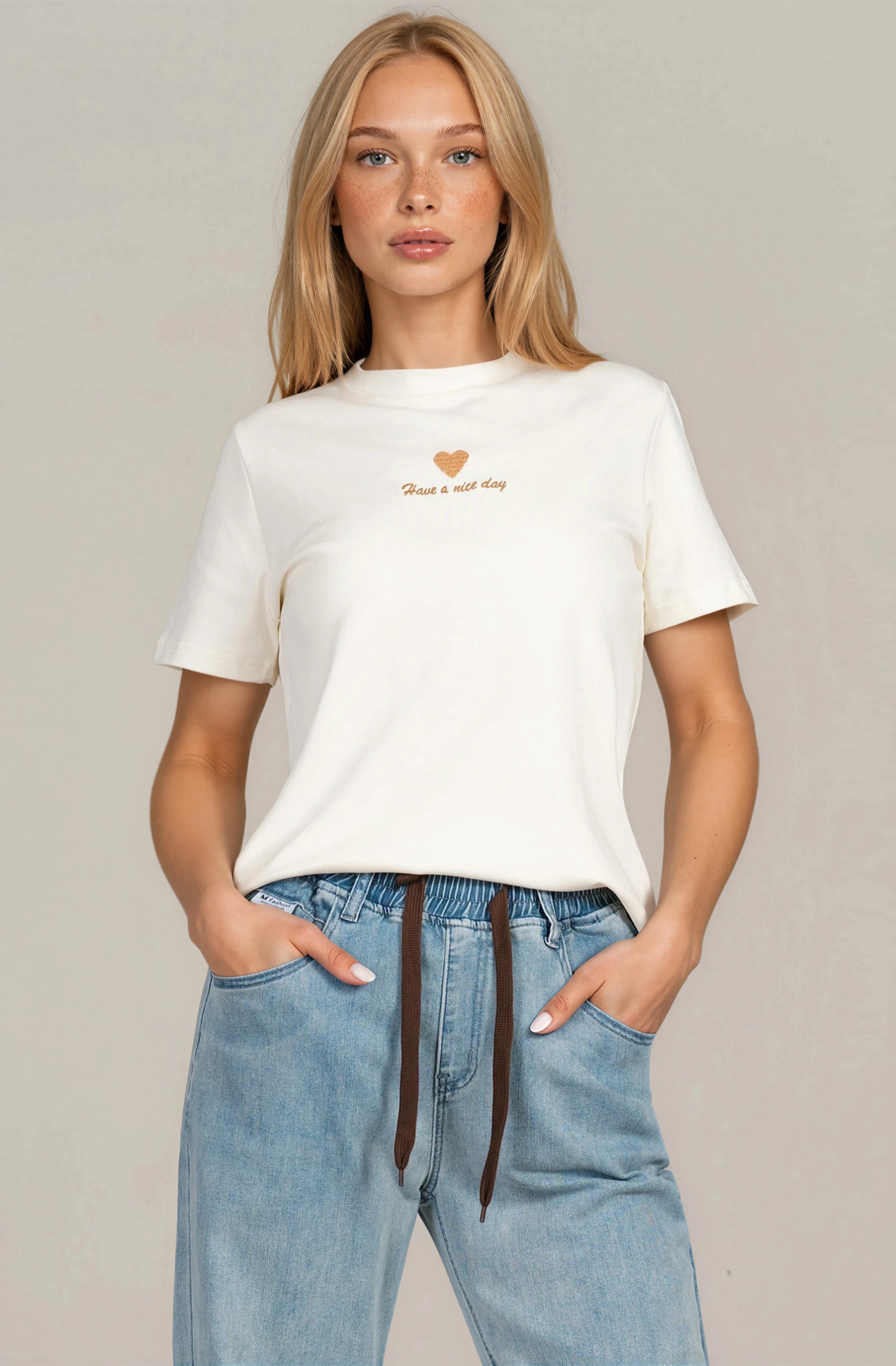 Дамска тениска от памук в бледожълто с надпис и малко сърце