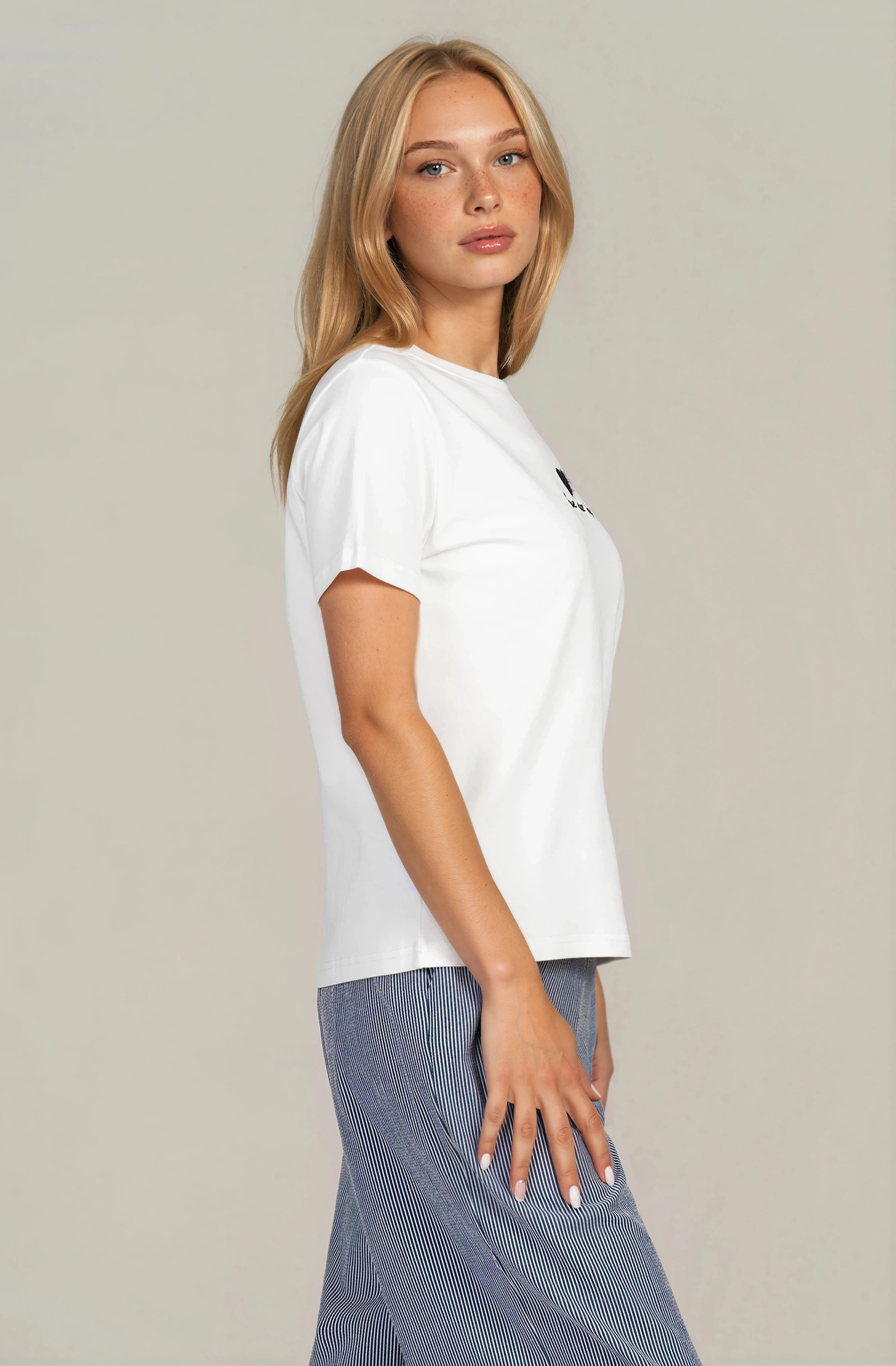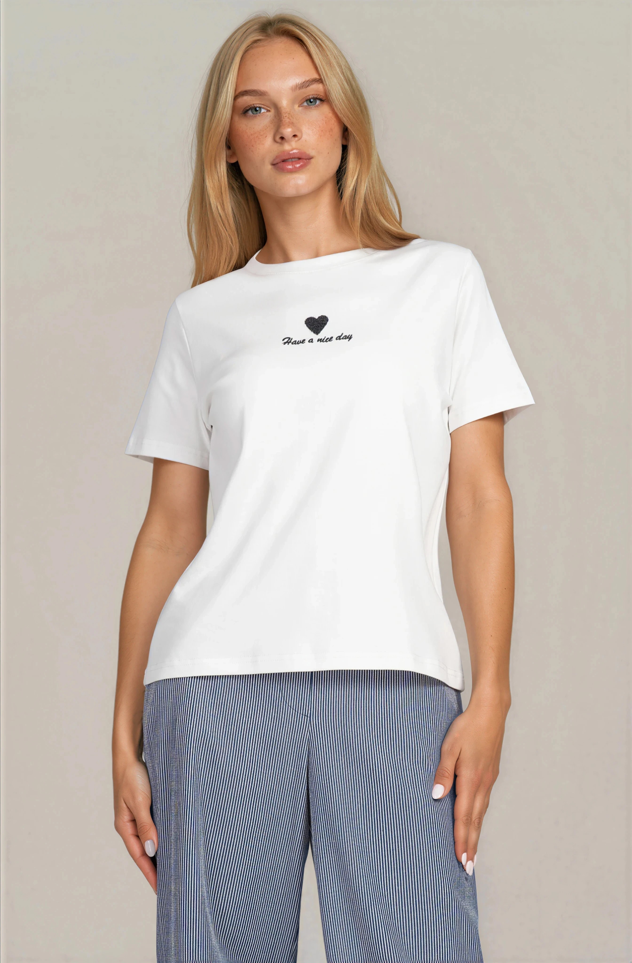 Свежа дамска тениска в бяло с деликатен надпис, която носи леко и позитивно излъчване. Памучната материя е мека, дишаща и подходяща за ежедневно носене през топлите дни. Класическата кройка с обло деколте осигурява удобство и лесно комбиниране с различни визии. Идеален избор за небрежен градски стил.