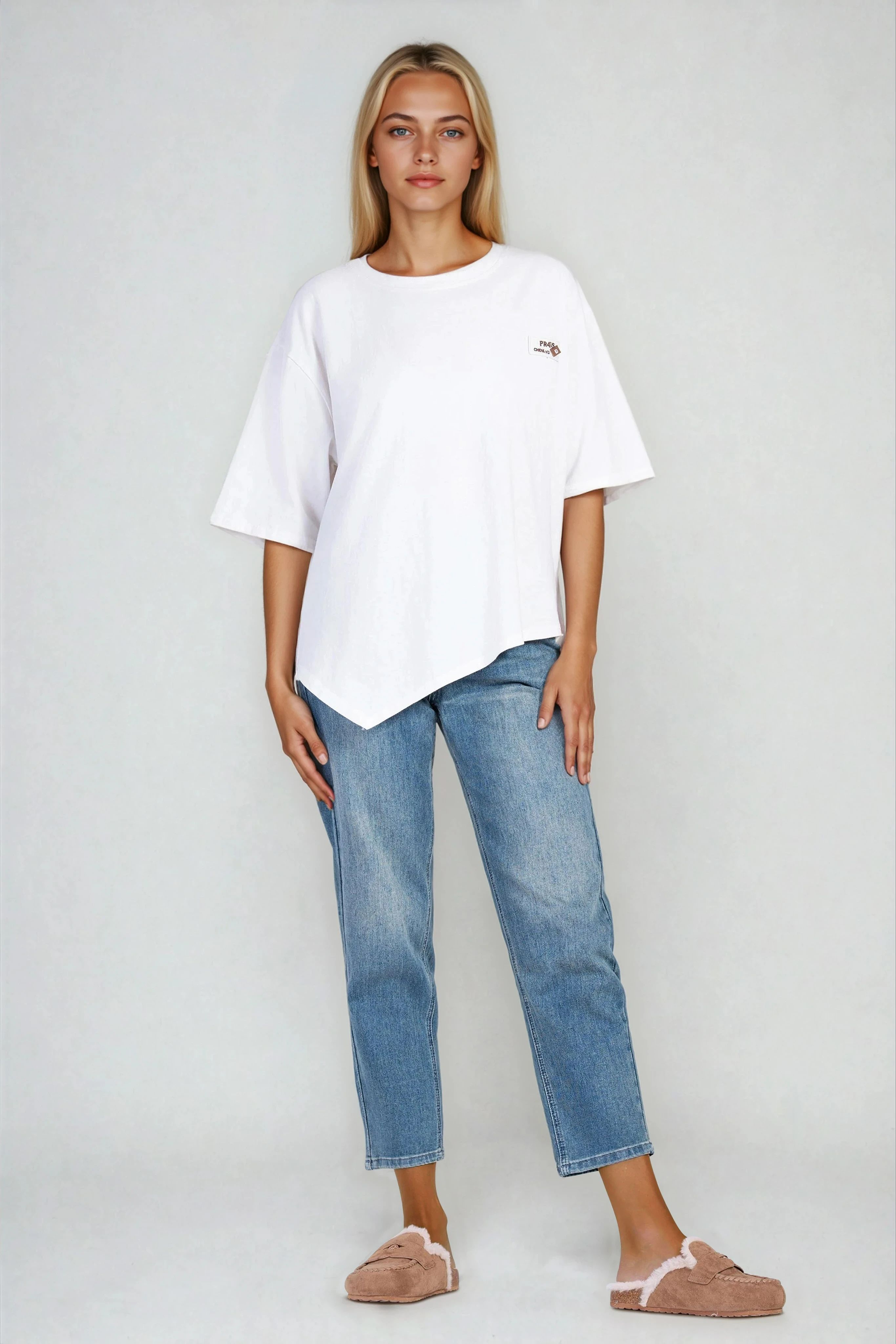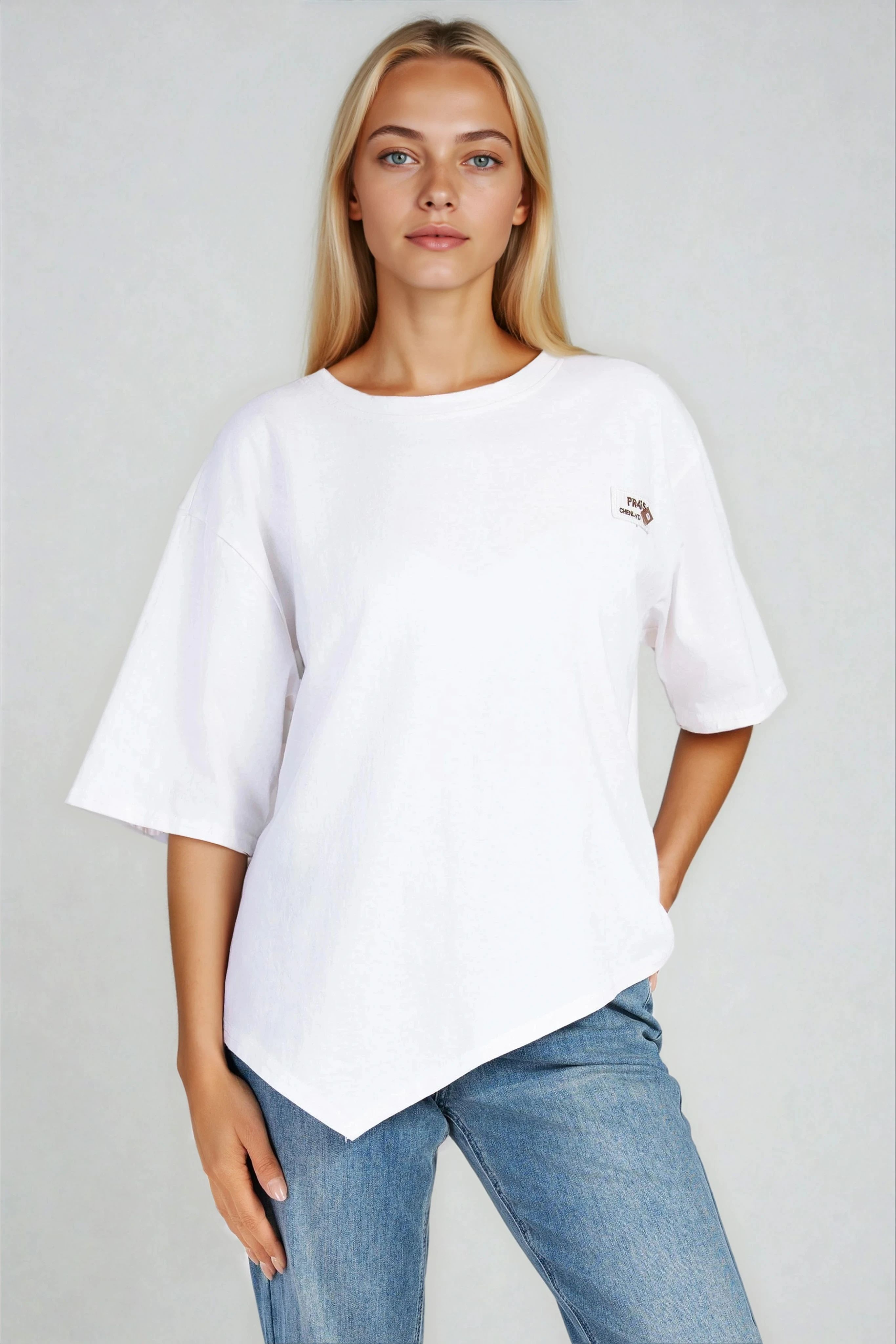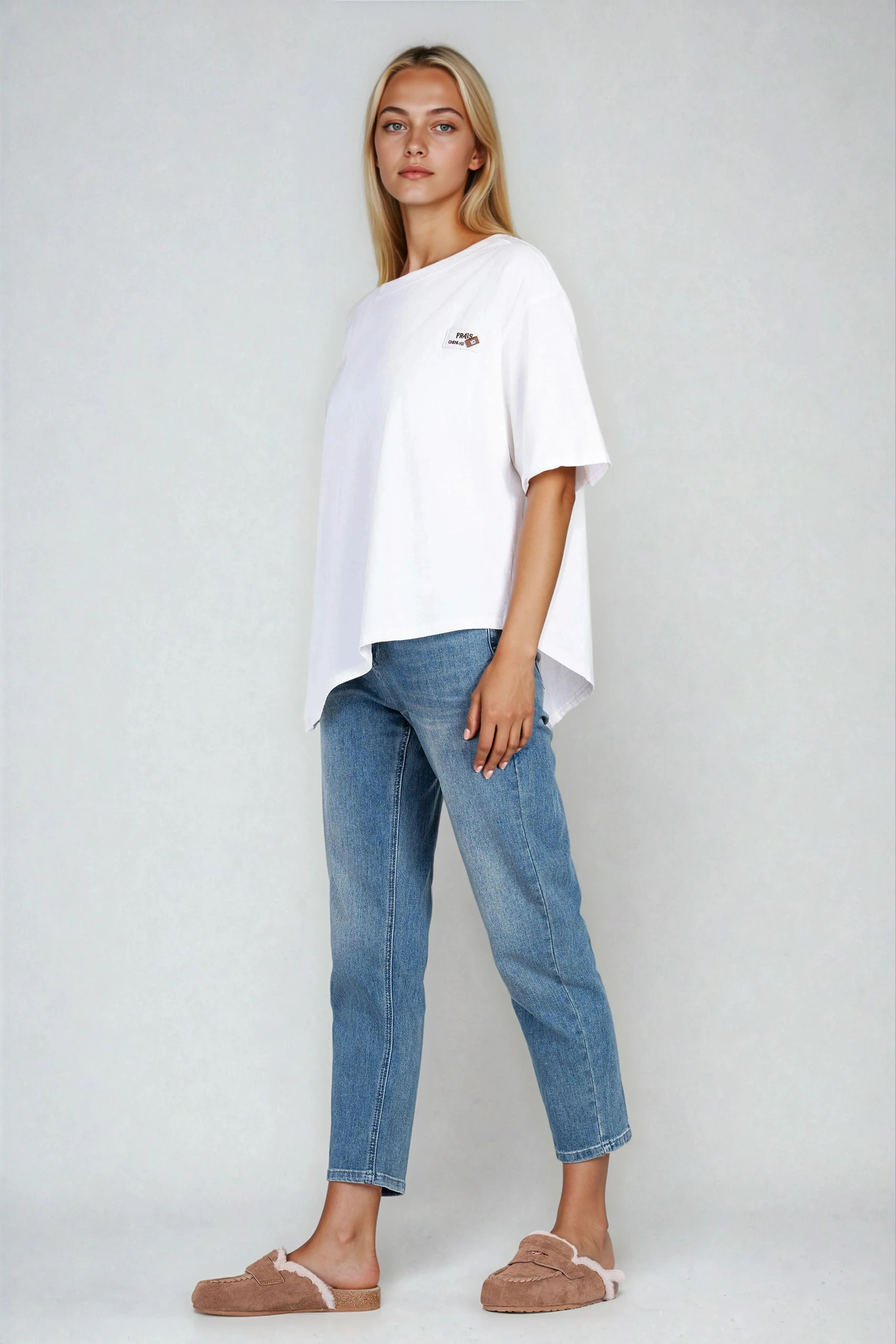 Дамска тениска от памук в бяло с обло деколте и свободна кройка
