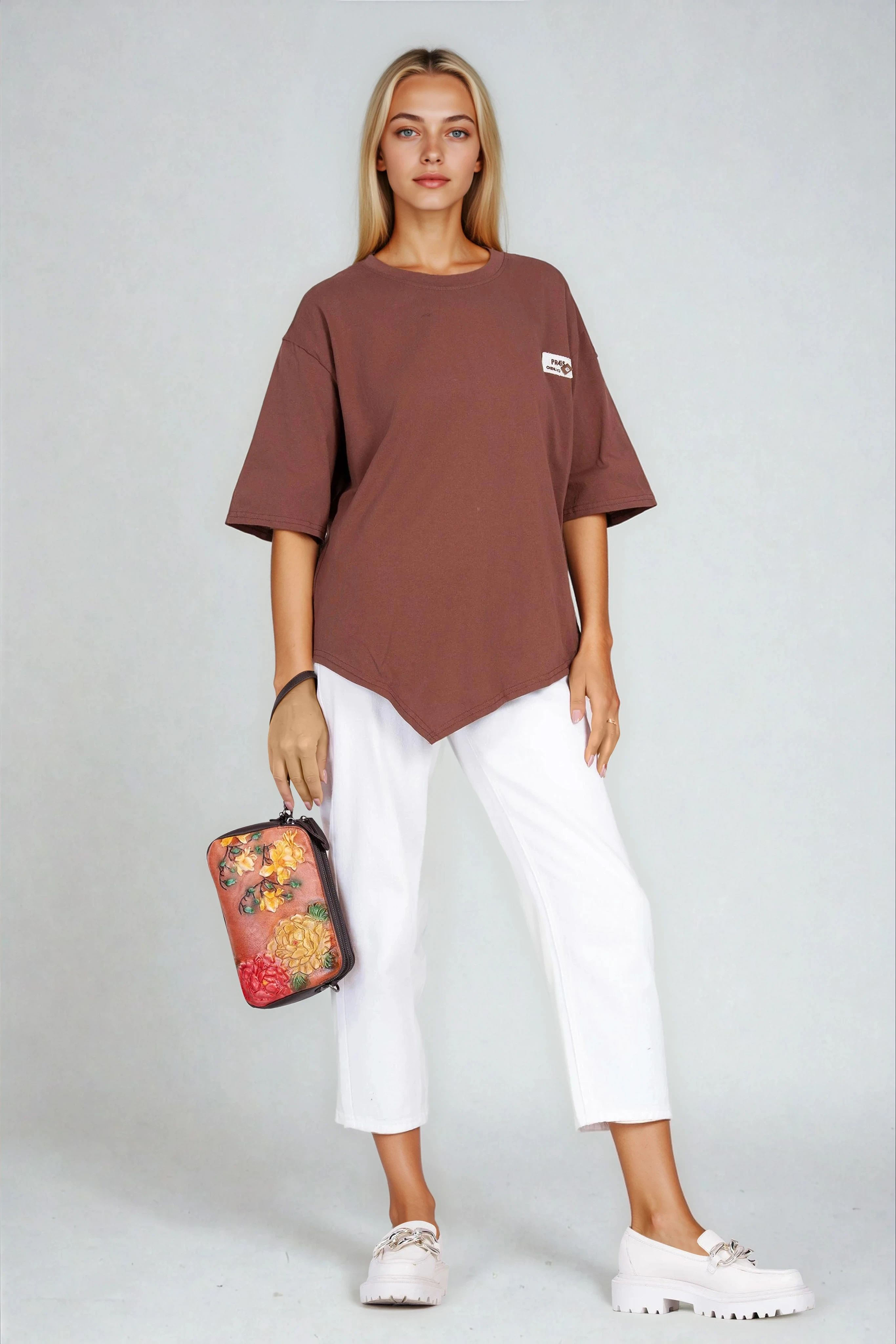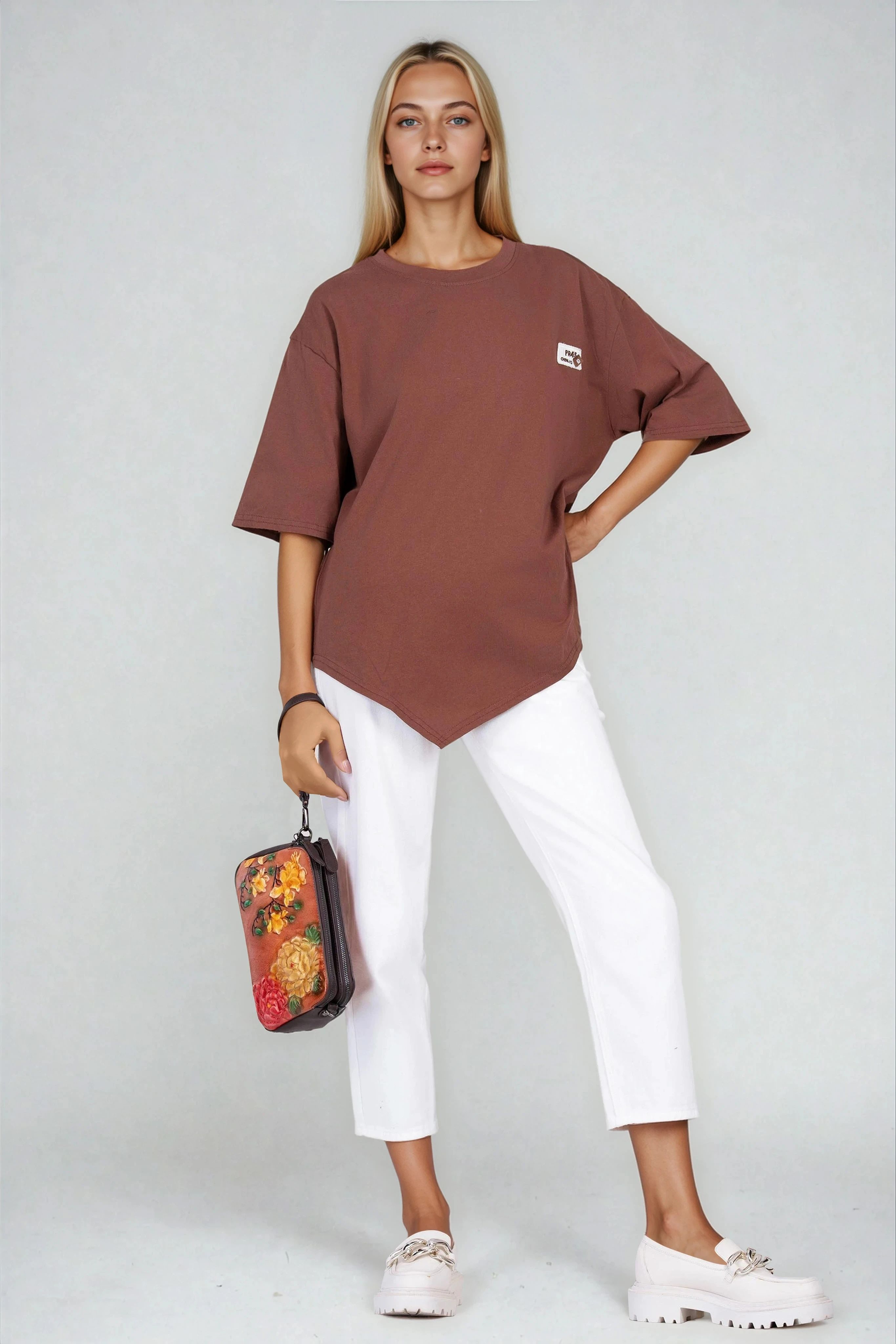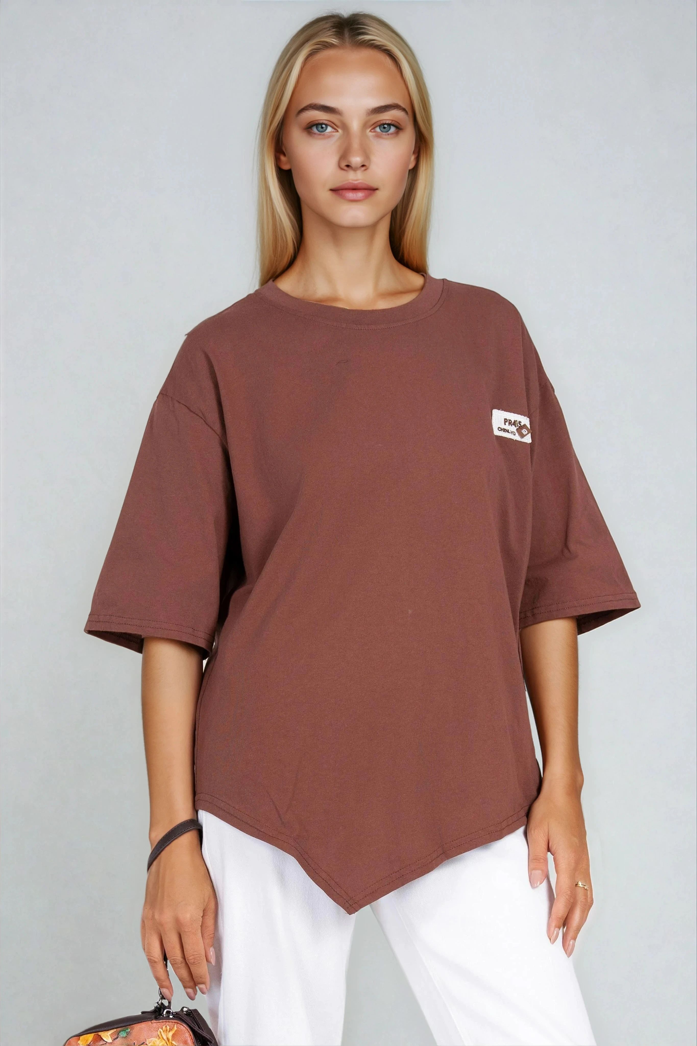 Дамска тениска от памук в кафяво с обло деколте и свободна кройка