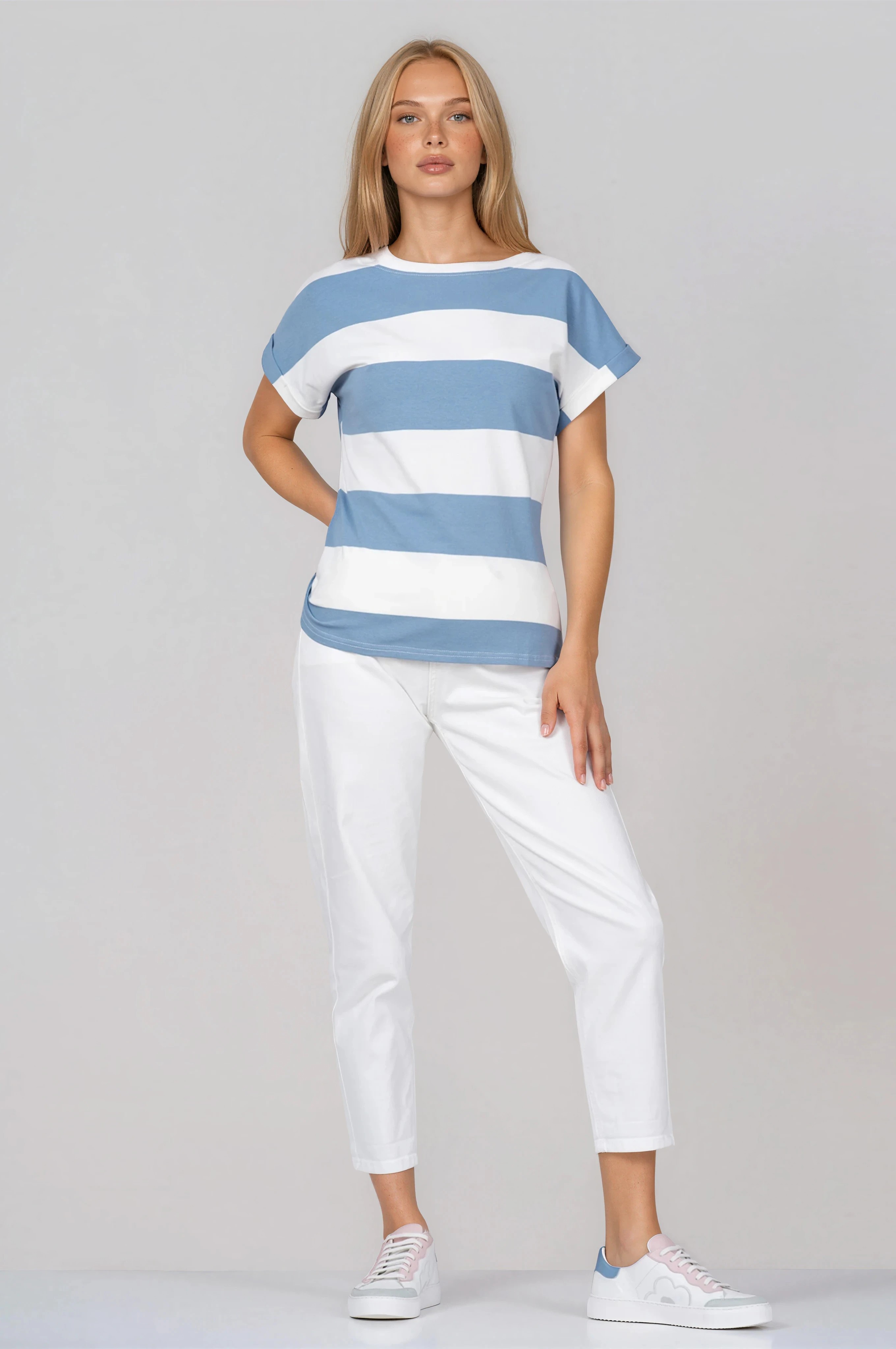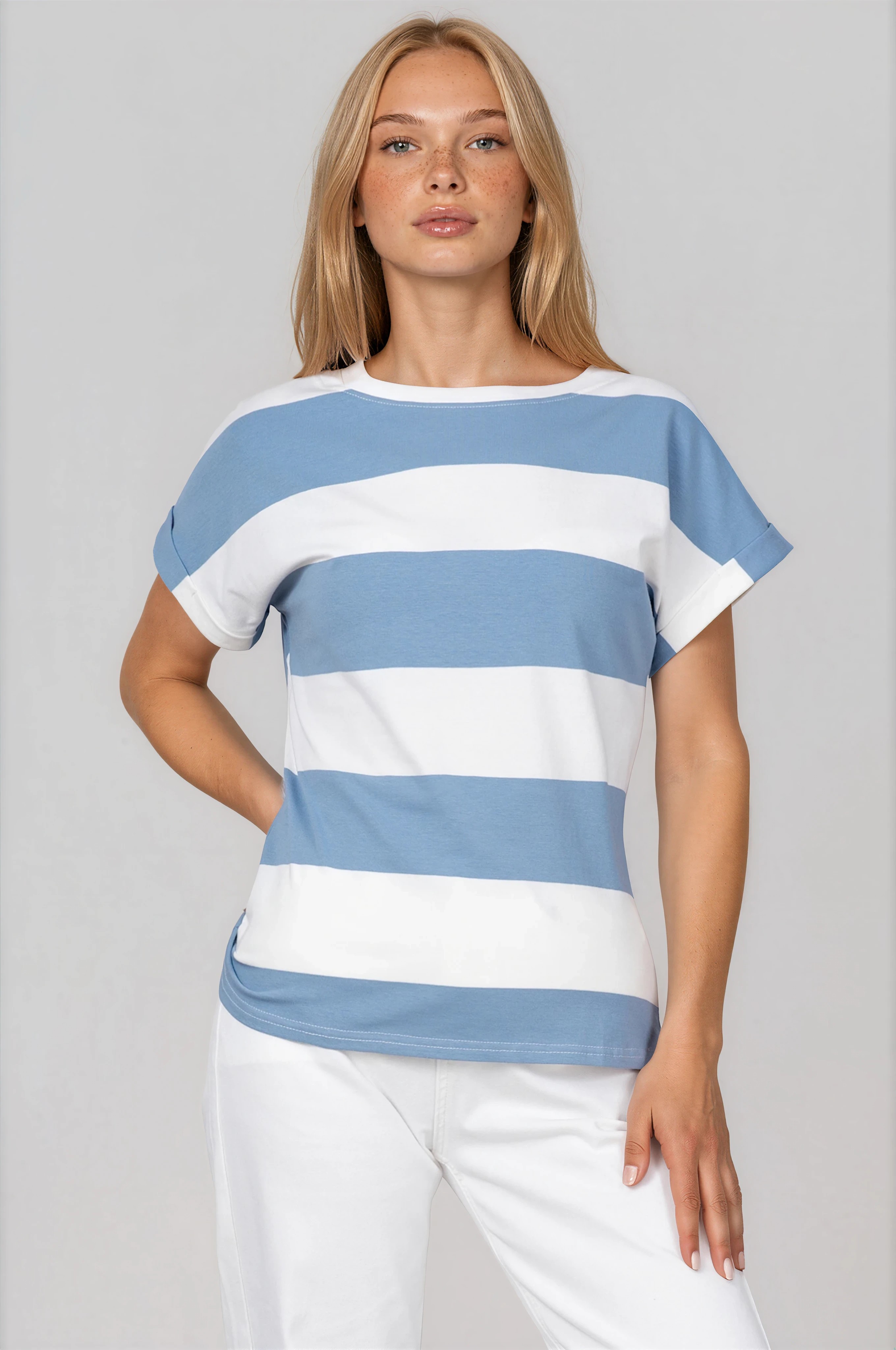 Стилна тениска с изчистена линия и акцентно хоризонтално райе за модерна визия. Меката памучна материя осигурява приятен допир и отлична проветривост. Ръкавите с маншет добавят завършен детайл, а удобната кройка позволява свобода на движение. Подходящ избор за ежедневни и ваканционни аутфити.