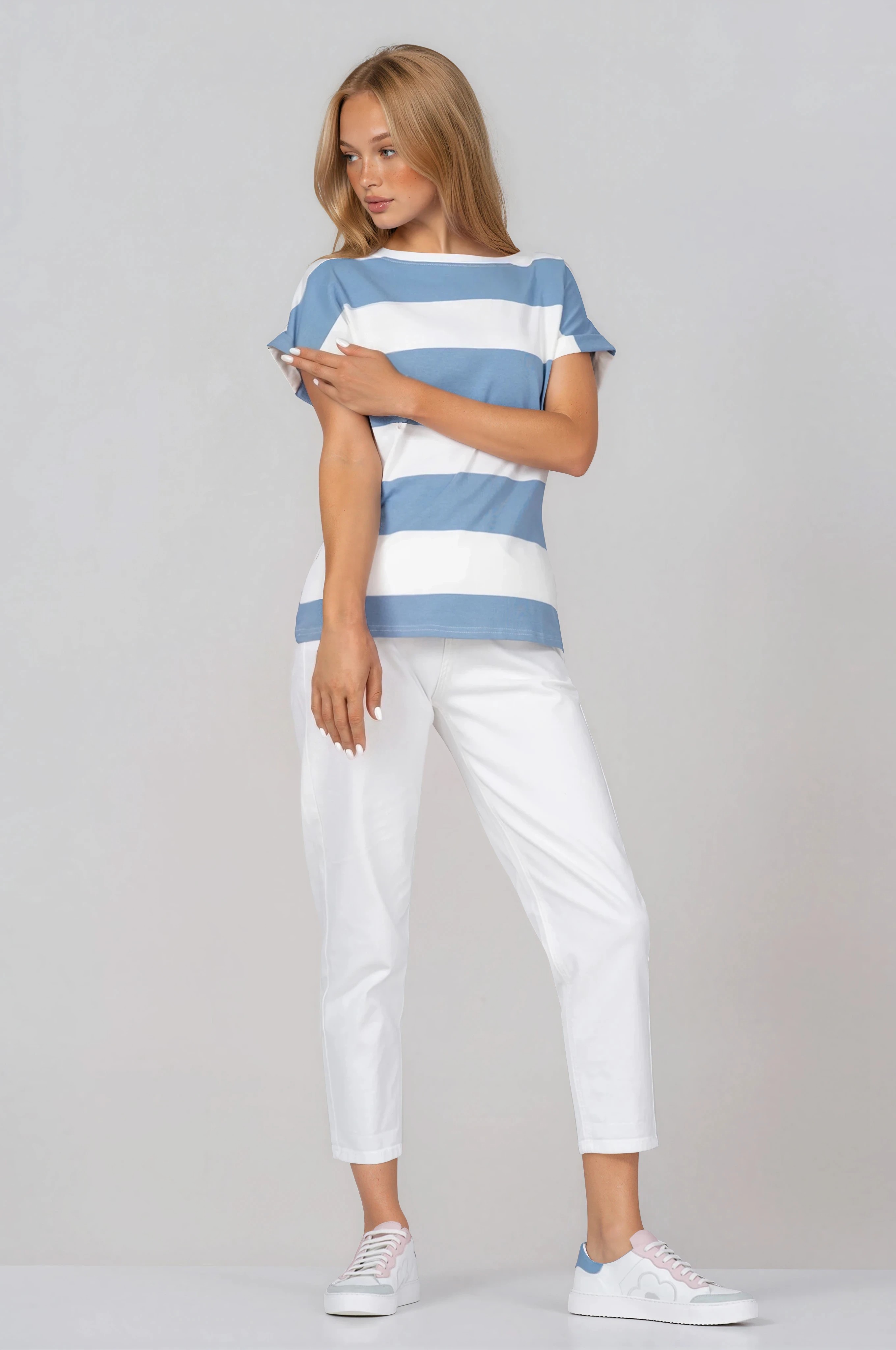 Дамска тениска със синьо-бял раиран принт