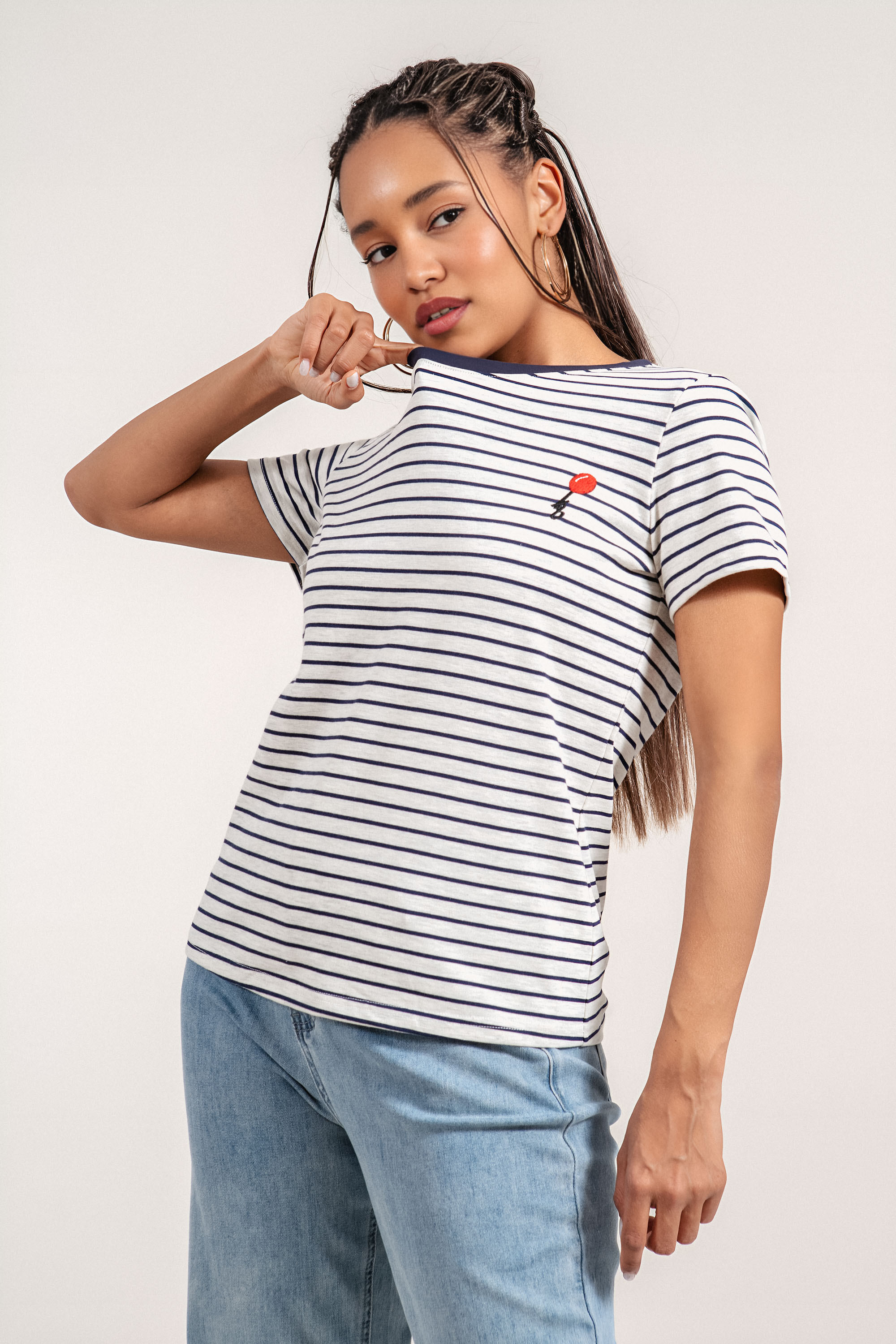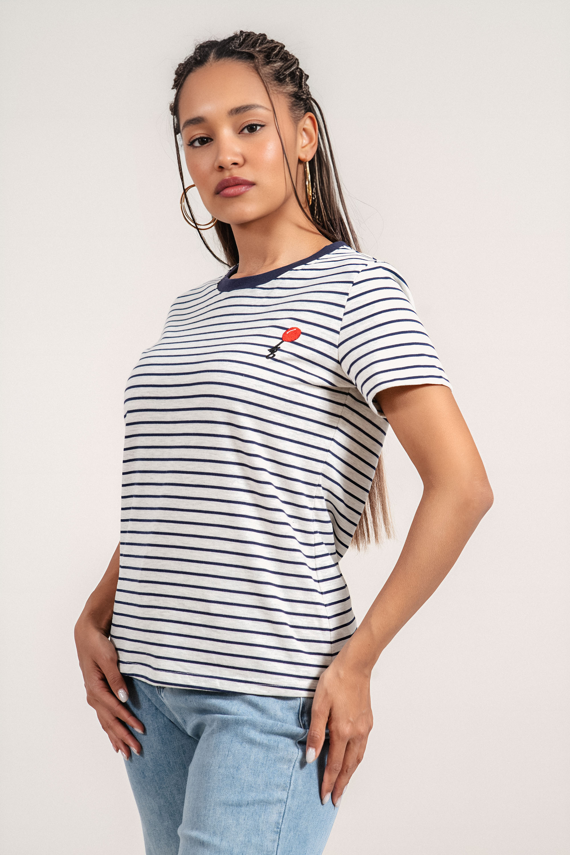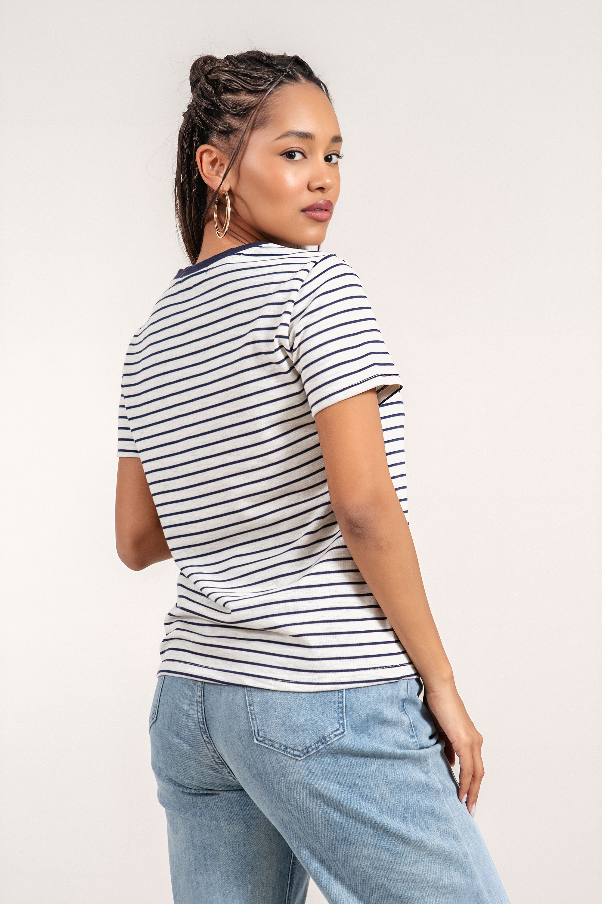 Интересна интерпретация на базовата тениска, създадена от висококачествен памук за максимално удобство. Моделът се отличава с мека текстура и приятна еластичност, която следва движенията на тялото. Фините декоративни елементи добавят стилен завършек, без да натоварват визията. Подходяща е както за ежедневни визии, така и за по-елегантни комбинации с сако или аксесоари.