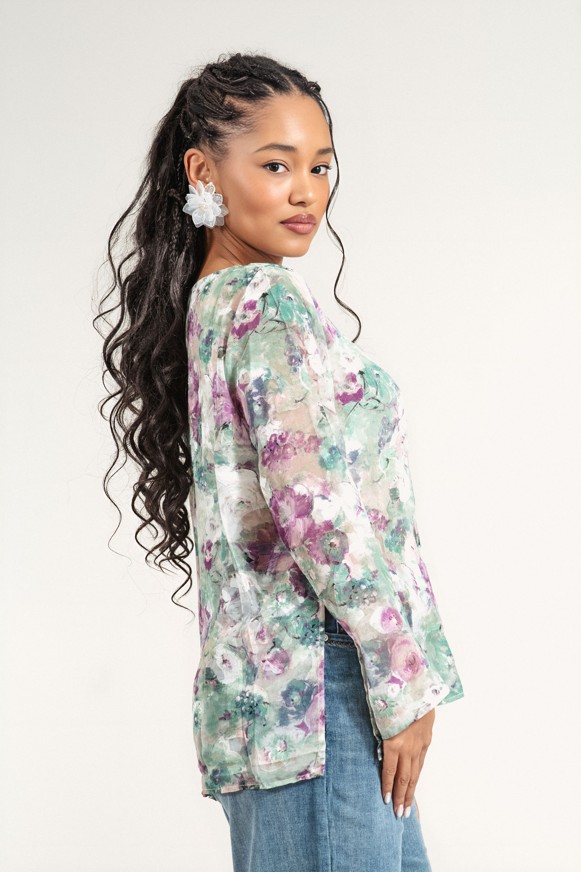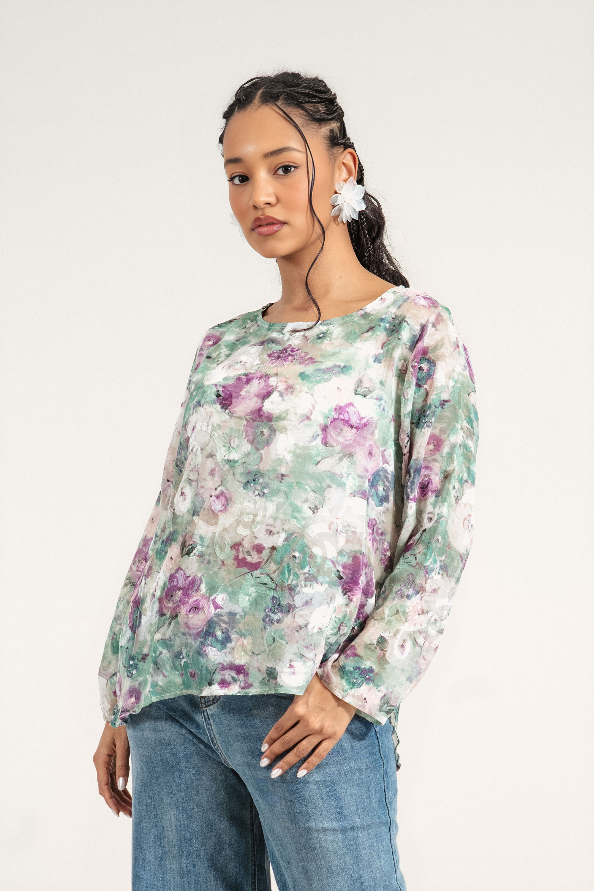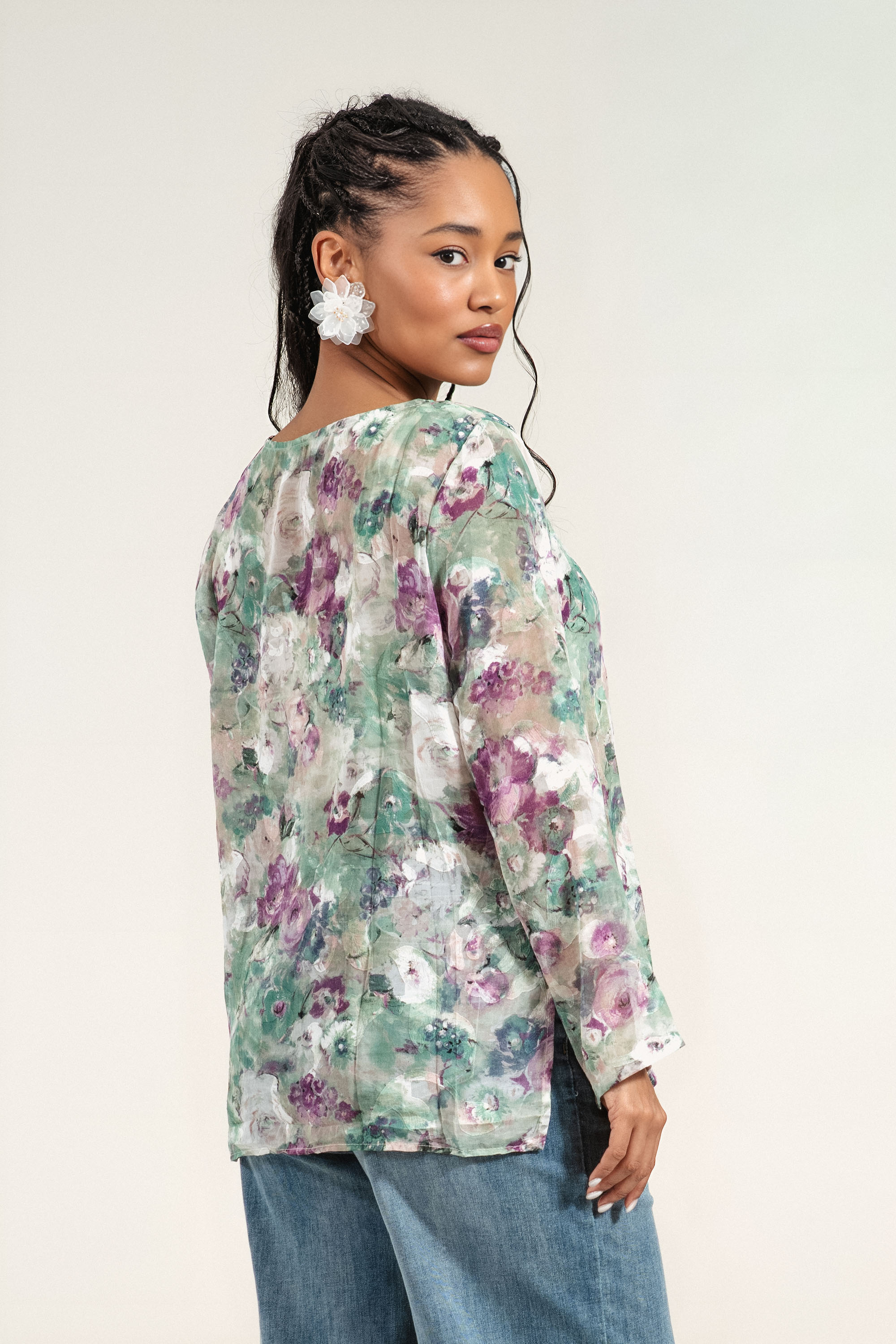 Тази лека туника с дълъг ръкав впечатлява с артистичен акварелен десен в зелено, лилаво и розово. Свободната кройка и меката материя осигуряват комфорт през целия ден, а овалното деколте придава изчистена визия. Подходяща за ежедневен стил с деним или панталон.