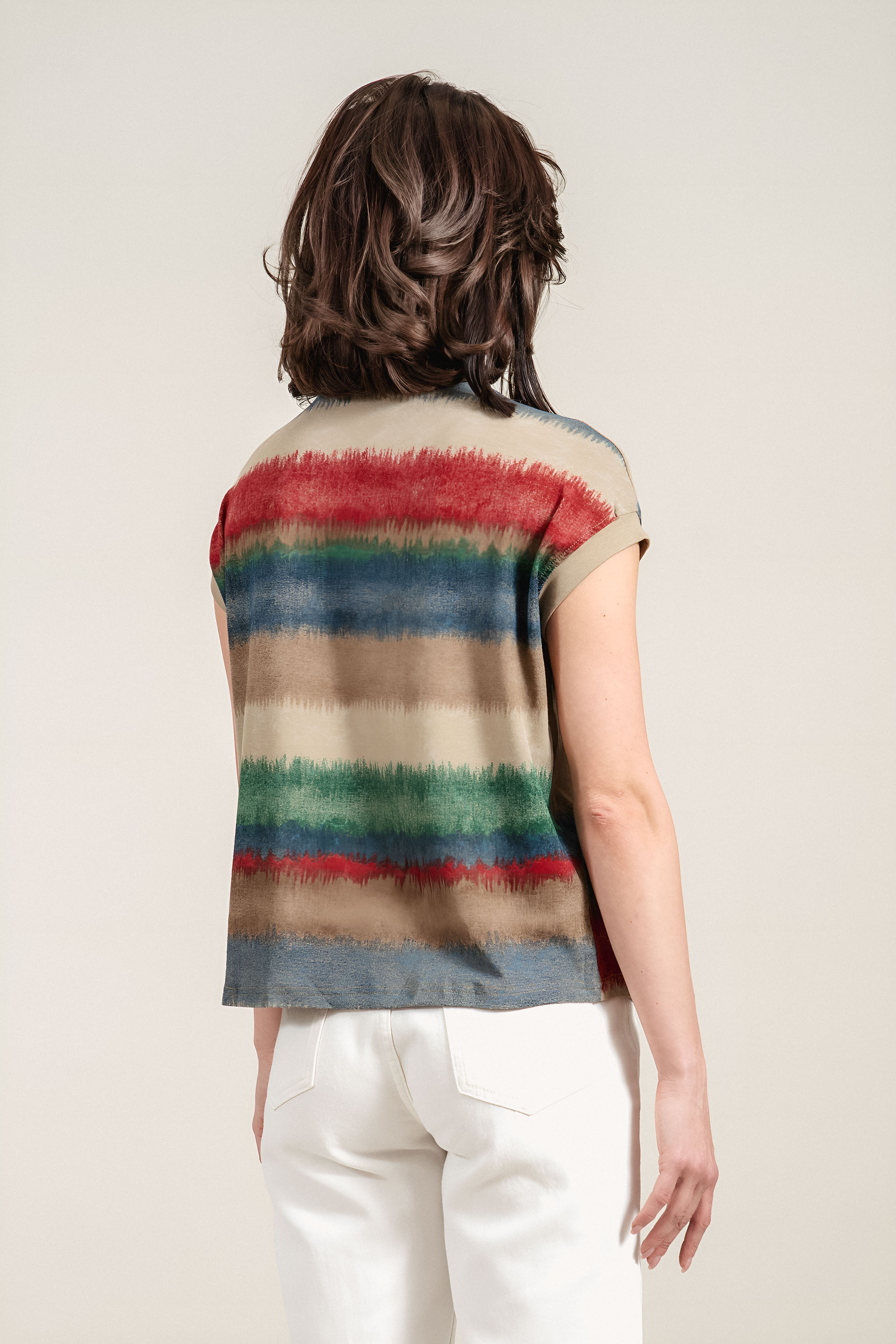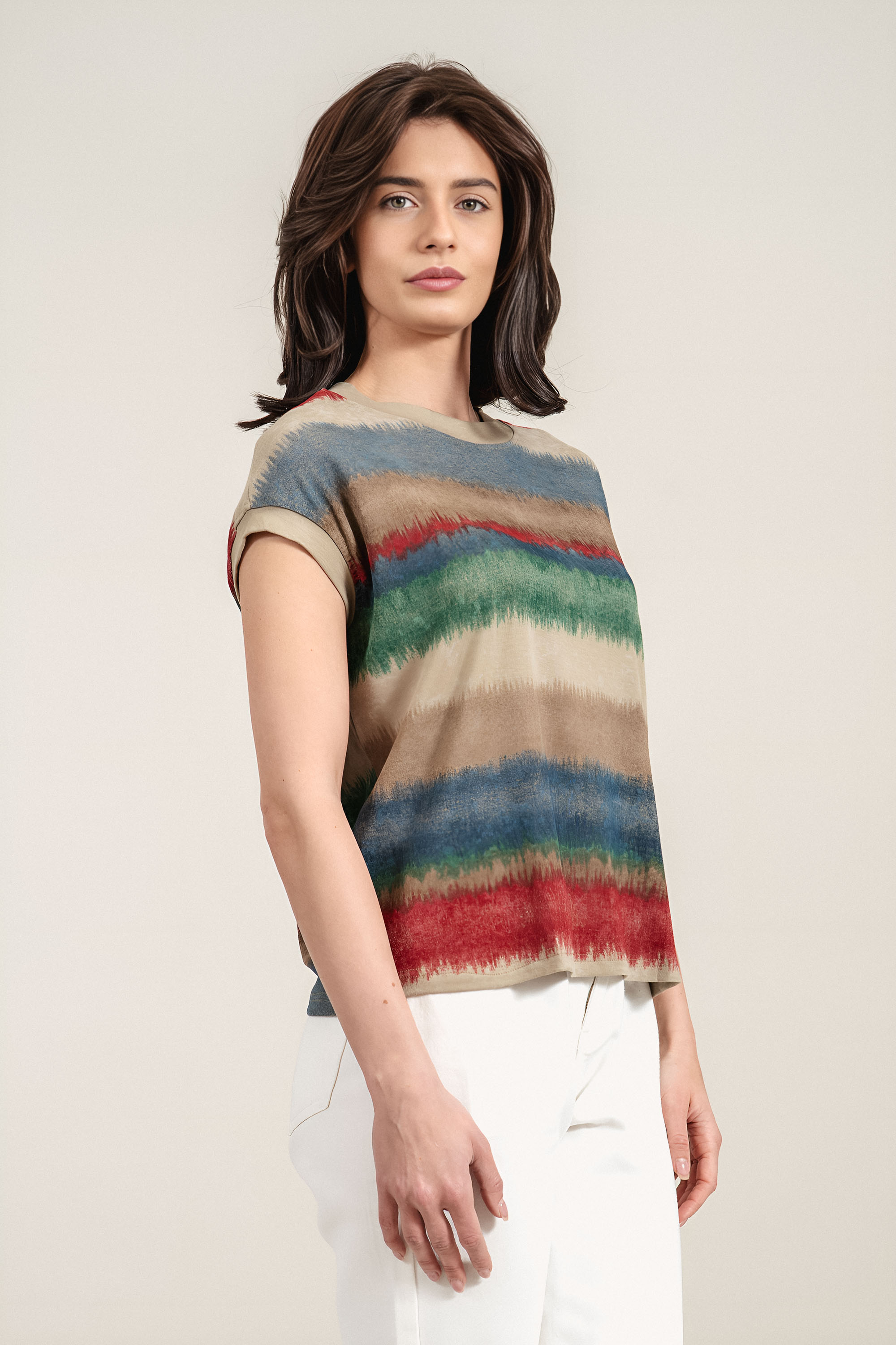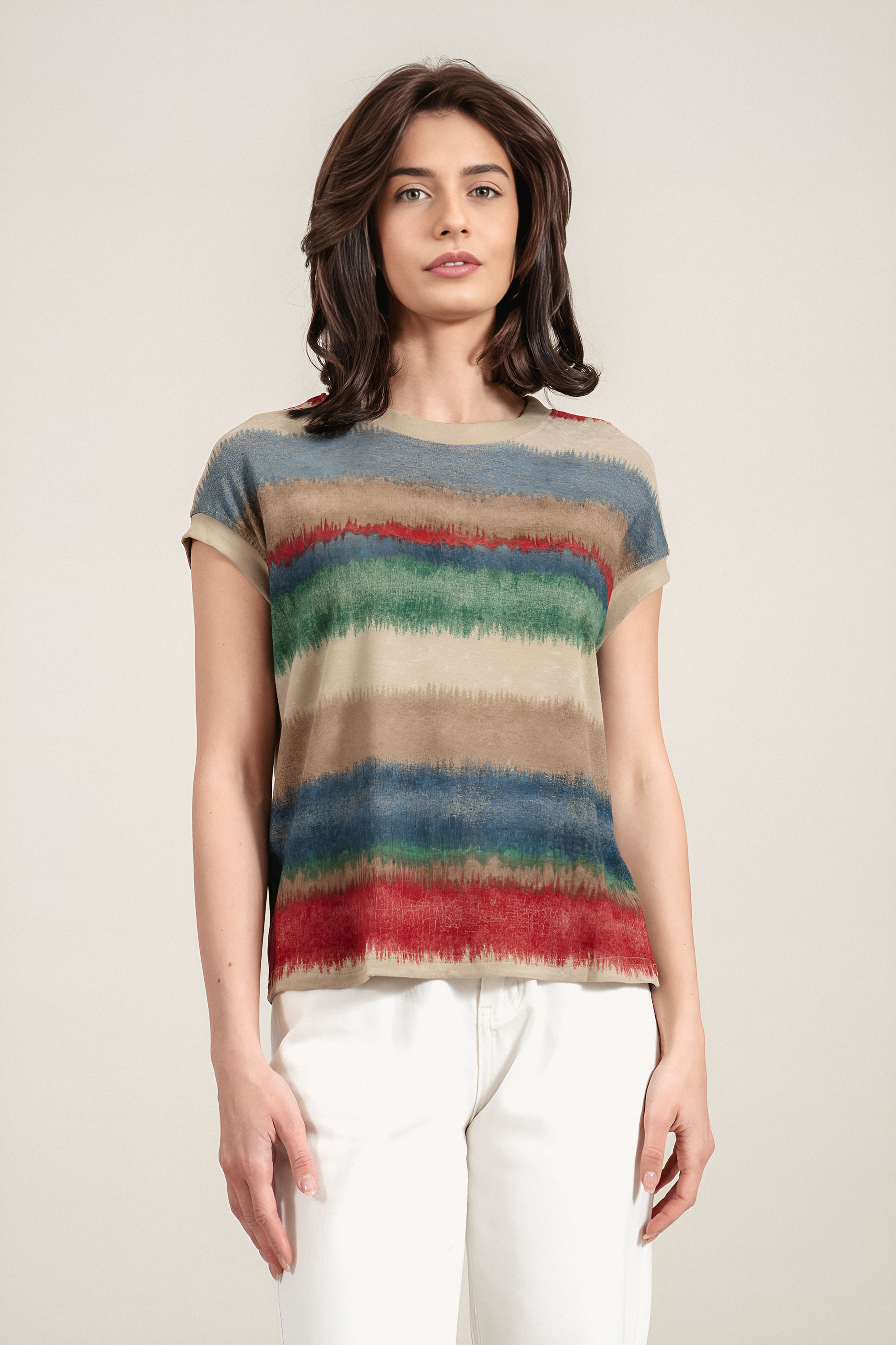 Дамска блуза с райран принт, който придава артистичен характер на визията. Материята е мека и приятна на допир, като съчетава комфорт и добра издръжливост. Свободната кройка осигурява лекота и удобство при носене през целия ден. Моделът е подходящ за модерни ежедневни комбинации с изчистени долни части.