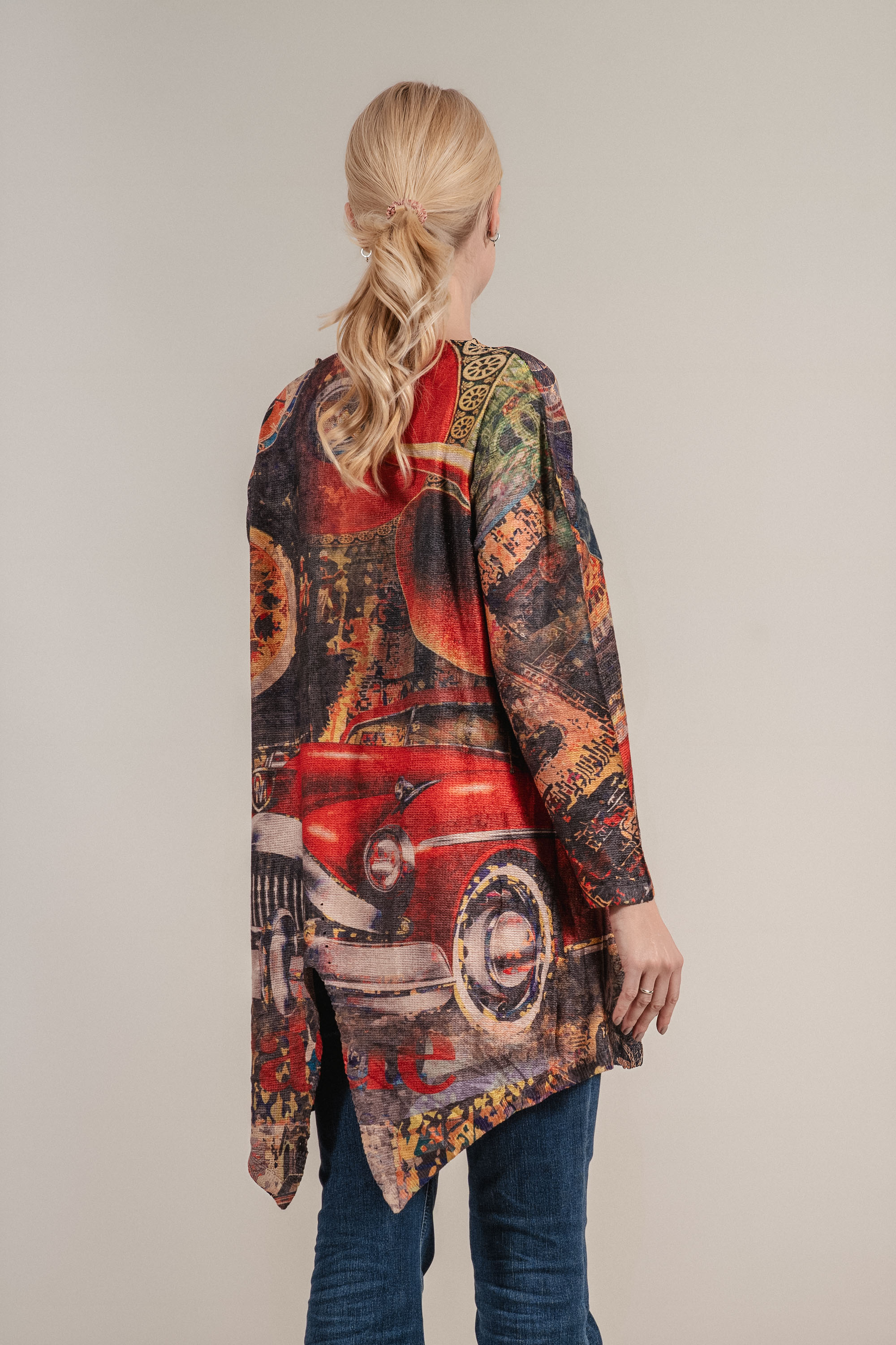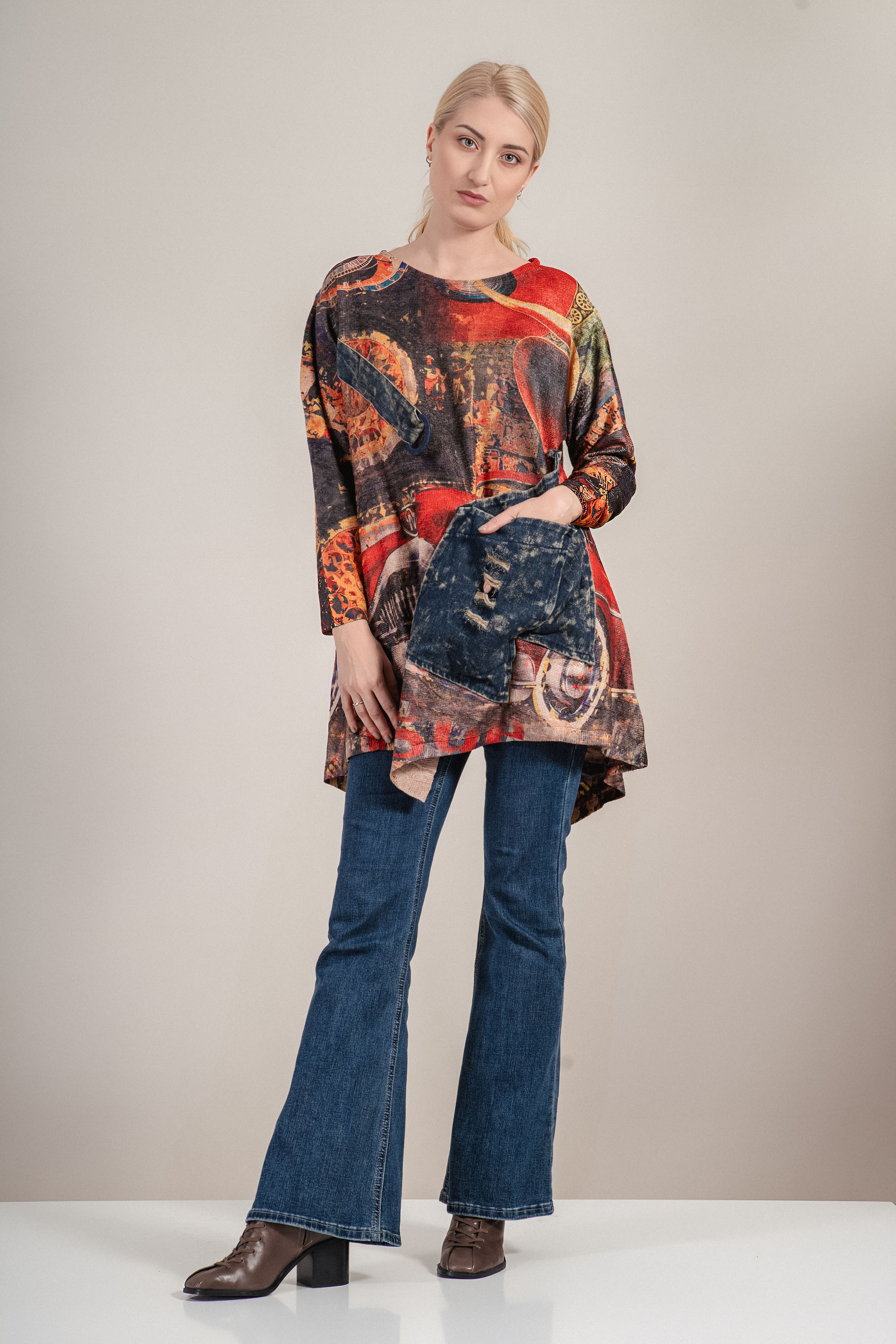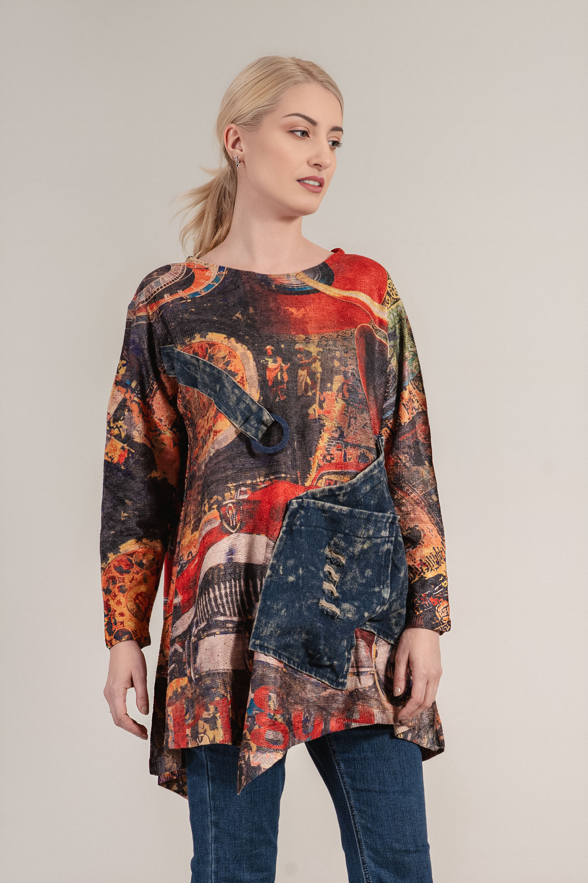 Артистична туника с нестандартна кройка и изразителен цветен принт в тонове на синьо, оранжево и червено. Моделът се отличава с асиметричен подгъв, кръгло деколте и интересни акценти като голям джоб от деним и декоративен колан с тока. Изработена от мека материя с лека структура, тази рокля е чудесен избор за всекидневен стил с характер.