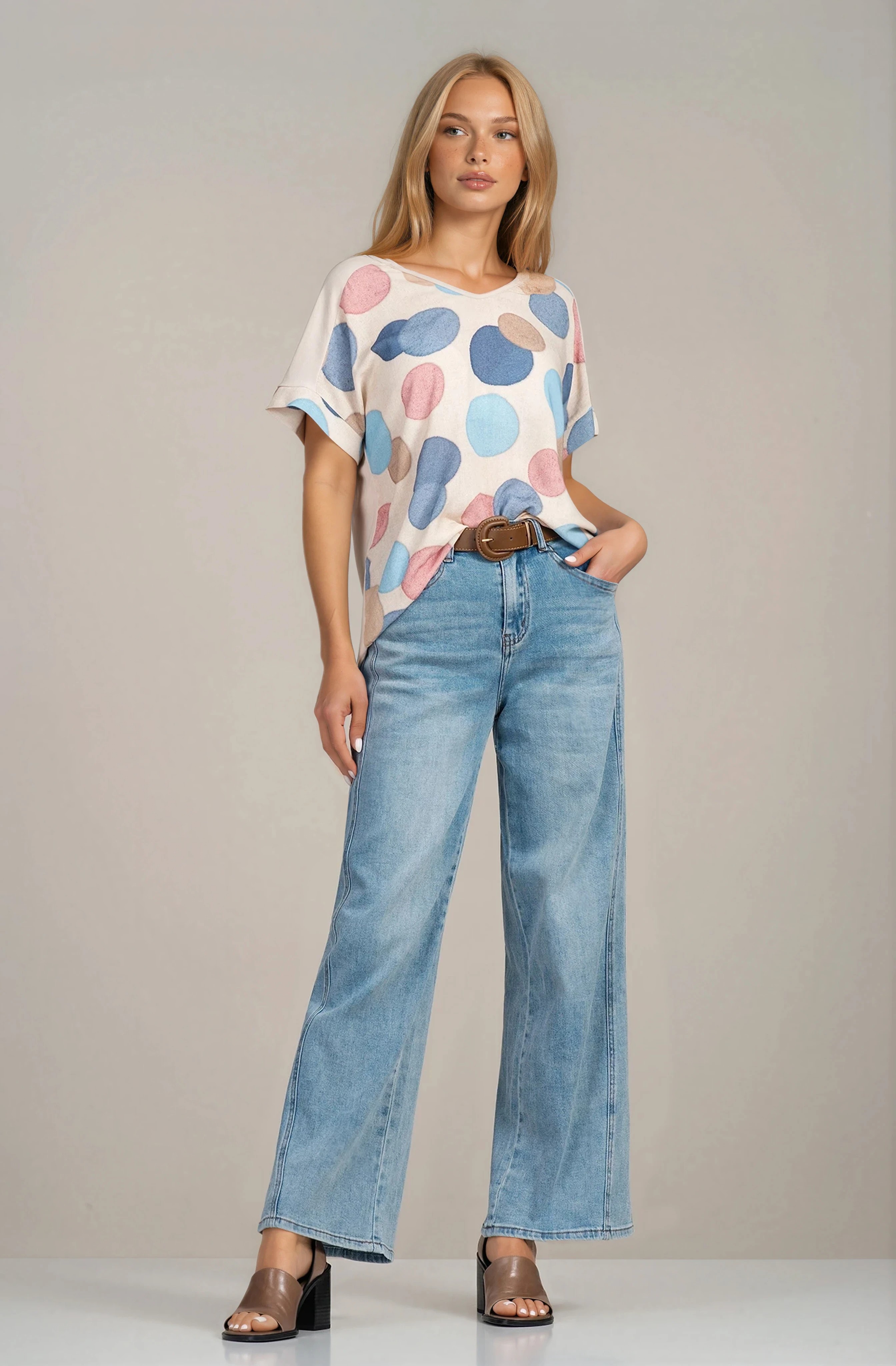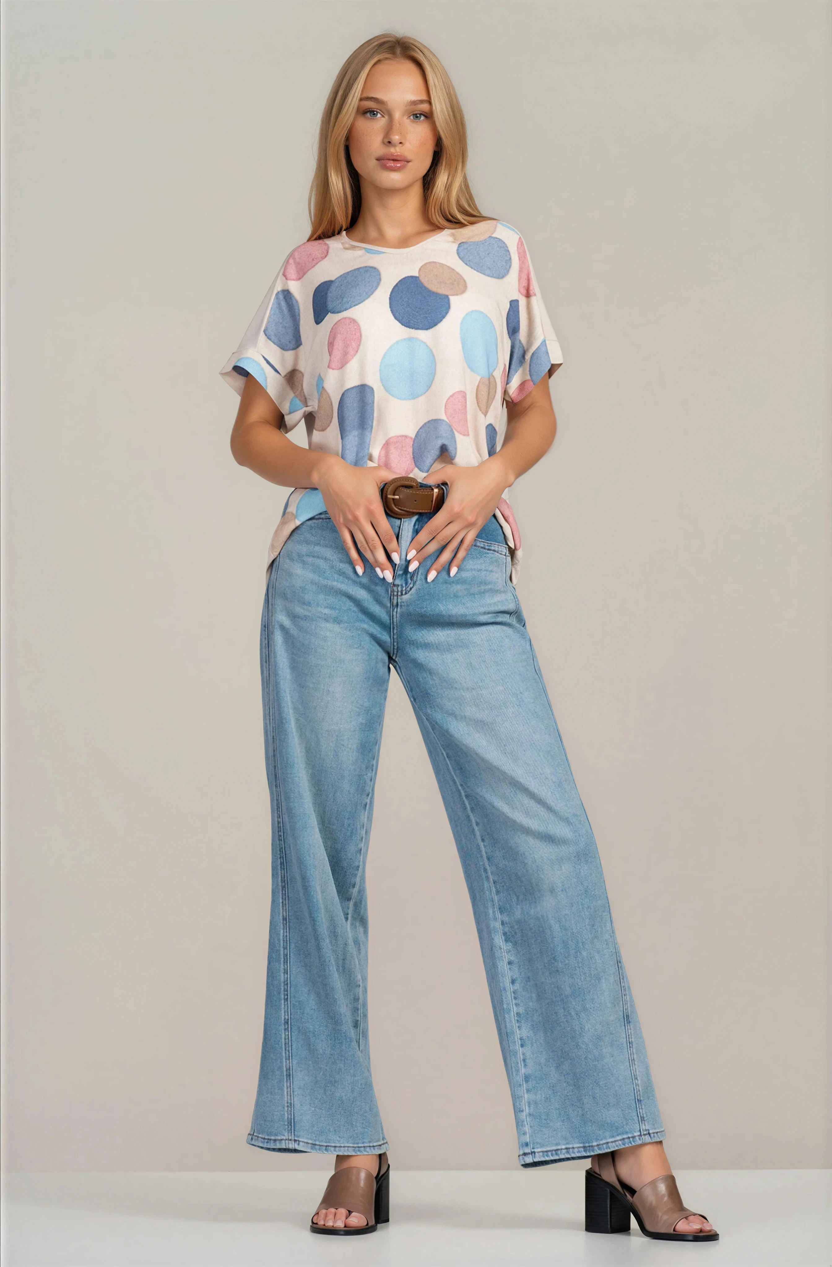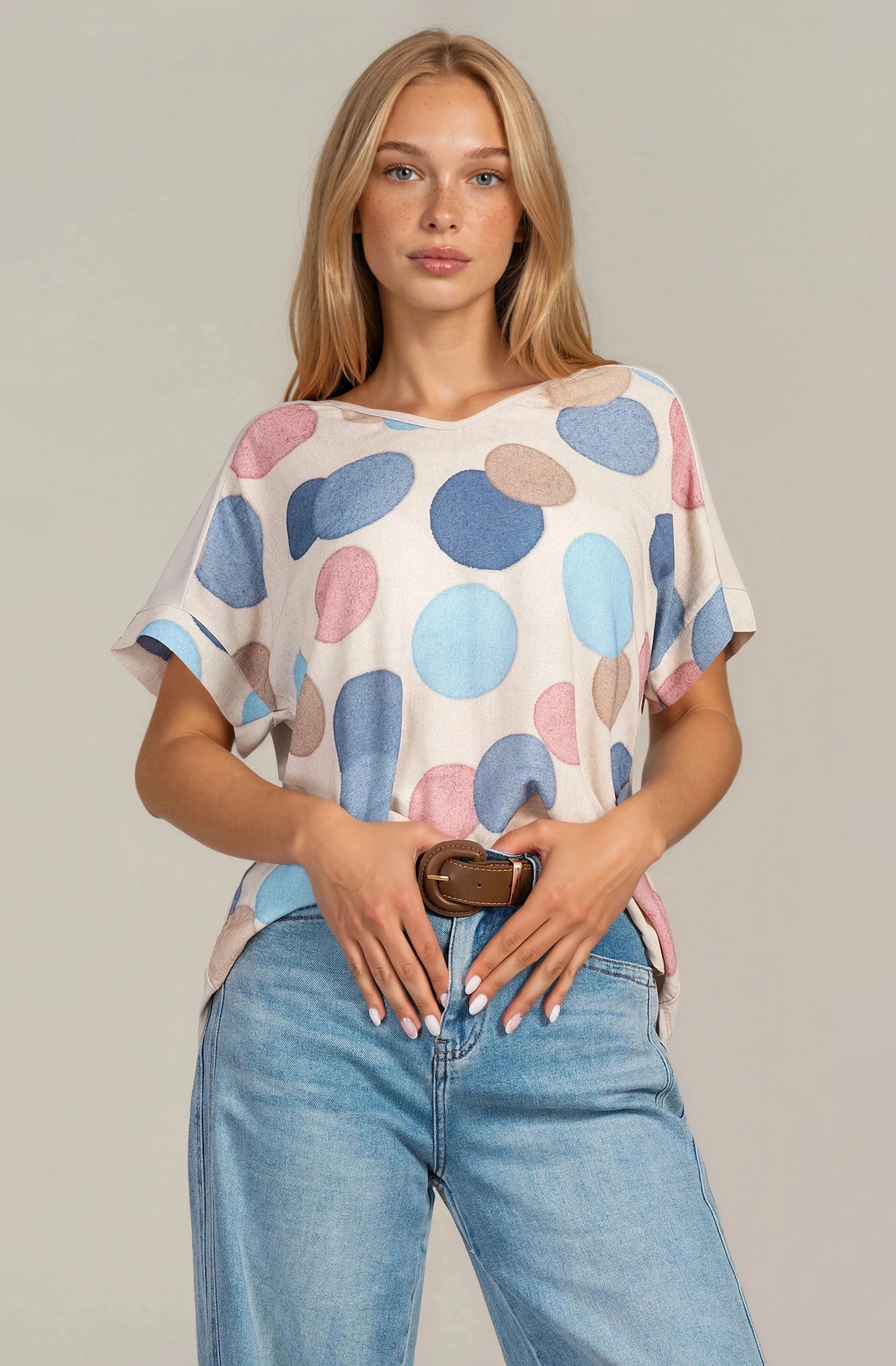 Дамска туника със свобден силует и принт сини и розови кръгове