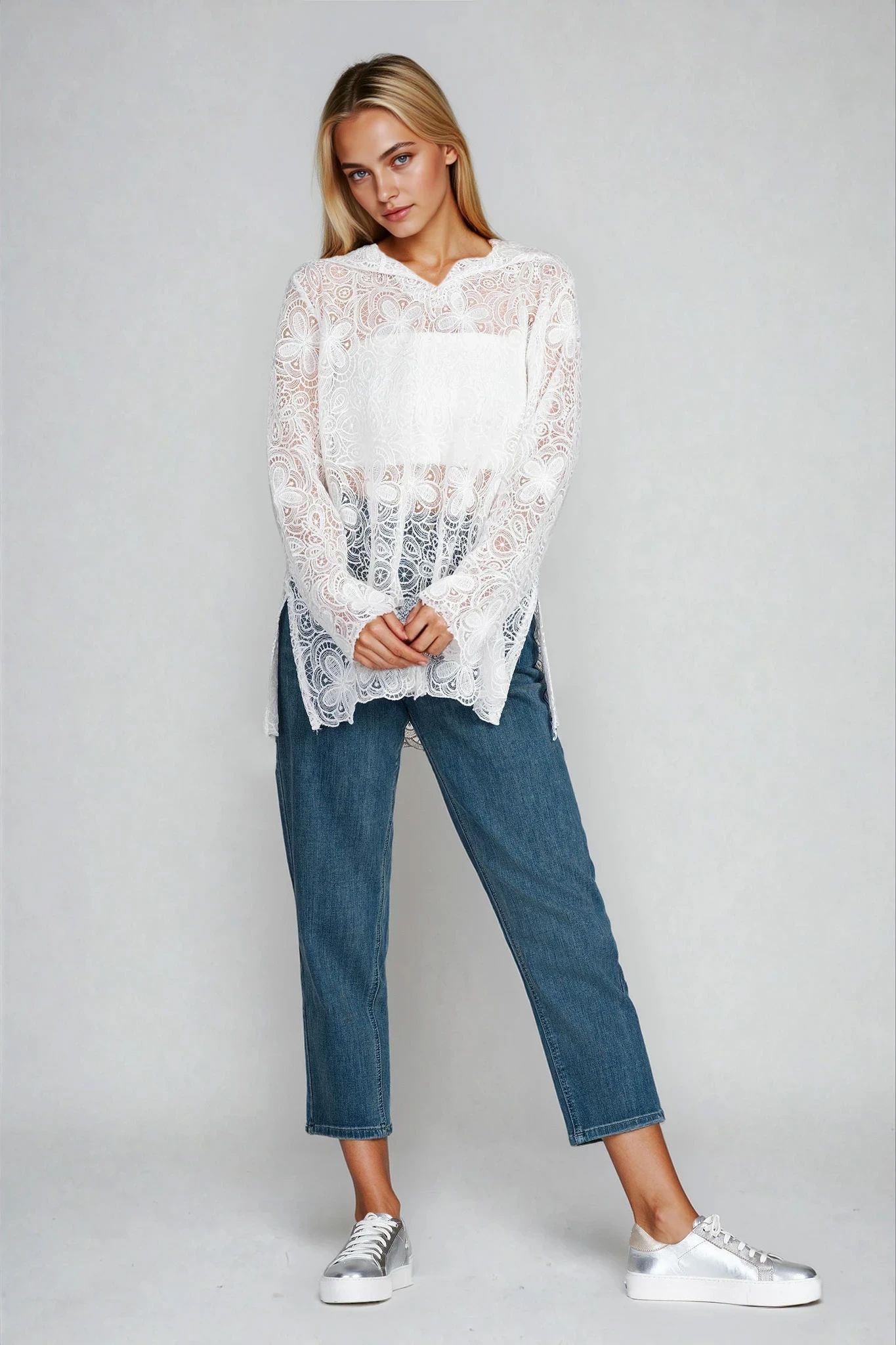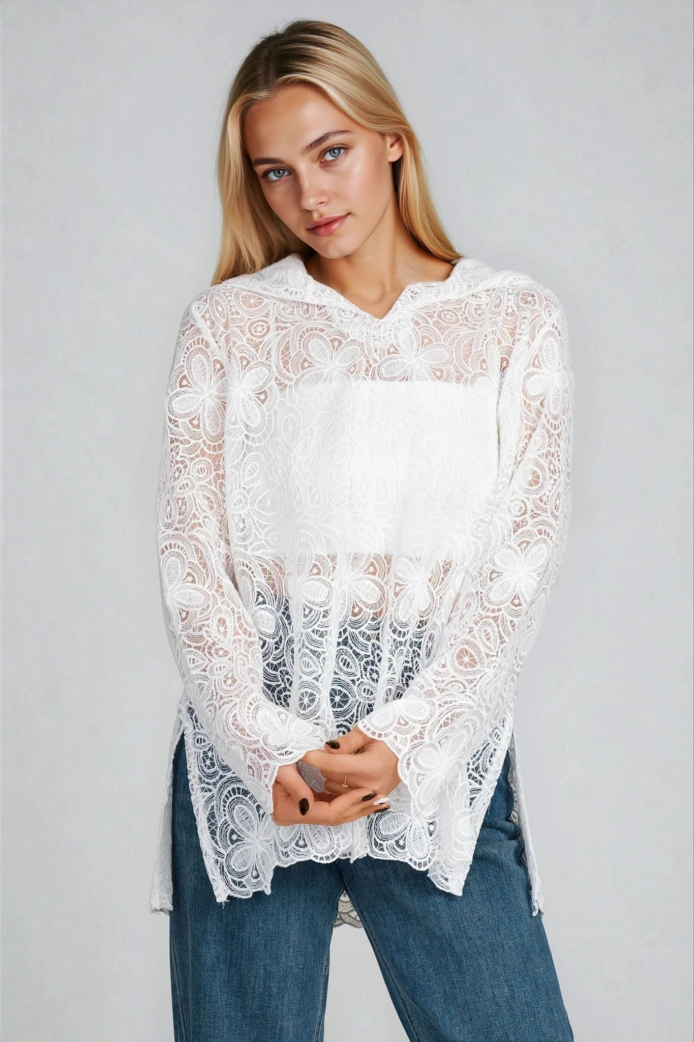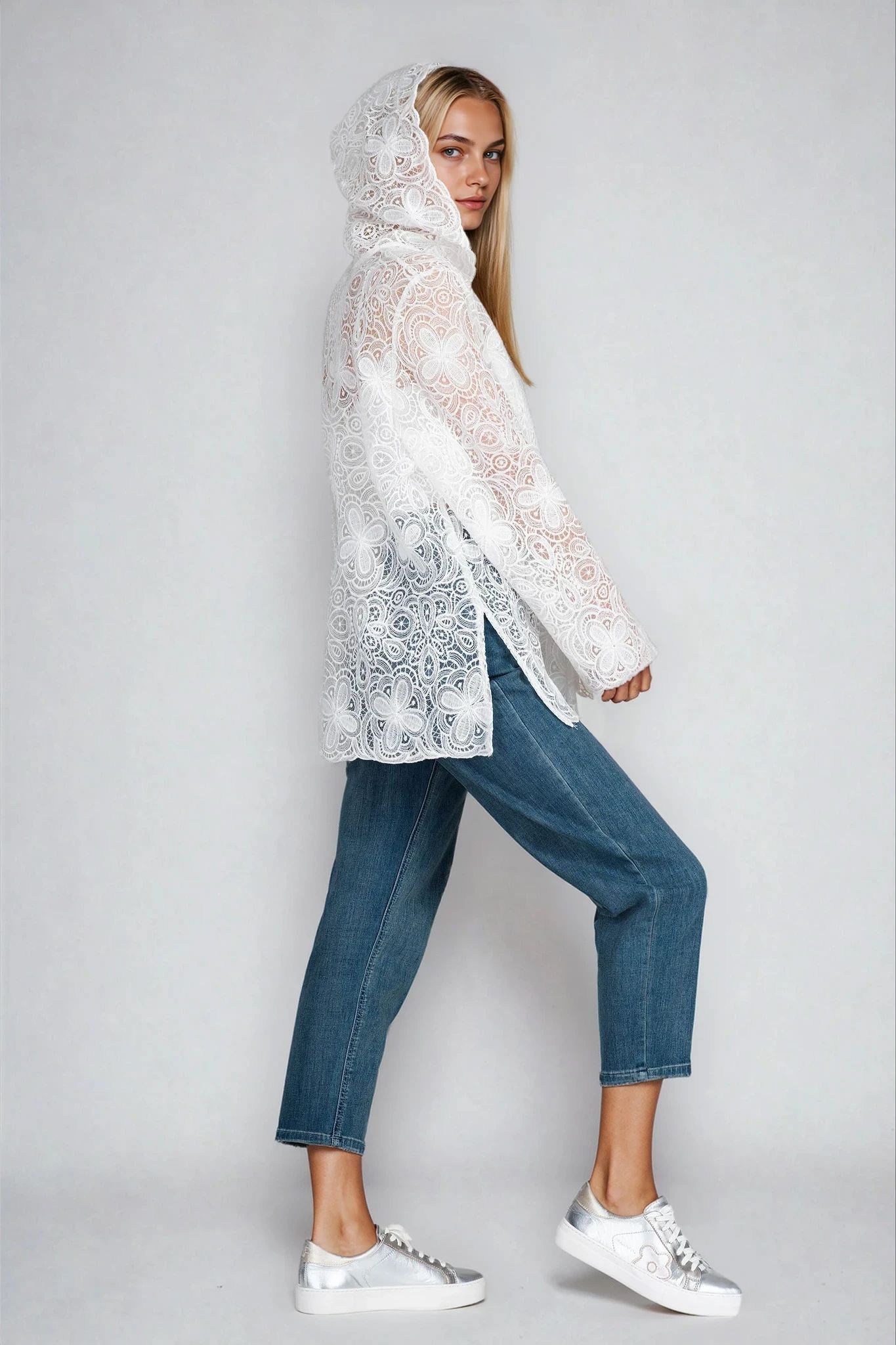 Фина блуза с ефектна текстура, подчертана от етно-флорални орнаменти с рязана дантела. Моделът е с качулка и дълъг ръкав, съчетаващи романтика и артистичен дух. Цветът в бяло допринася за елегантната визия, която се комбинира отлично с дънки или едноцветен панталон. Идеална за пролетта и хладни летни вечери.