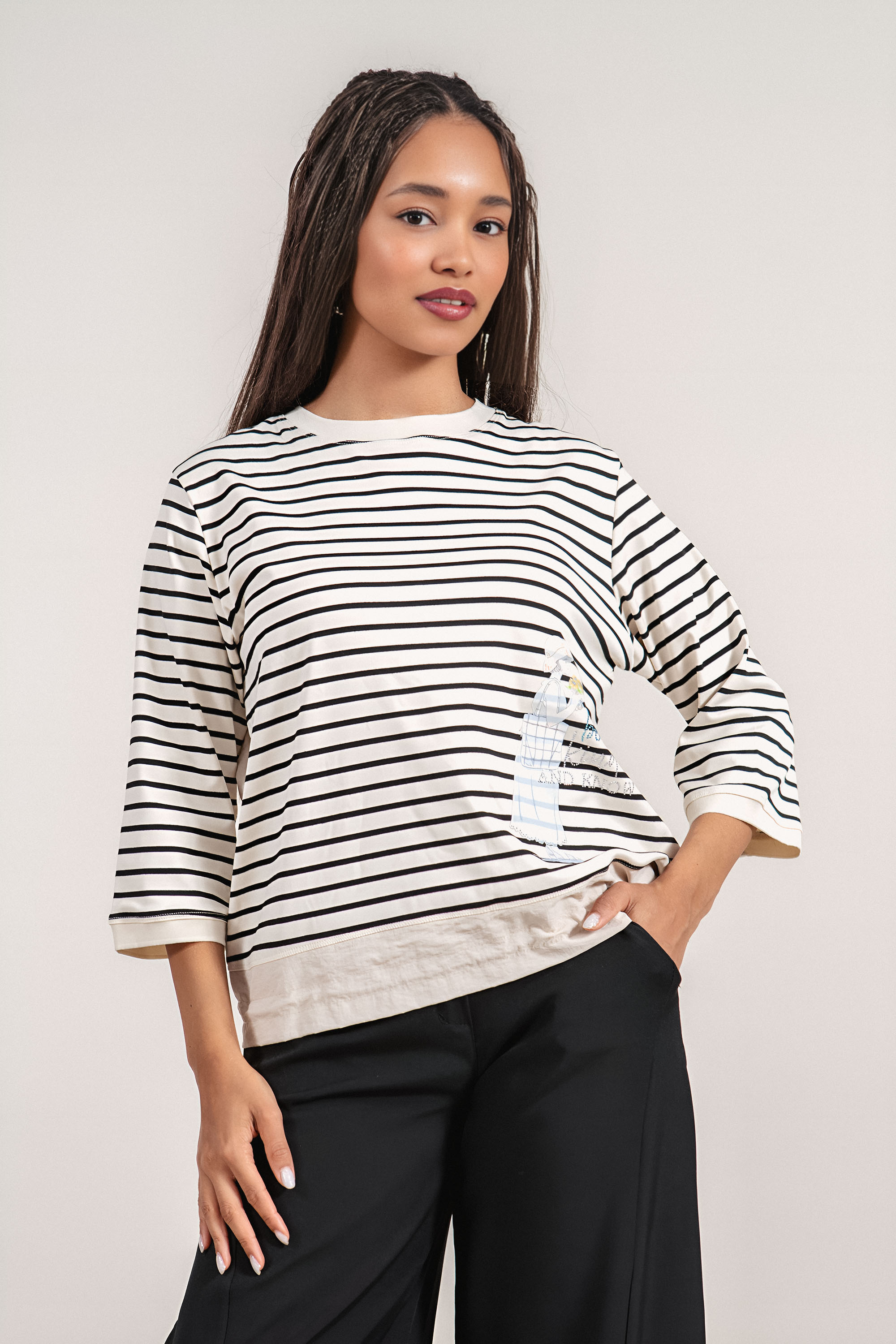 Дамска туника в цвят екрю с черно райе, 7/8 ръкави и декоративна щампа