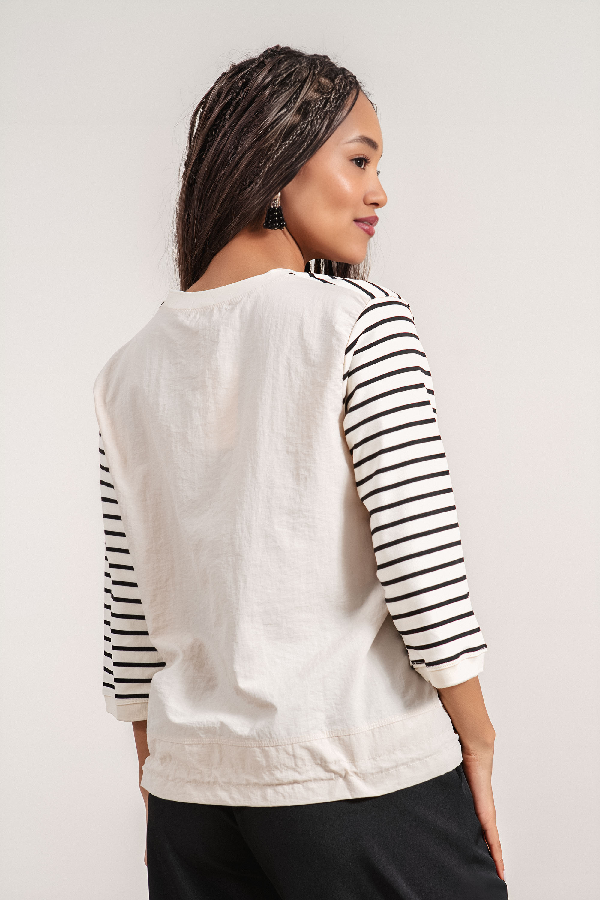 Стилна туника с модерно градско излъчване, създадена за динамичното ежедневие. Изработена от комфортно трико с високо съдържание на памук, тя осигурява мекота и удобство при носене. Хоризонталното райе в черно придава характер, а щампата с деликатни камъни добавя фин блясък и индивидуалност. Моделът с 7/8 ръкав и регулируема връзка в долната част позволява лесно адаптиране към различни визии.