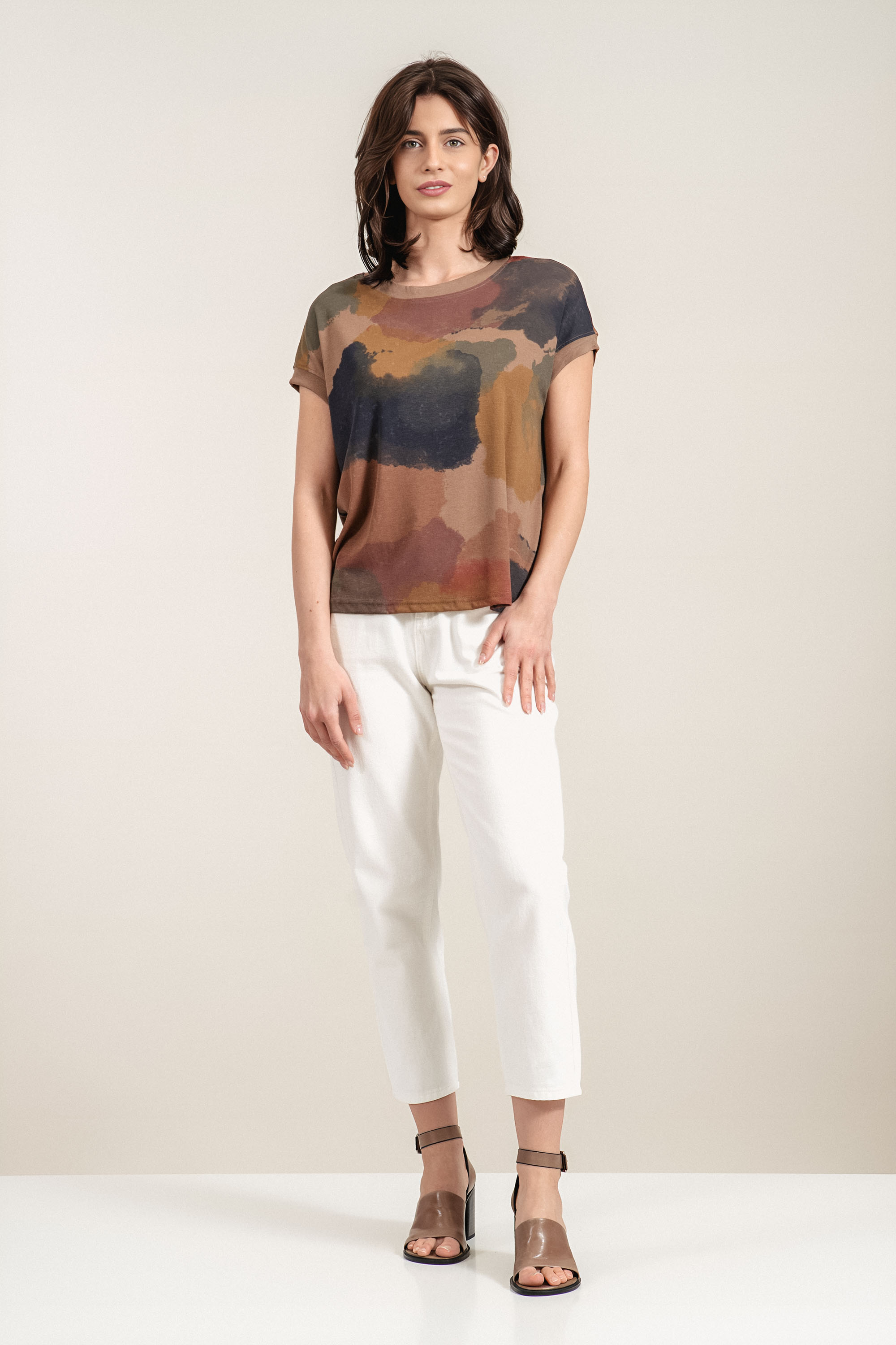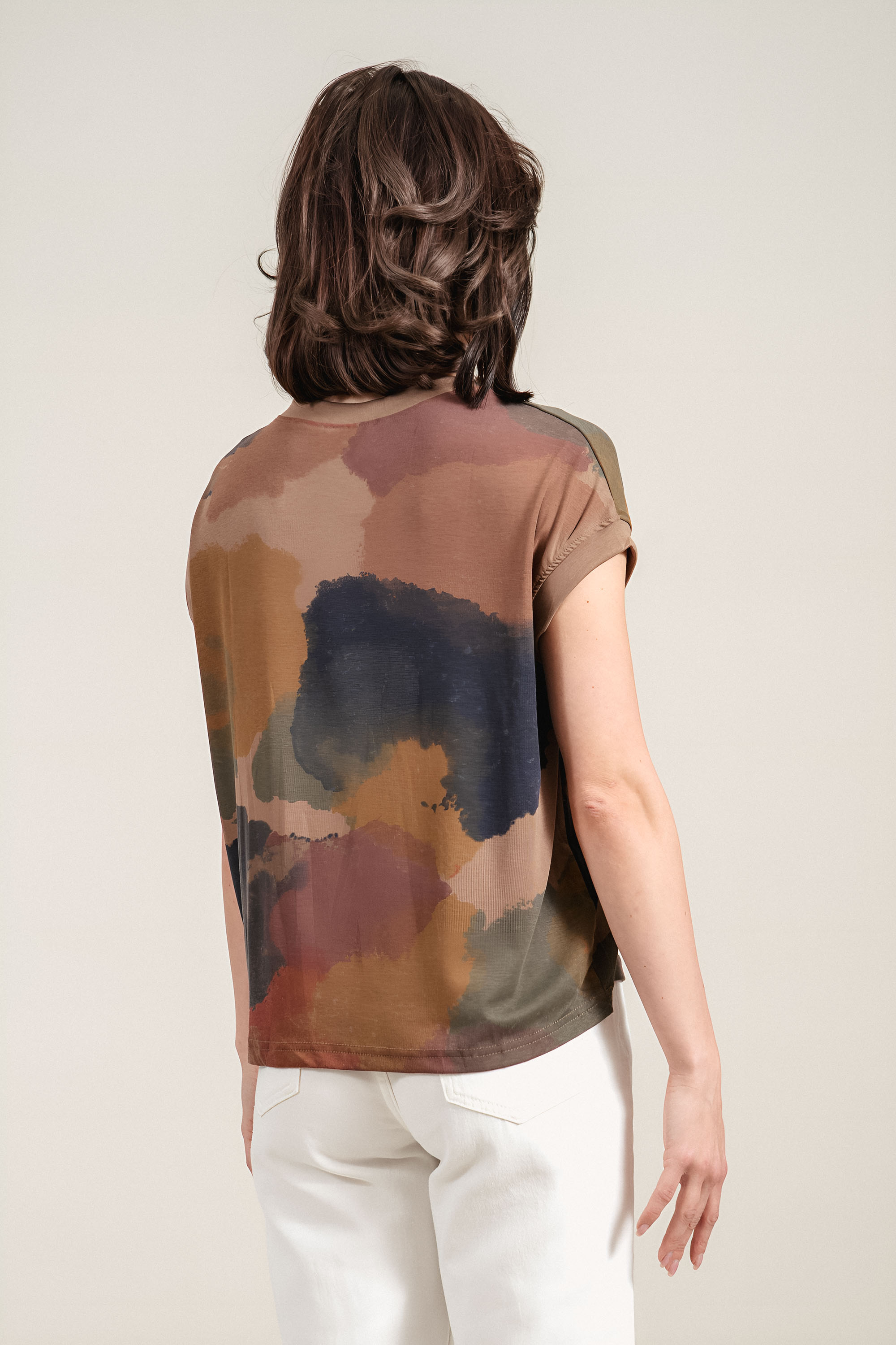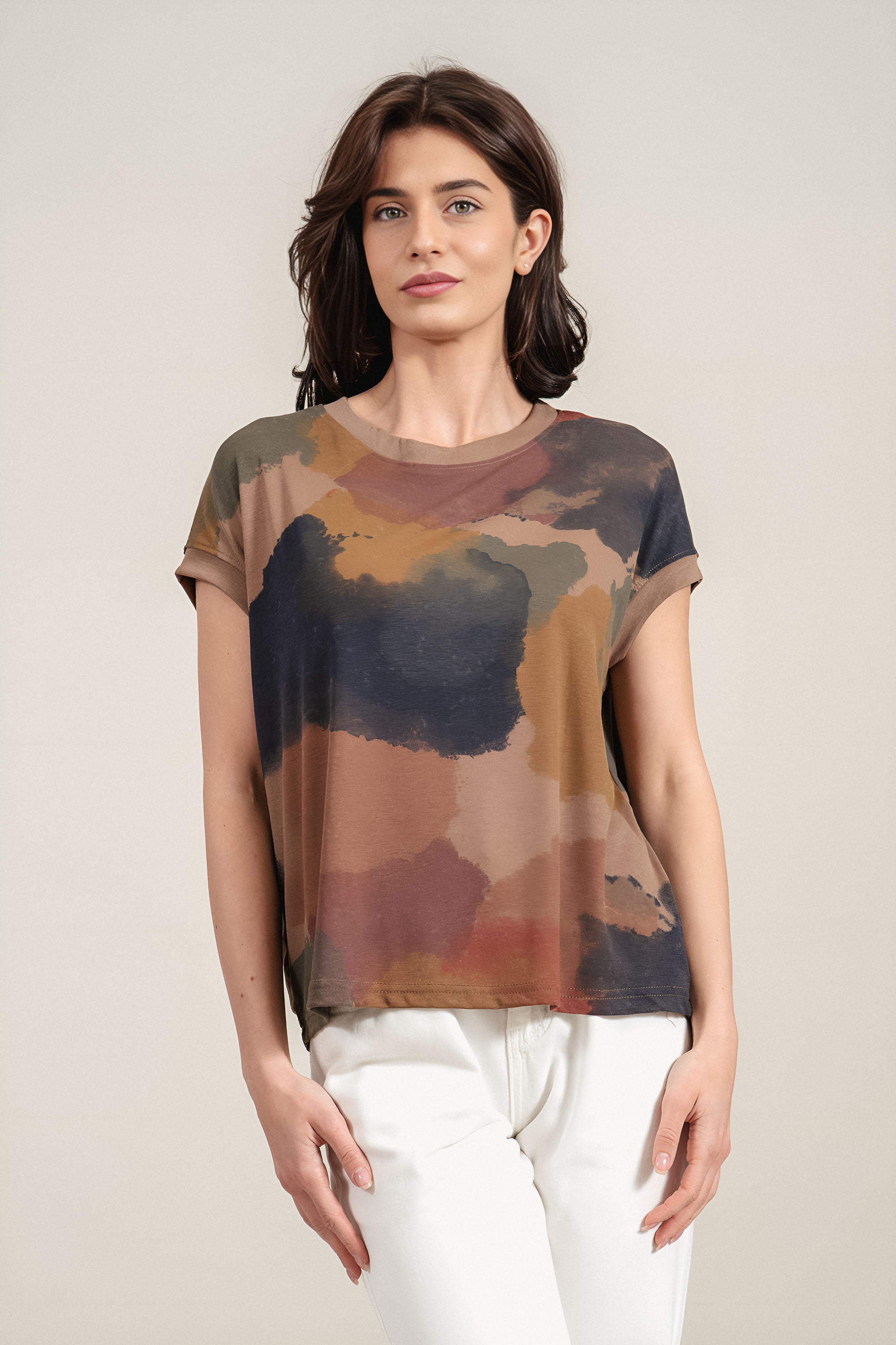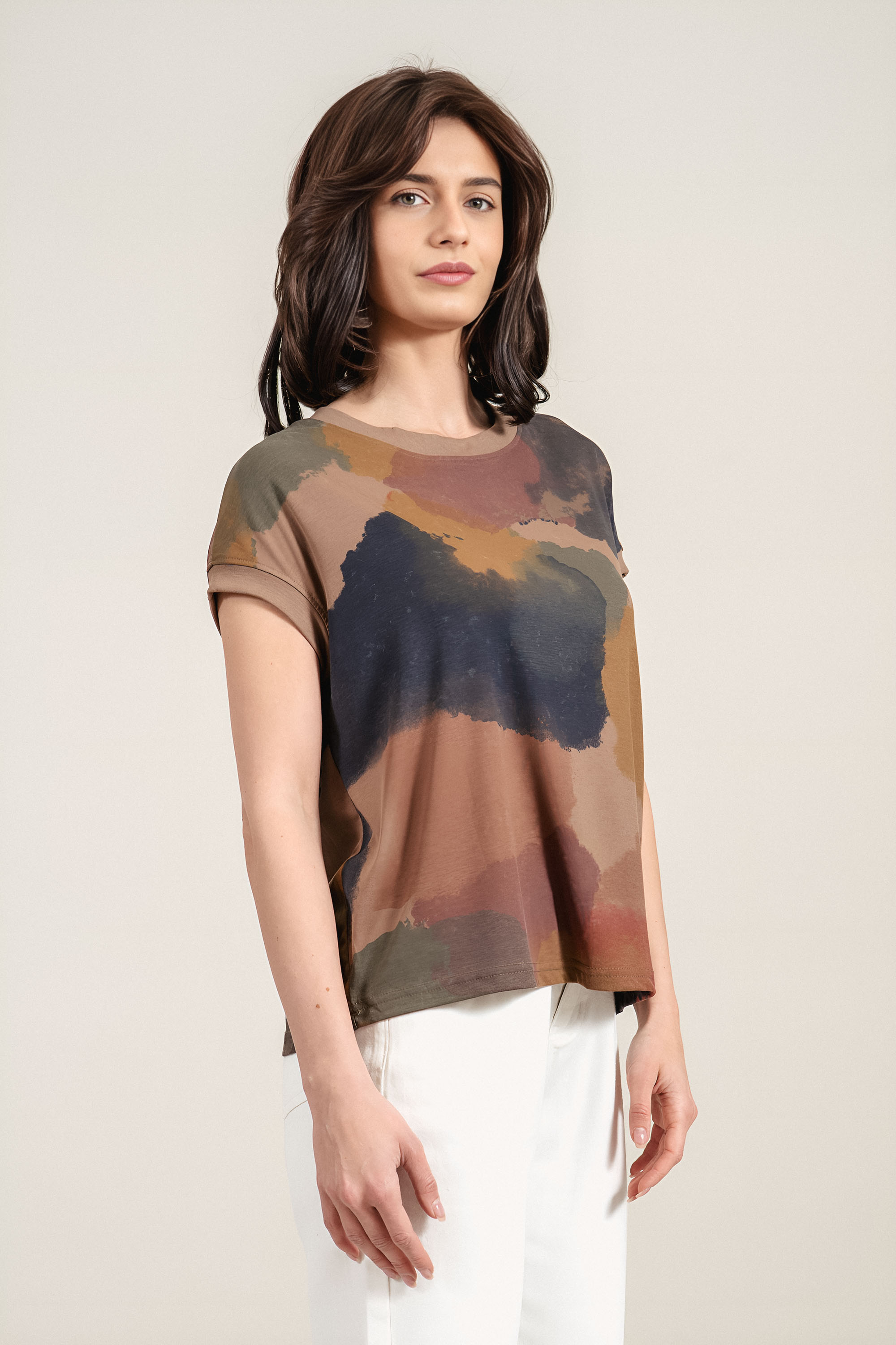 Дамска б;уза с впечатляващ абстрактен принт, който придава артистичен характер на визията. Материята е мека и приятна на допир, като съчетава комфорт и добра издръжливост. Свободната кройка осигурява лекота и удобство при носене през целия ден. Моделът е подходящ за модерни ежедневни комбинации с изчистени долни части.