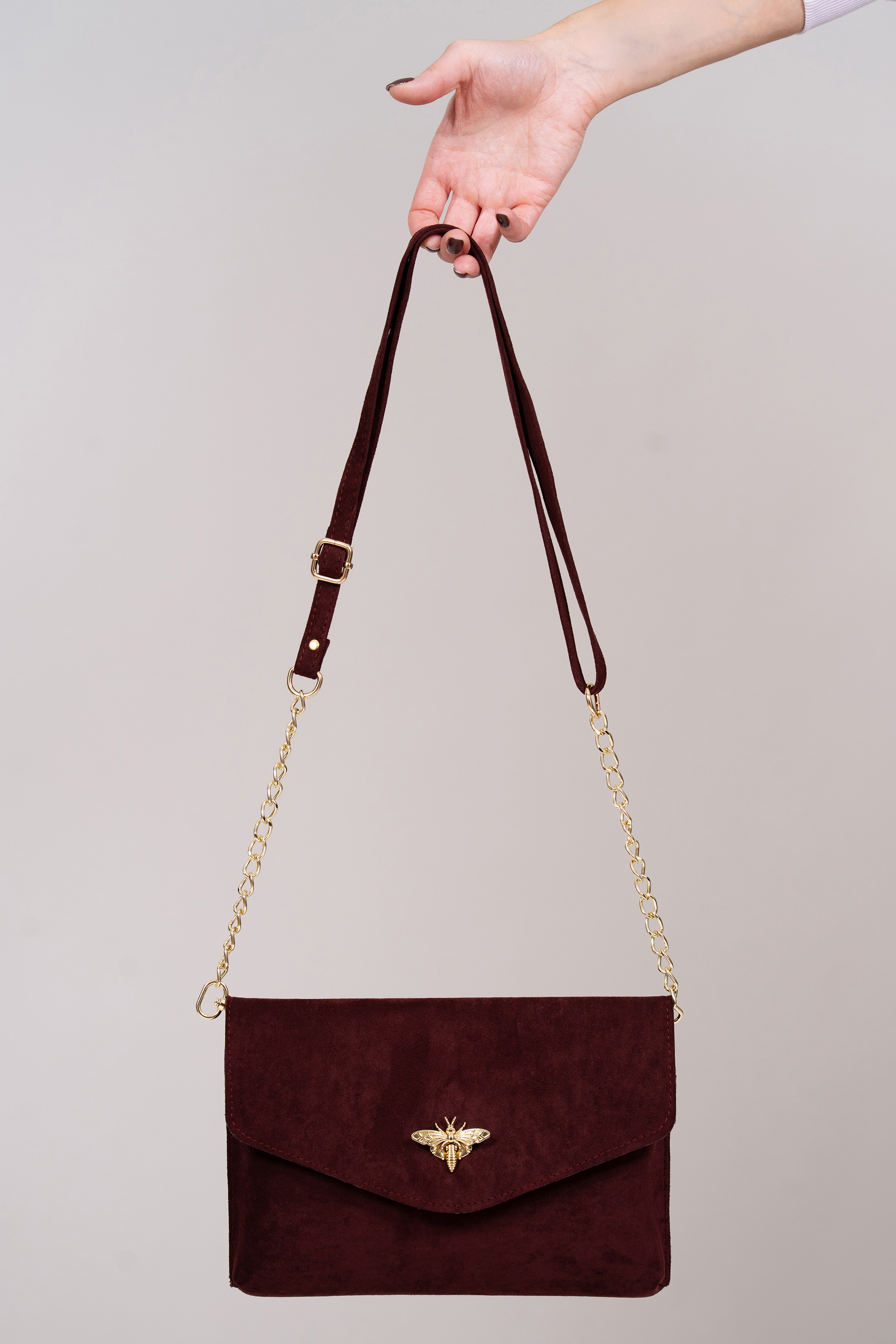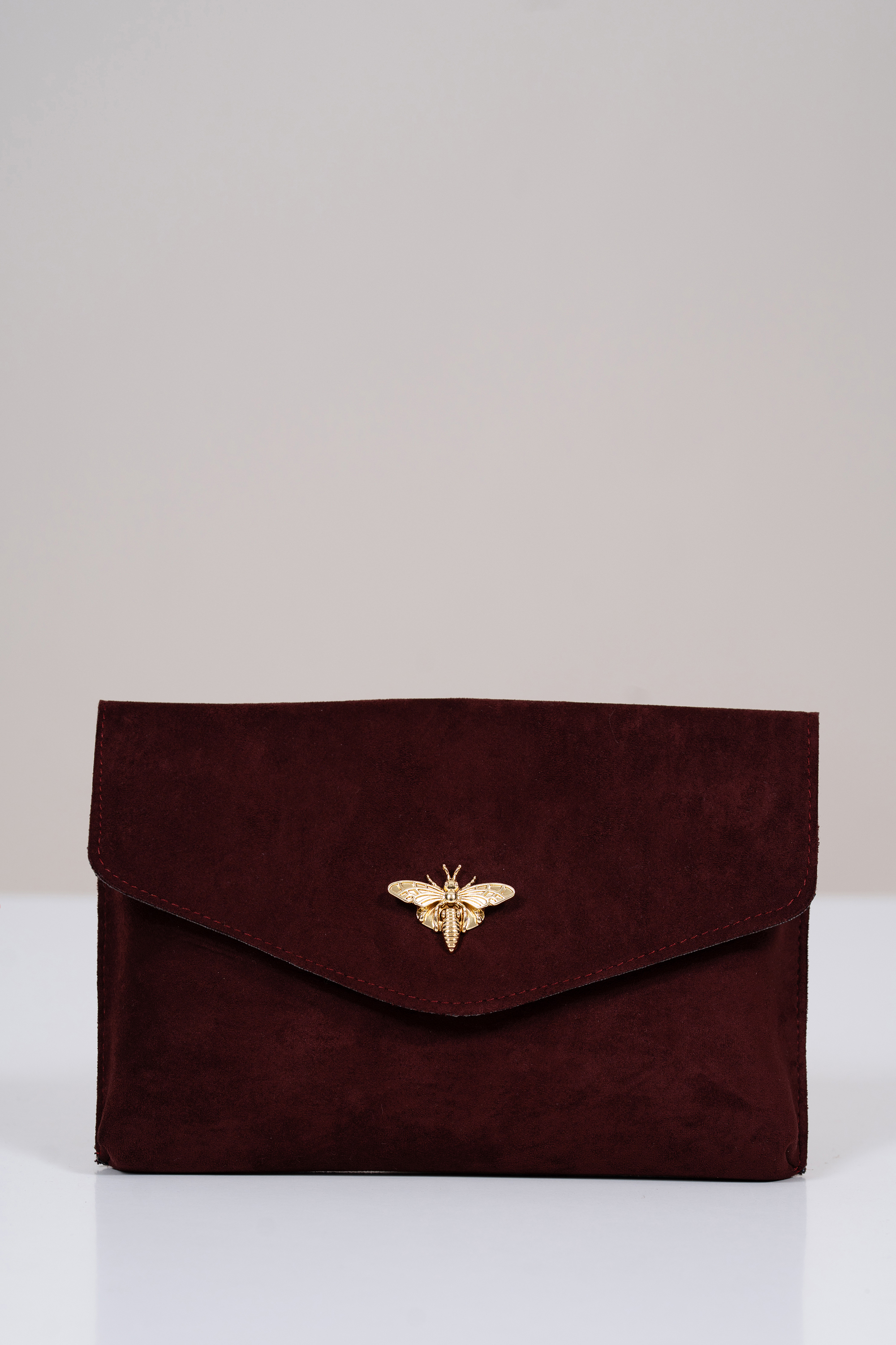 Стилна и женствена, тази чанта тип клъч от еко велур в цвят бордо е отличен избор за елегантни визии. Златистата закопчалка с пчела добавя изискан акцент, който придава индивидуалност и характер. Подходяща както за официални поводи, така и за ежедневна елегантност. Лекотата и класическият цвят я правят лесна за комбиниране.