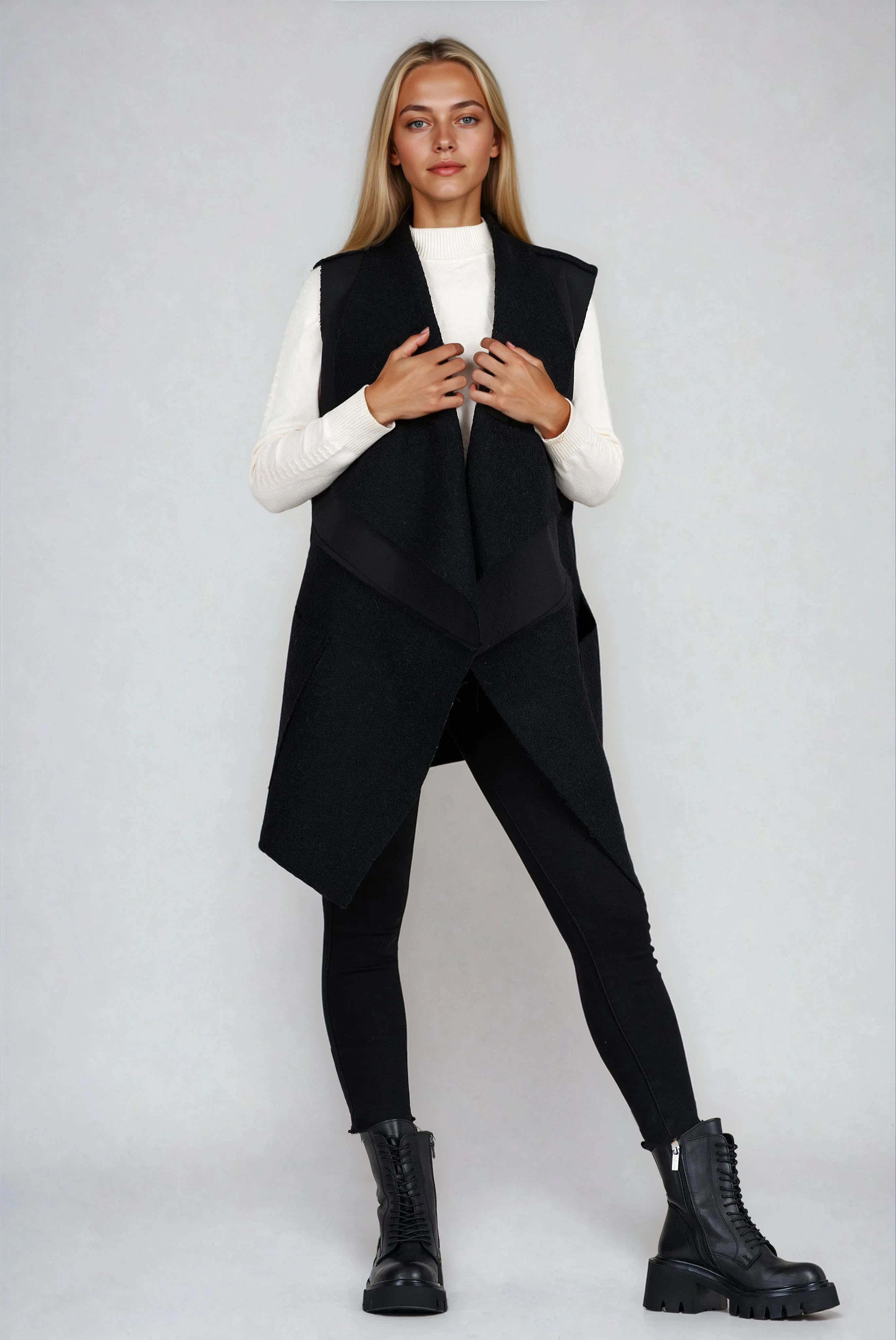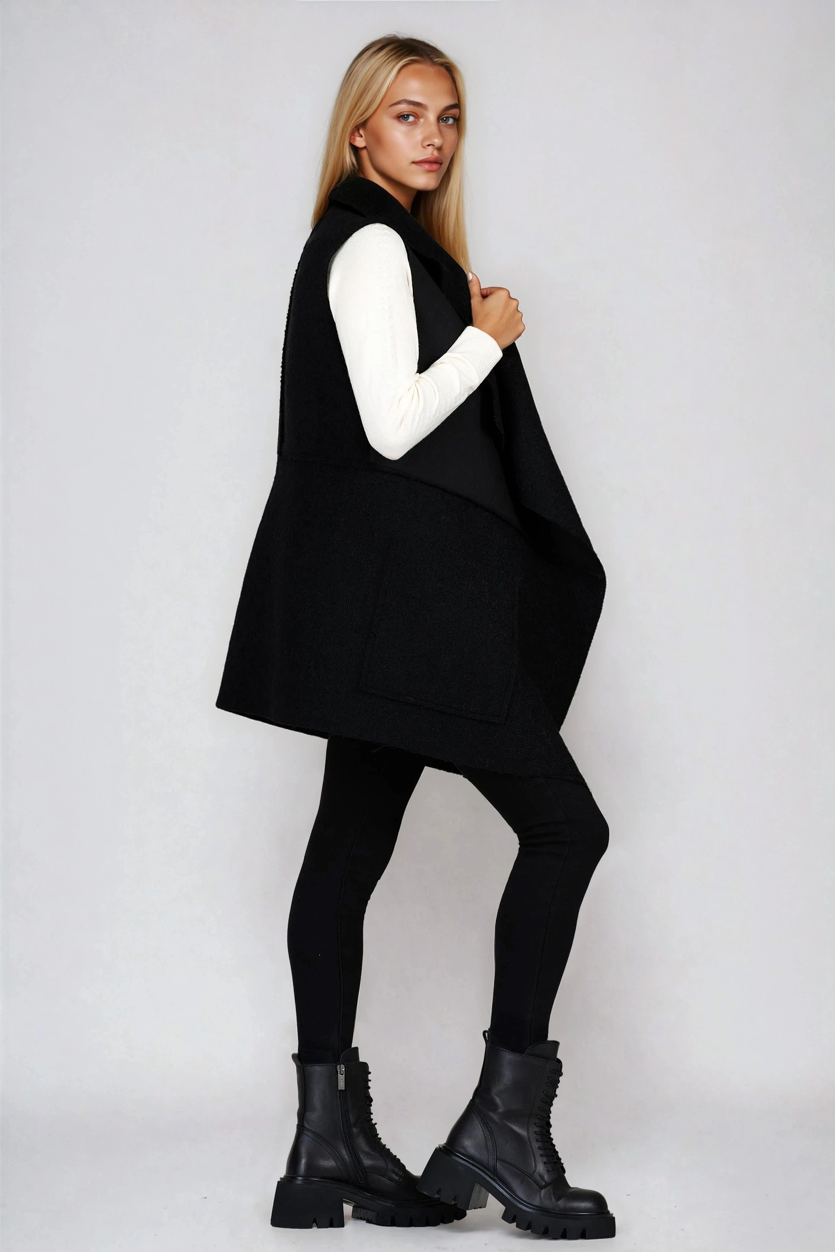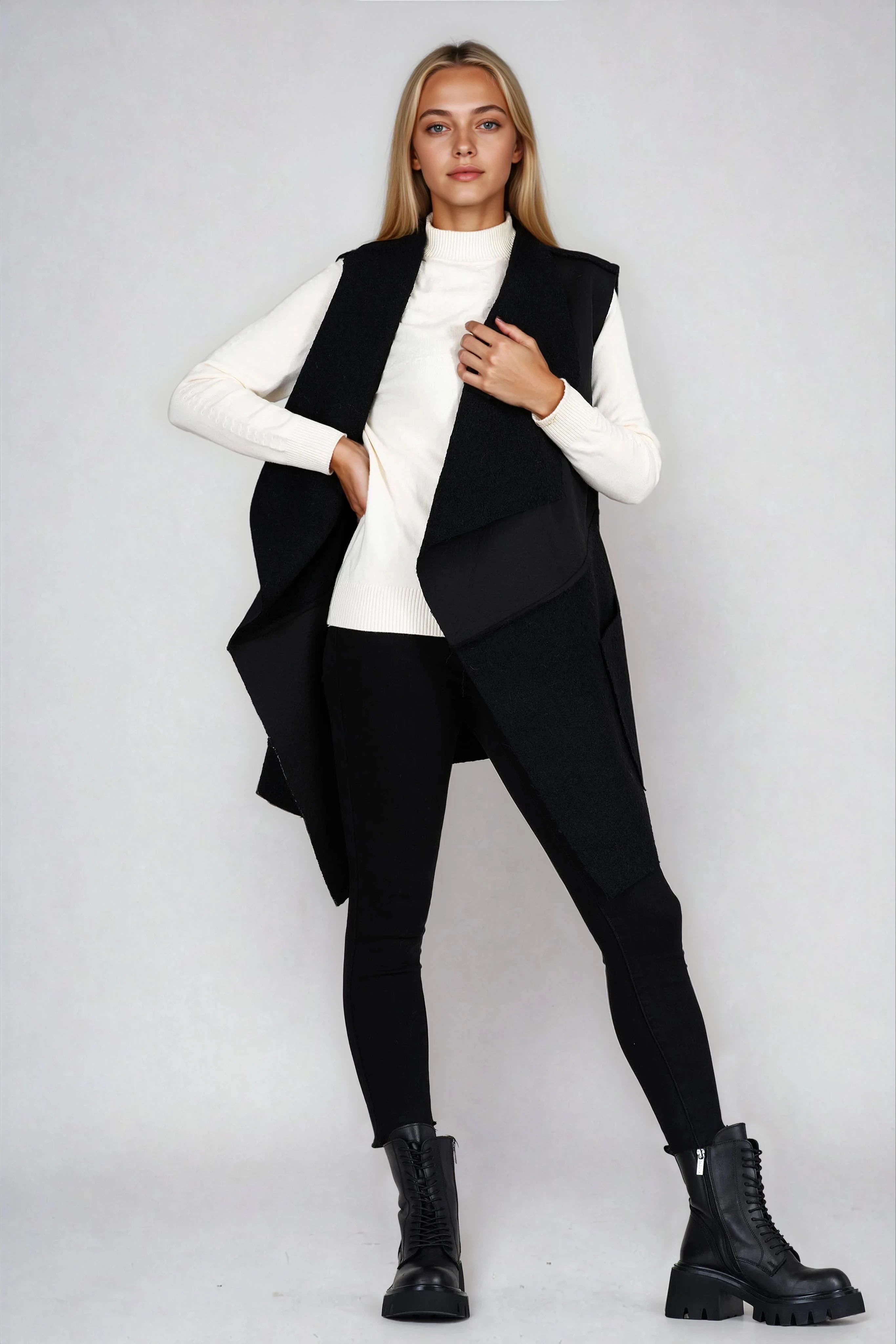 Елегантен елек с класическа асиметрична дължина, изработен от гладка и релефна материя. Реверът придава завършеност на визията, а едноцветният дизайн в черно го прави универсален избор за есенни и зимни съчетания. Без закопчаване, което допринася за усещане за лекота и свобода на движение. Моделът е подходящ както за ежедневно носене, така и за по-официални поводи.