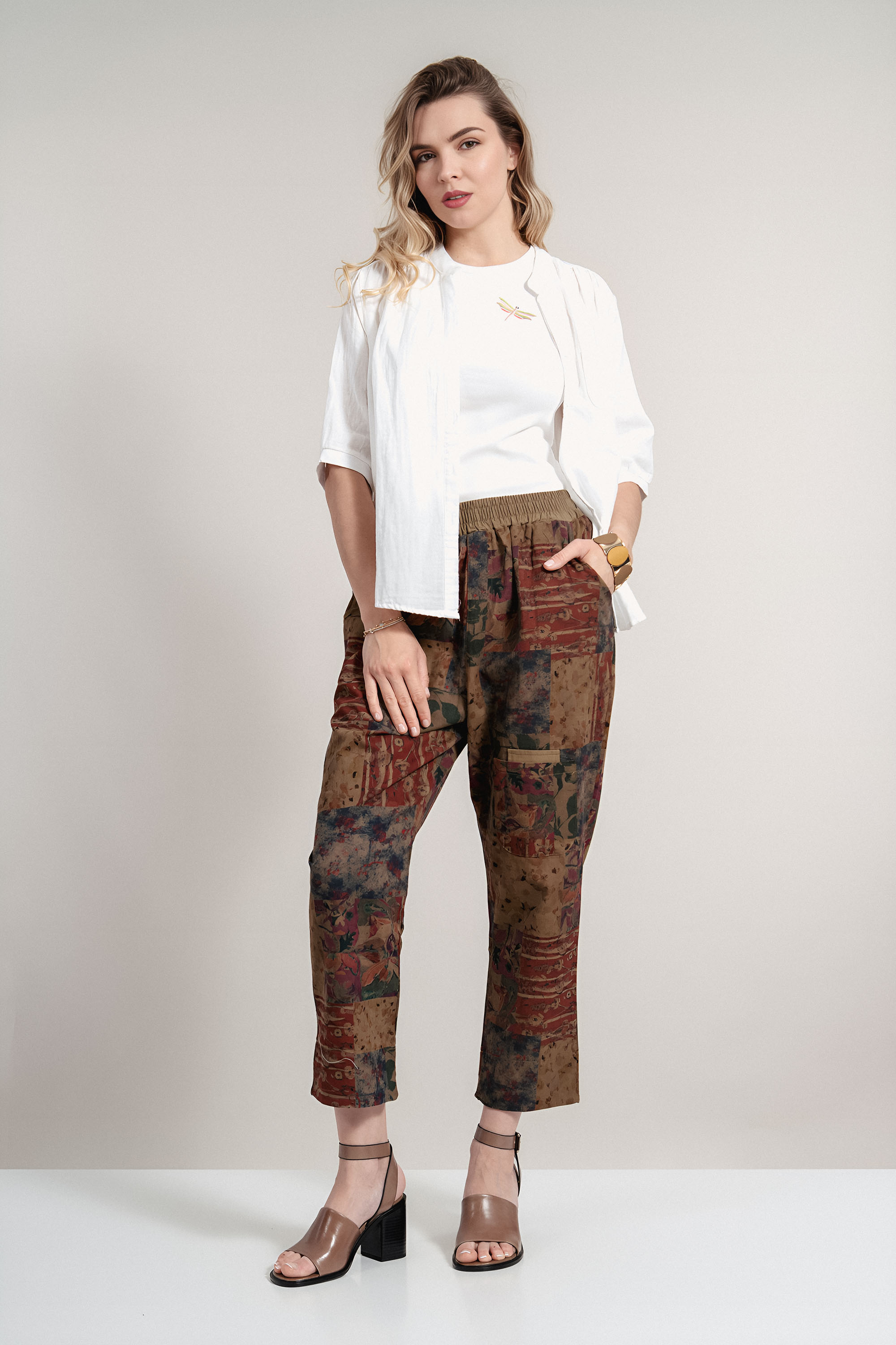 Панталони с артистичен принт в зелено и топли тонове, изработени от мек и дишащ памук. Свободната кройка и еластичната талия осигуряват комфорт през целия ден. Моделът разполага с практични джобове и декоративни детайли, които подчертават индивидуалния стил. Перфектни за пролетно-летния сезон.