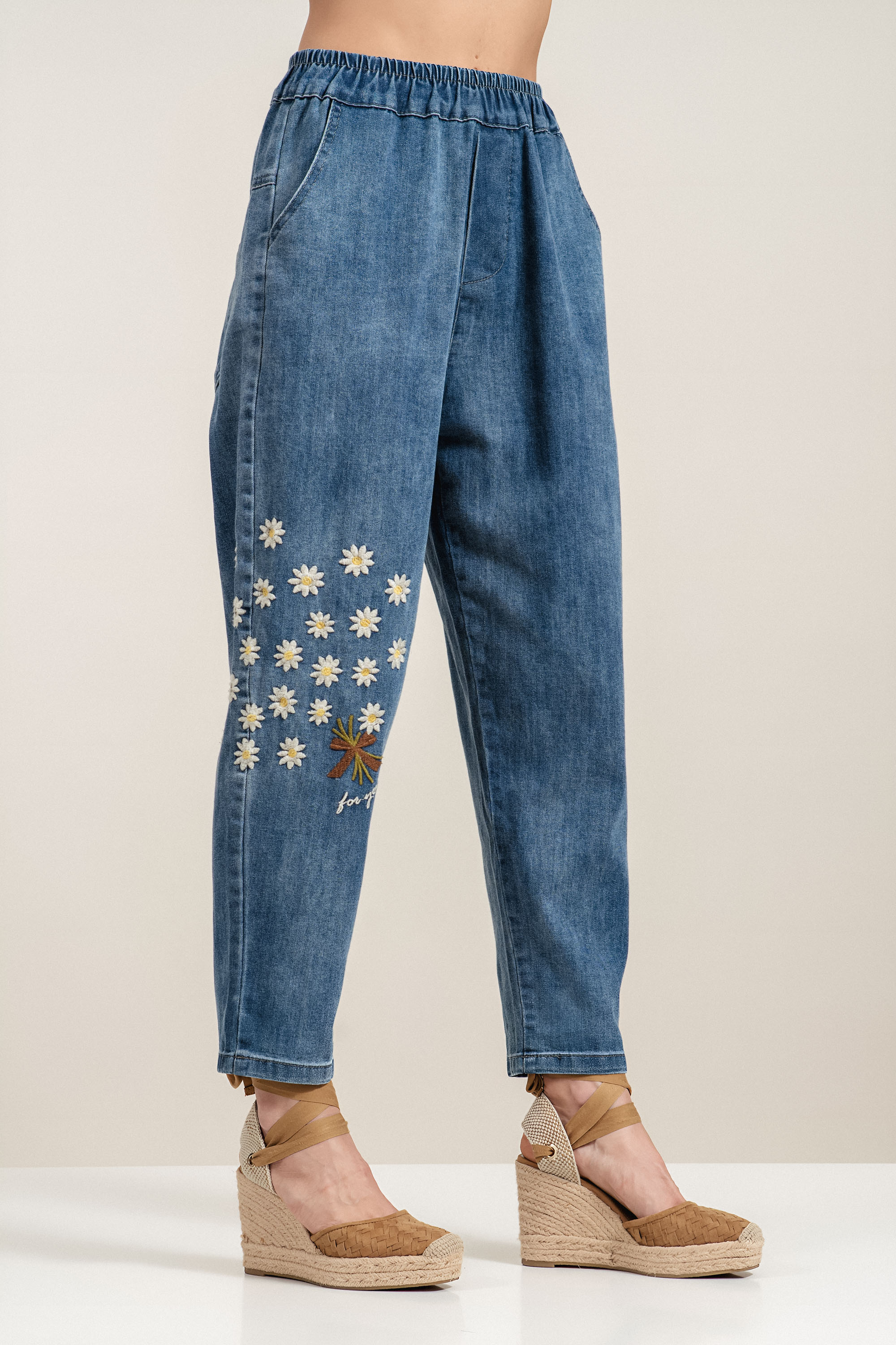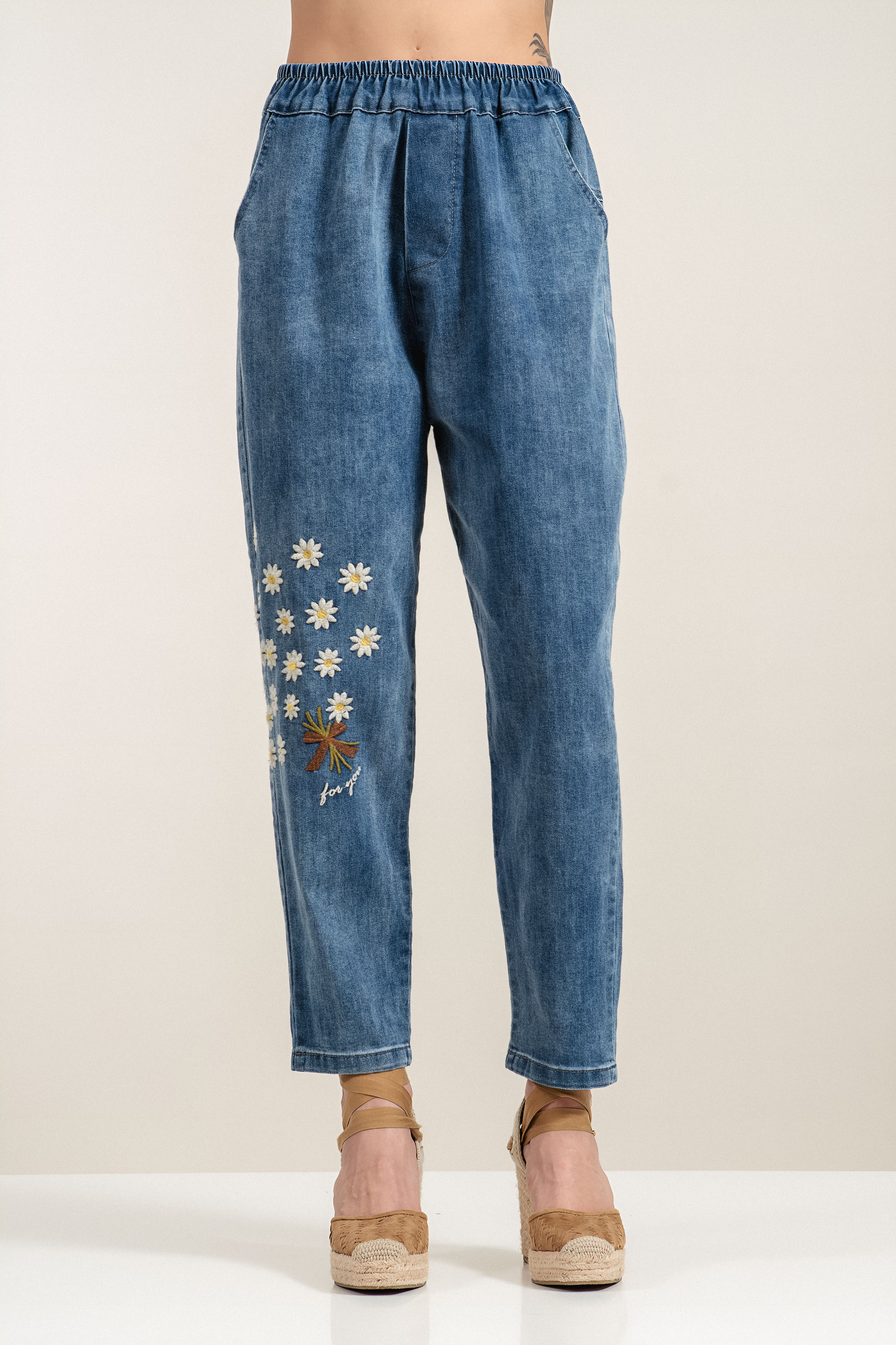 Дамски дънки от памук в син деним с ластик на талията и бродирани цветя
