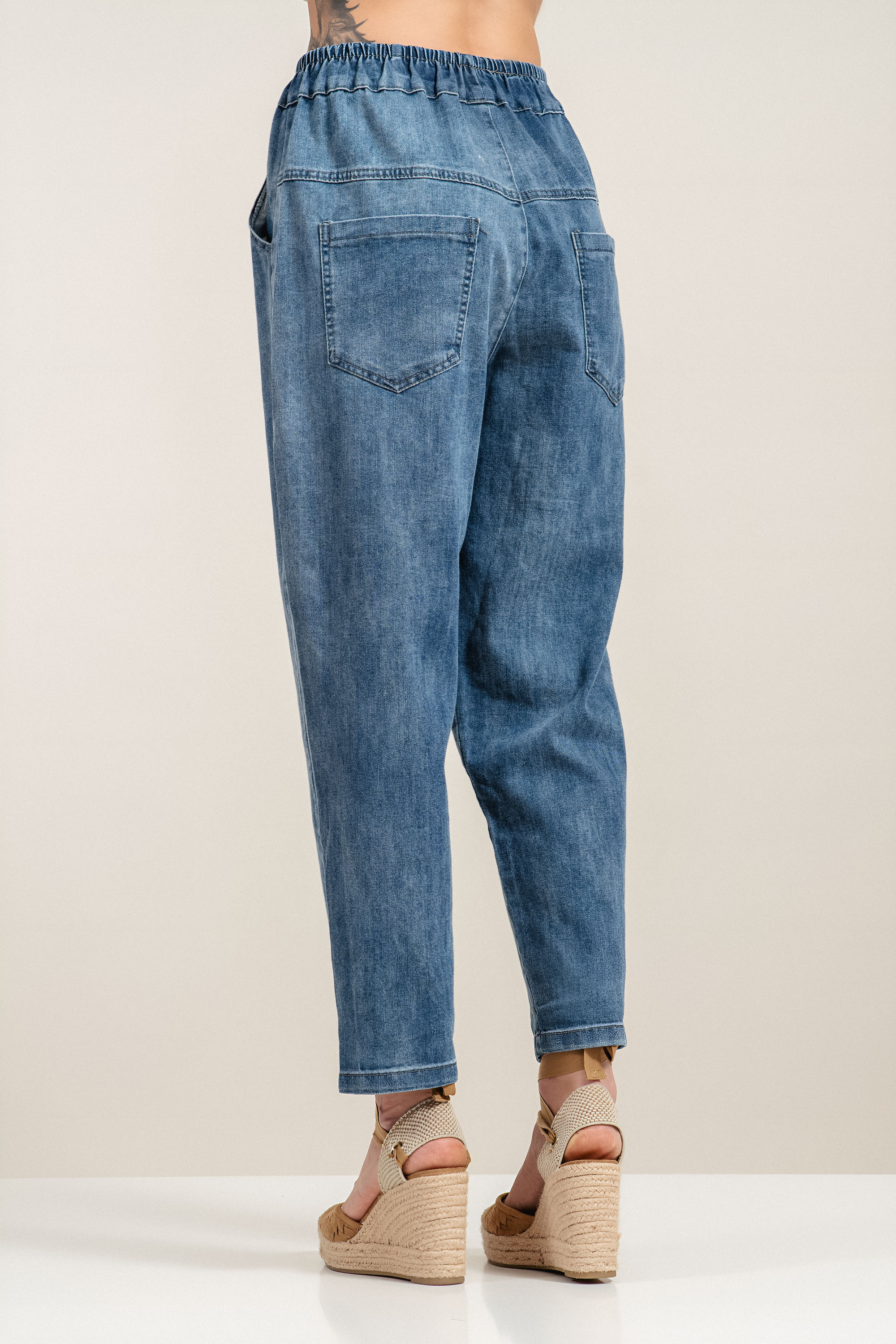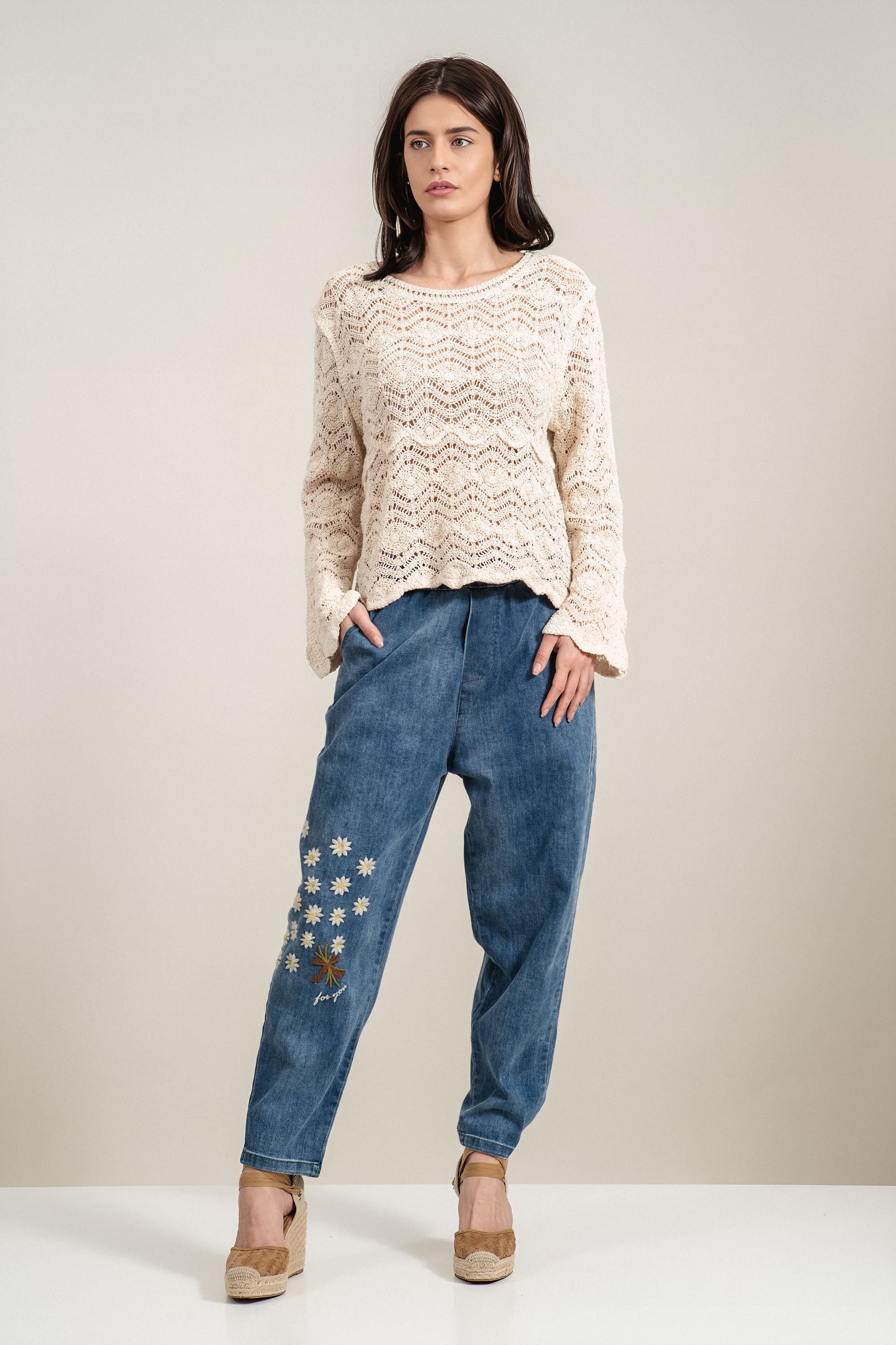 Свеж и отличителен модел дънки в син деним с артистичен акцент. Ластикът в талията осигурява комфорт и лесно прилягане, а свободната кройка гарантира удобство при движение. Декоративните бродирани цветя придават женствен и разпознаваем характер на визията. Подходящ избор за ежедневни комбинации с модерен и леко романтичен стил.