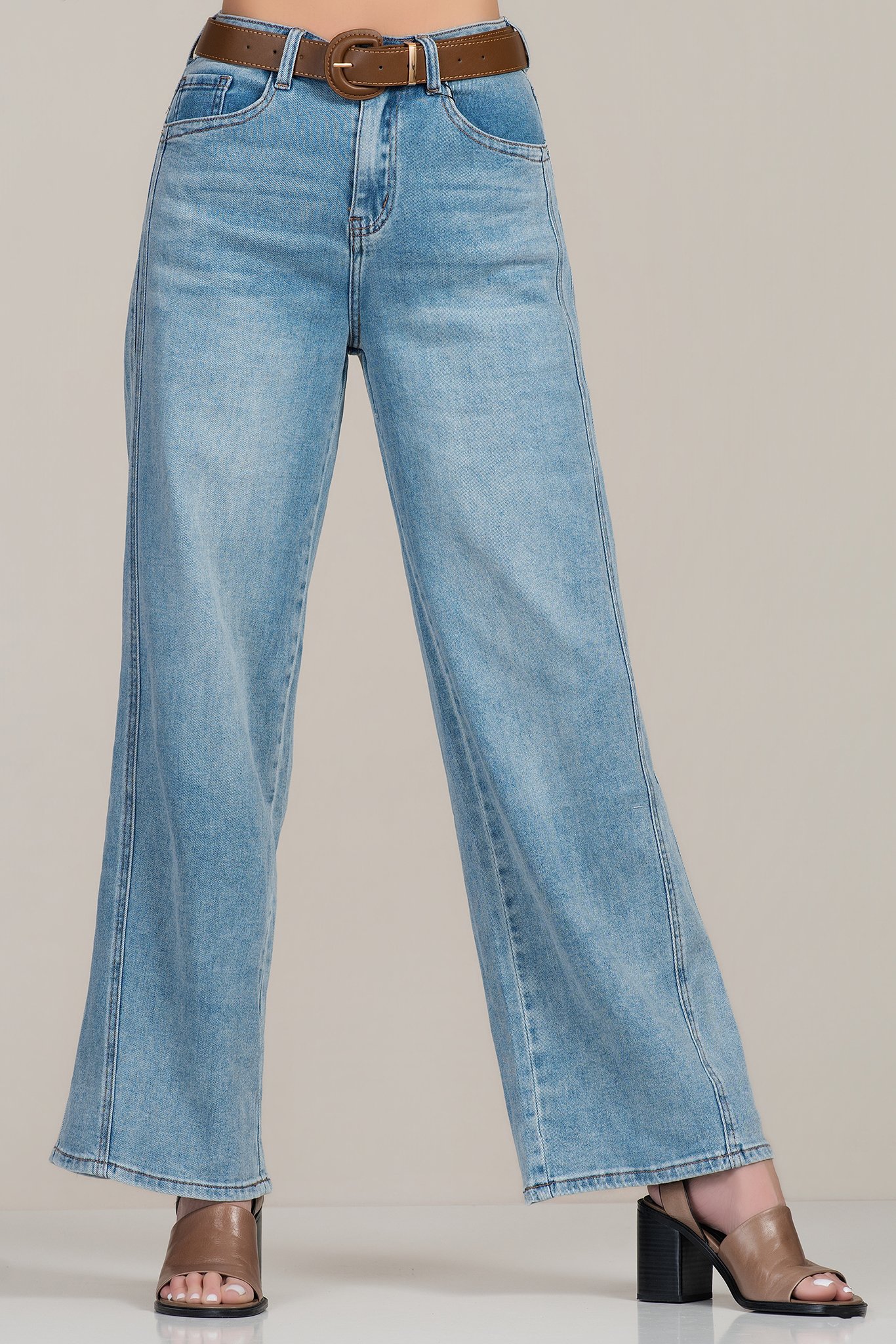Дамски дънки от памук в светлосин деним с широк крачол и висока талия