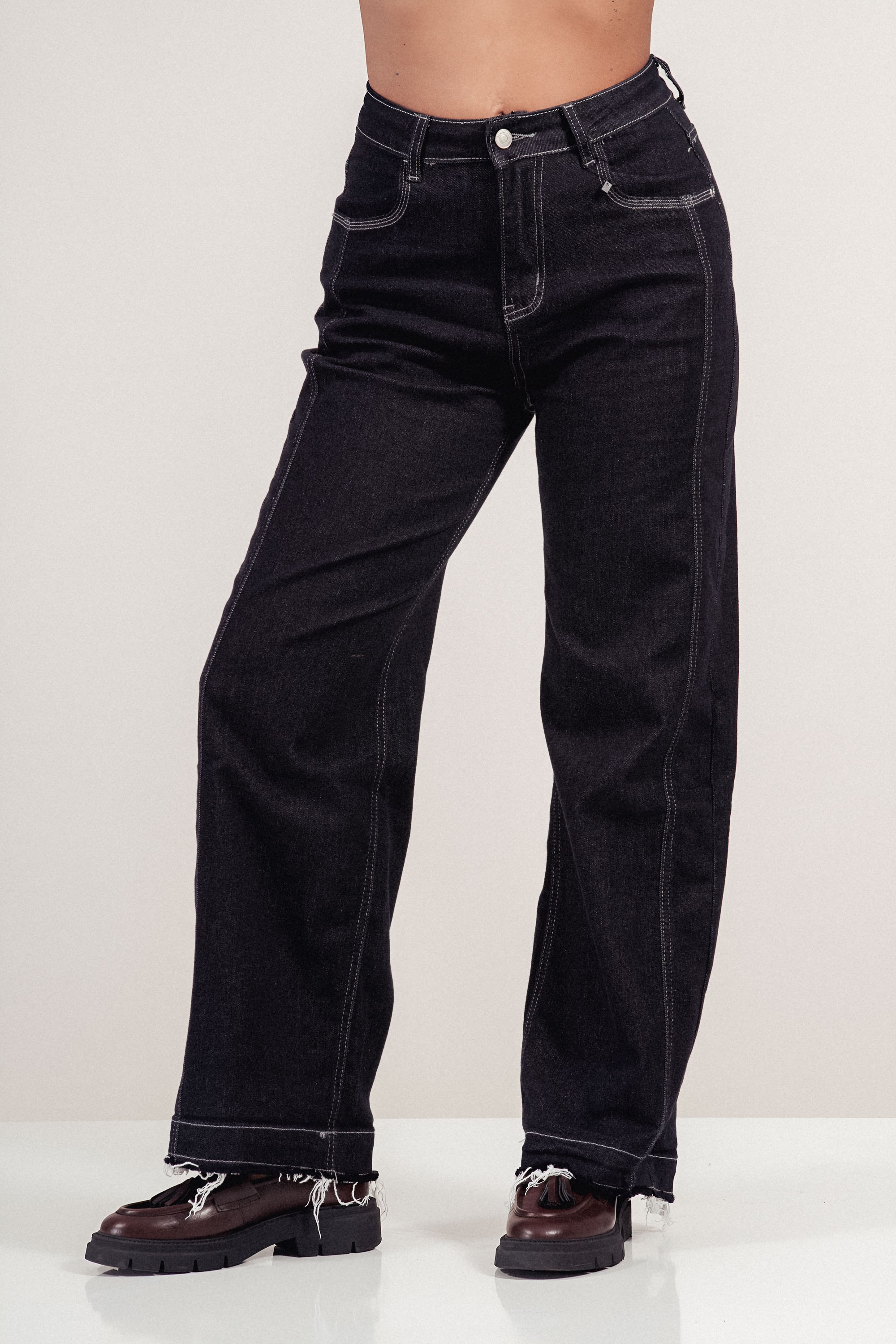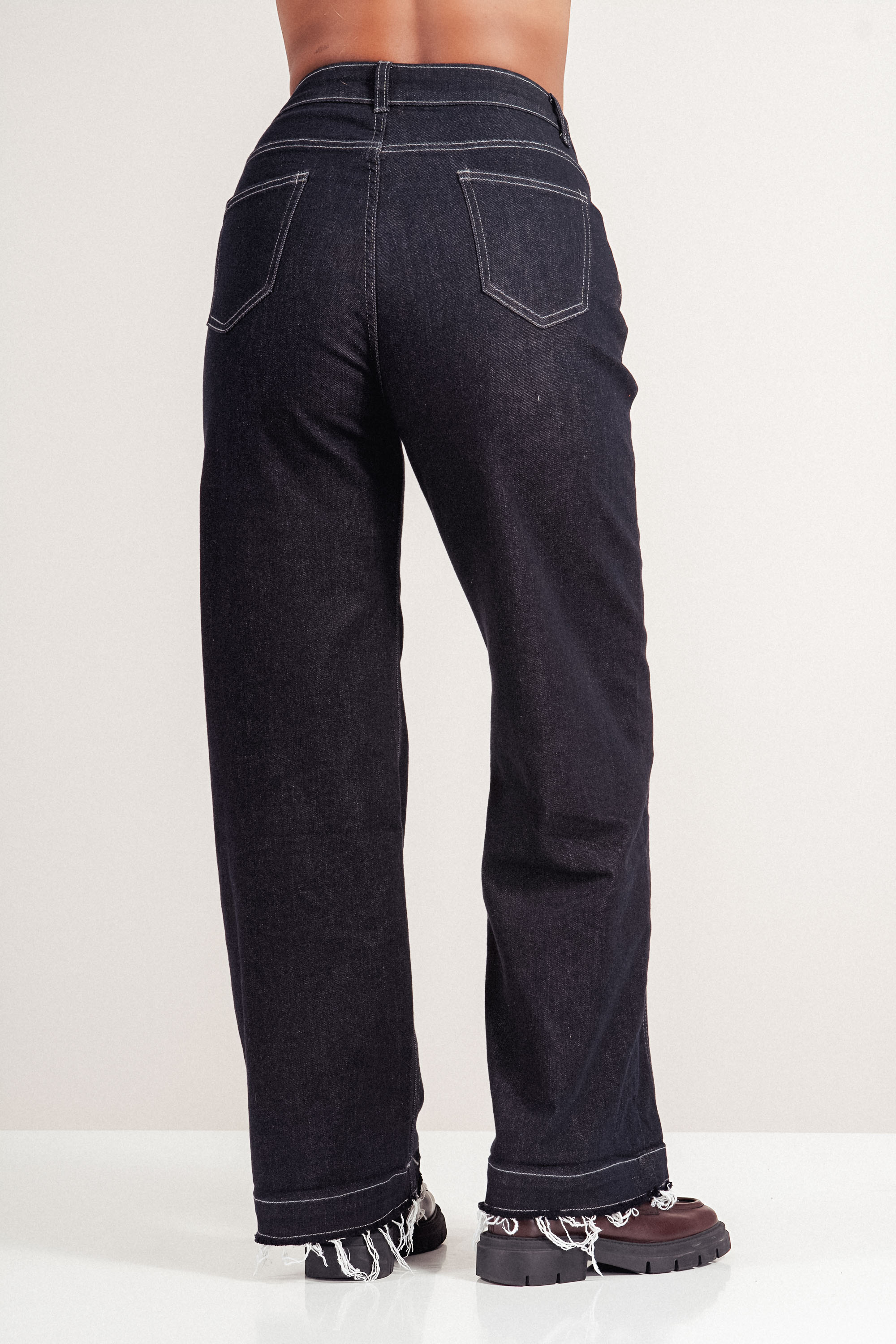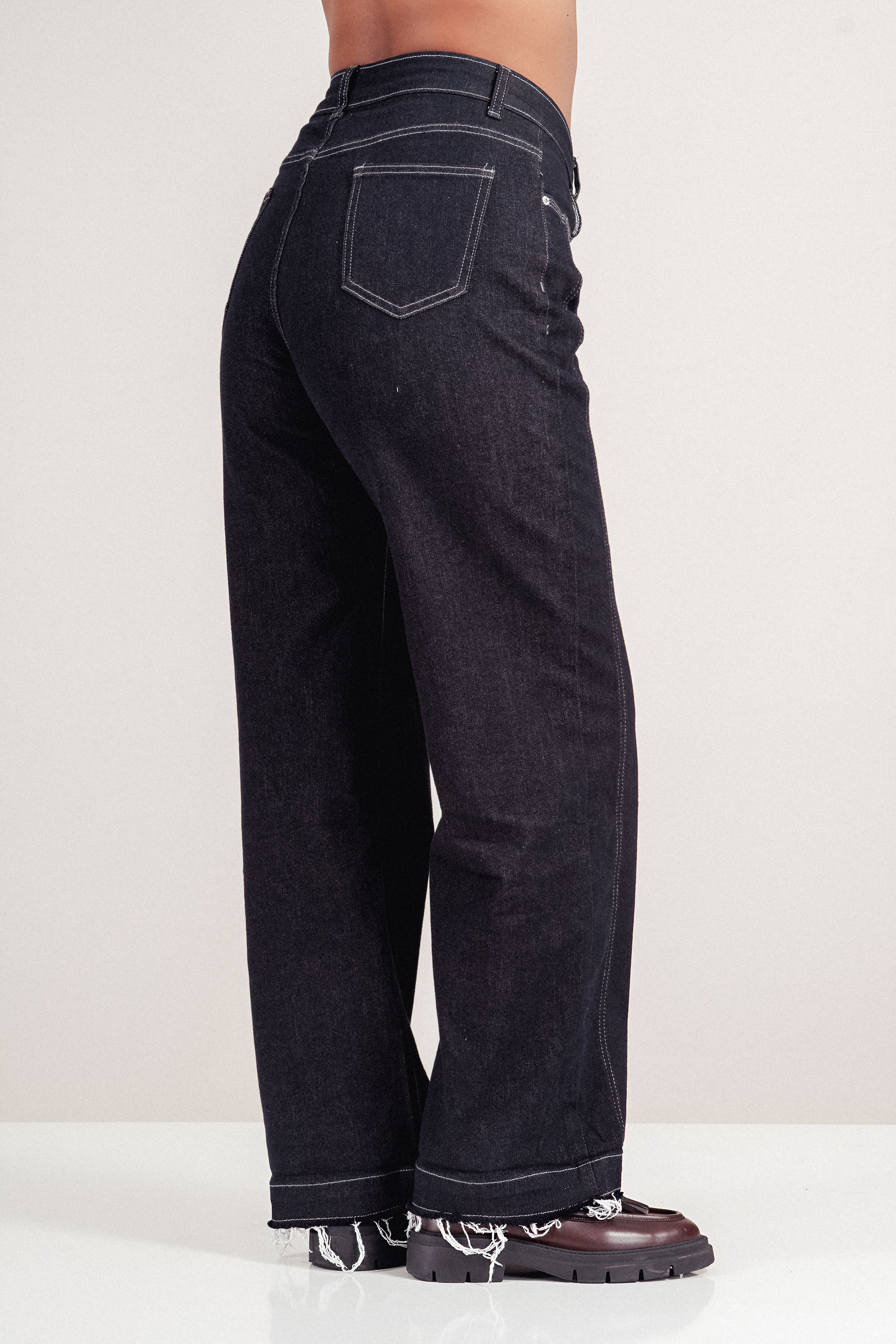 Модел с подчертана индивидуалност и модерен завършек. Широкият крачол и белите накъсани кантове придават характер и свобода на движенията. Памучната материя с еластан осигурява комфорт през целия ден. Предните ръбове визуално издължават краката. Идеален избор за ежедневен или уикенд стайлинг.