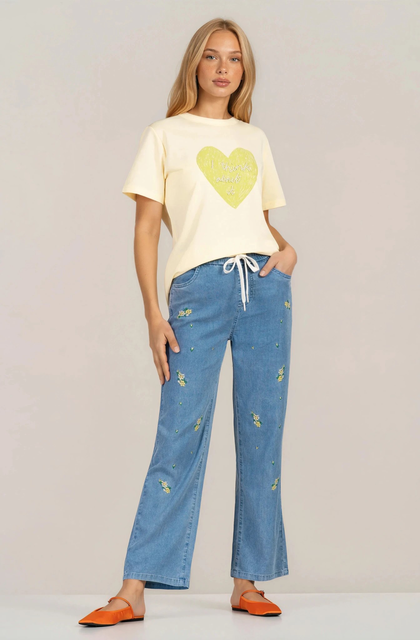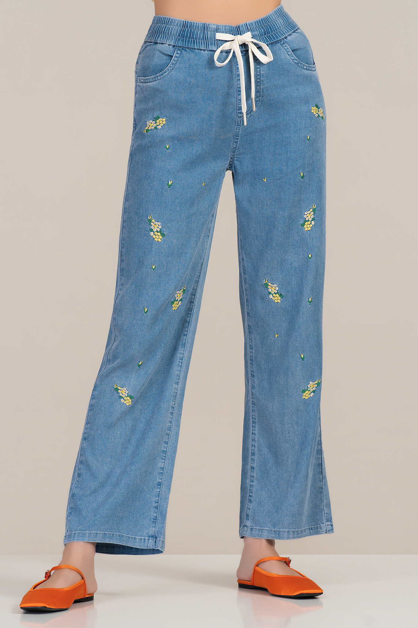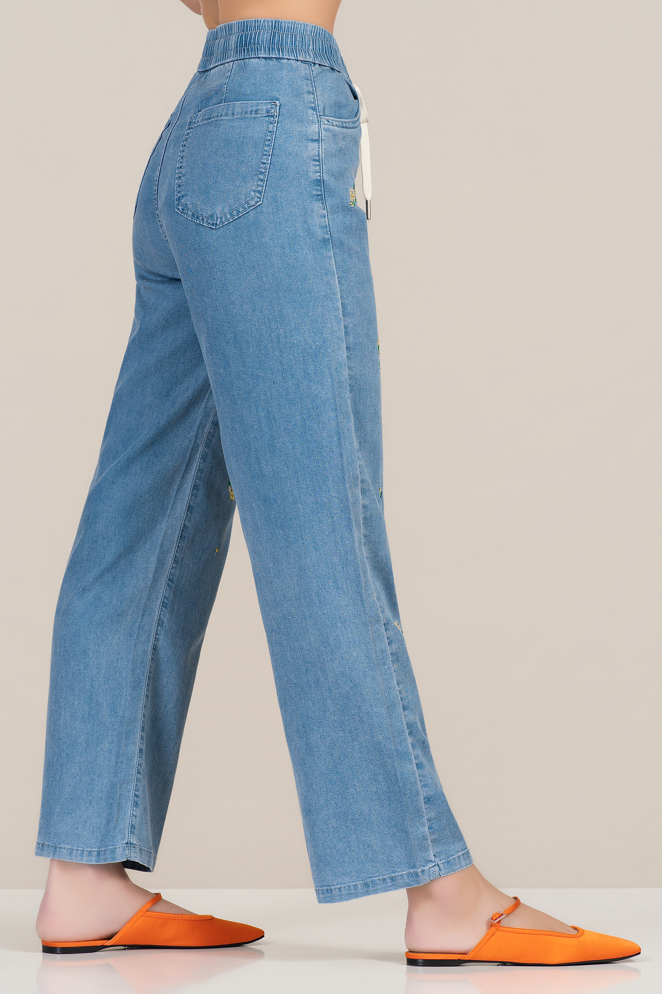 Моделът впечатлява с комфортна кройка и съвременен силует. Меката и тънка деним материя с лиосел осигурява лекота и приятен допир до кожата, подходяща за целодневно носене. Широкият крачол и еластичната талия с връзки гарантират свобода на движение, а фините бродирани мотиви придават деликатна индивидуалност. Идеален избор за ежедневни и уикенд комбинации.